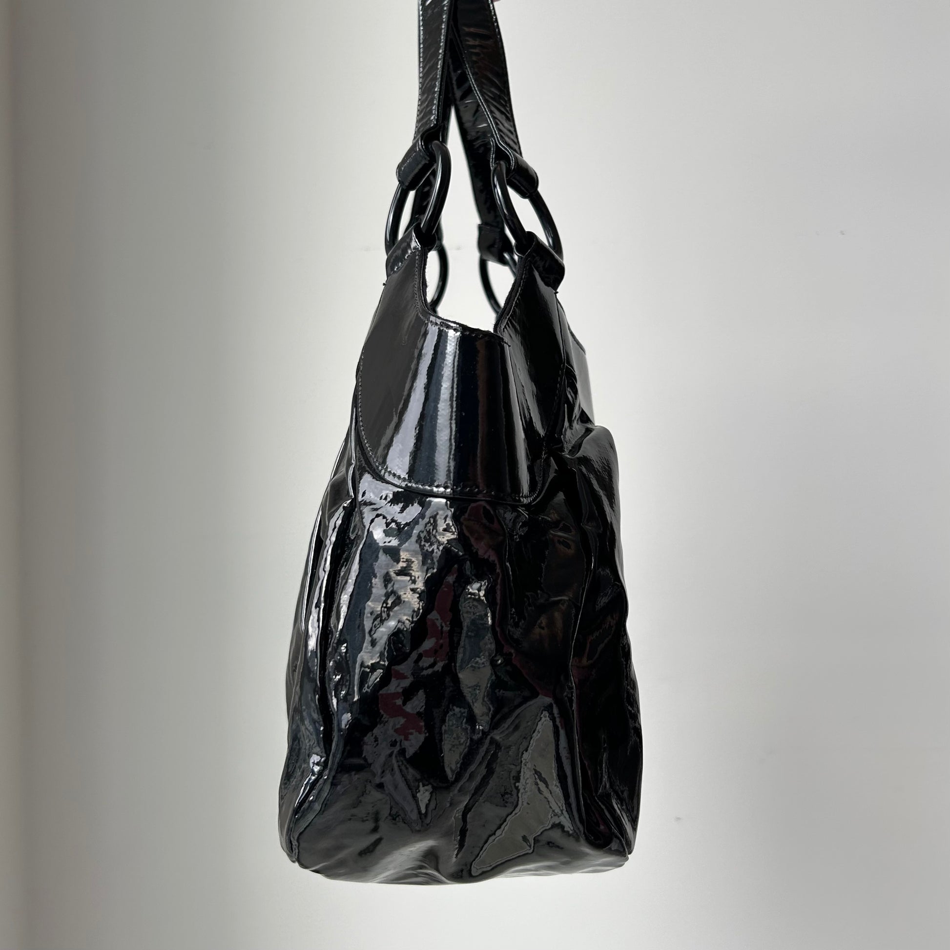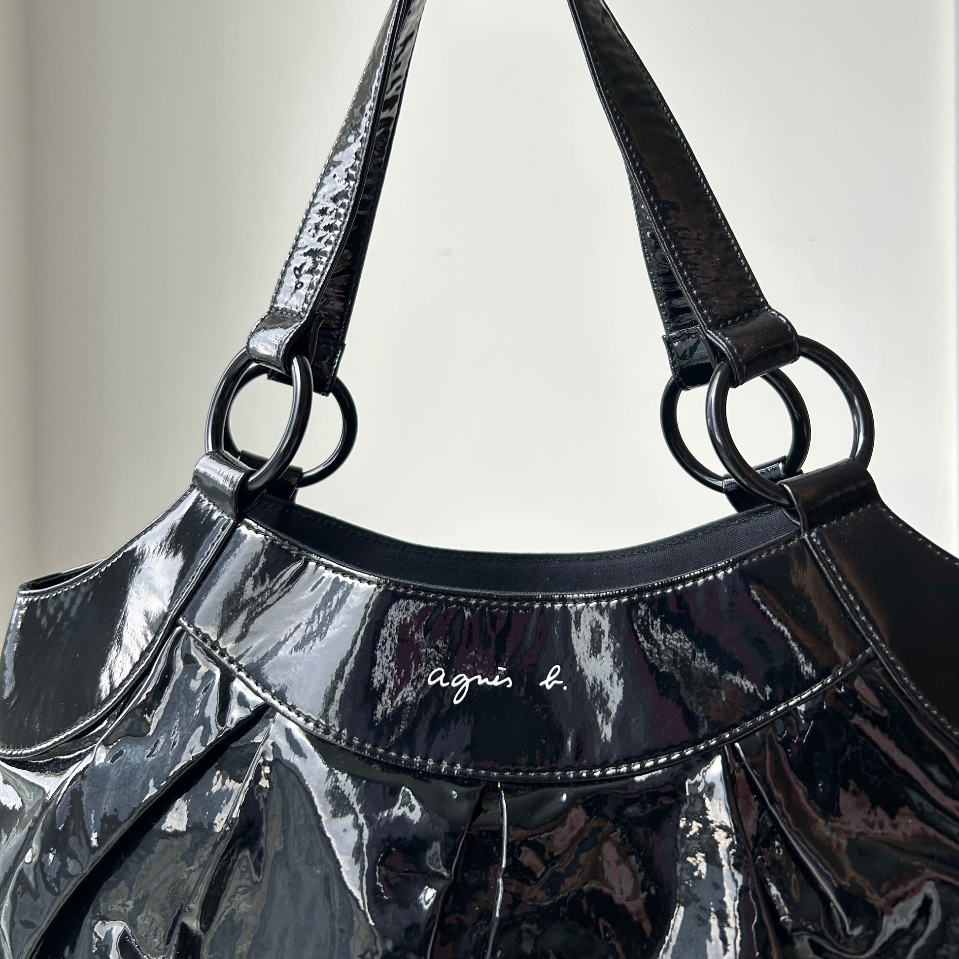 - Details: Glossy black patent shoulder bag with soft pleating. Dual handles with oversized ring hardware. Tonal stitching and subtle embroidered logo at front. Lightweight and roomy, with a magnetic snap closure. Likely faux leather.