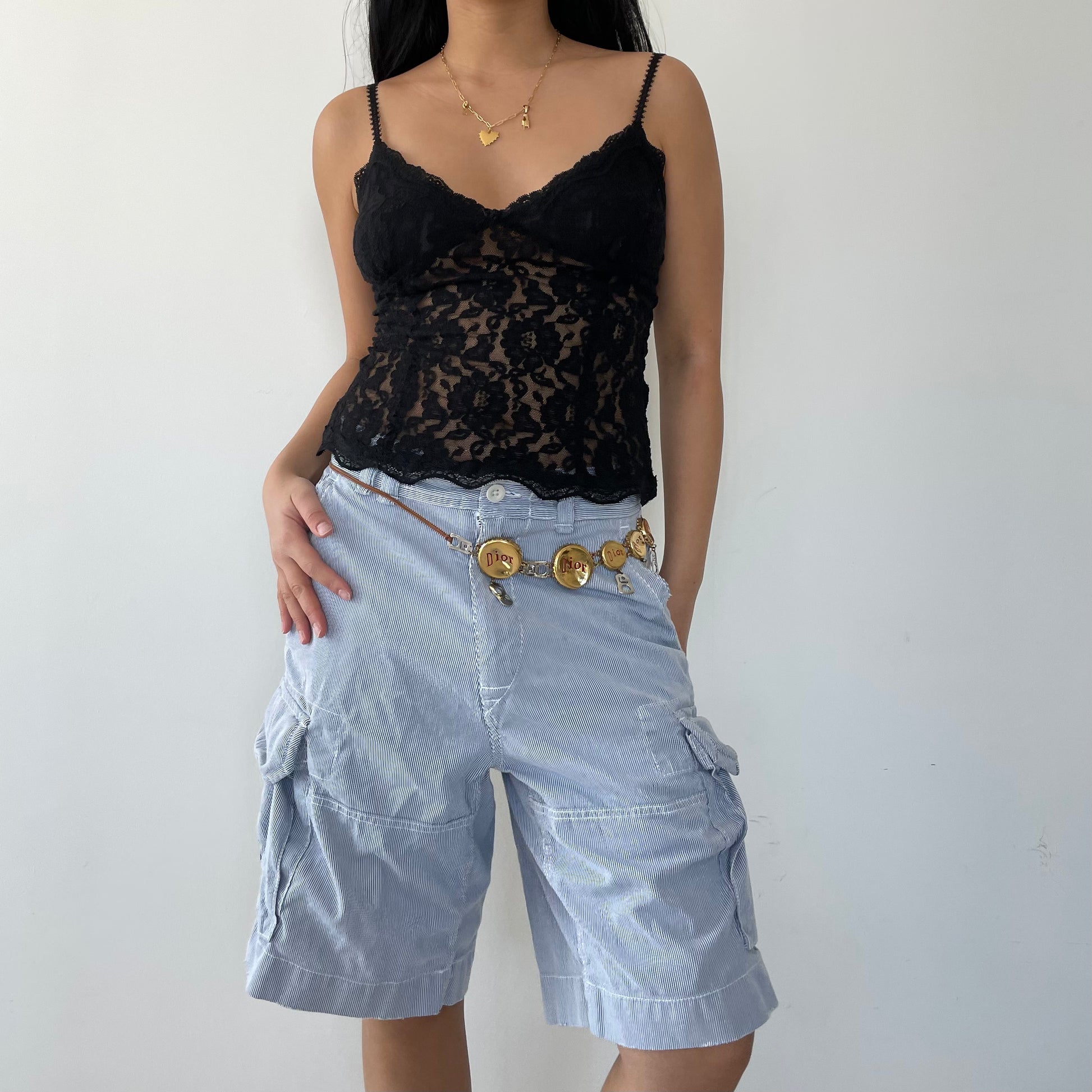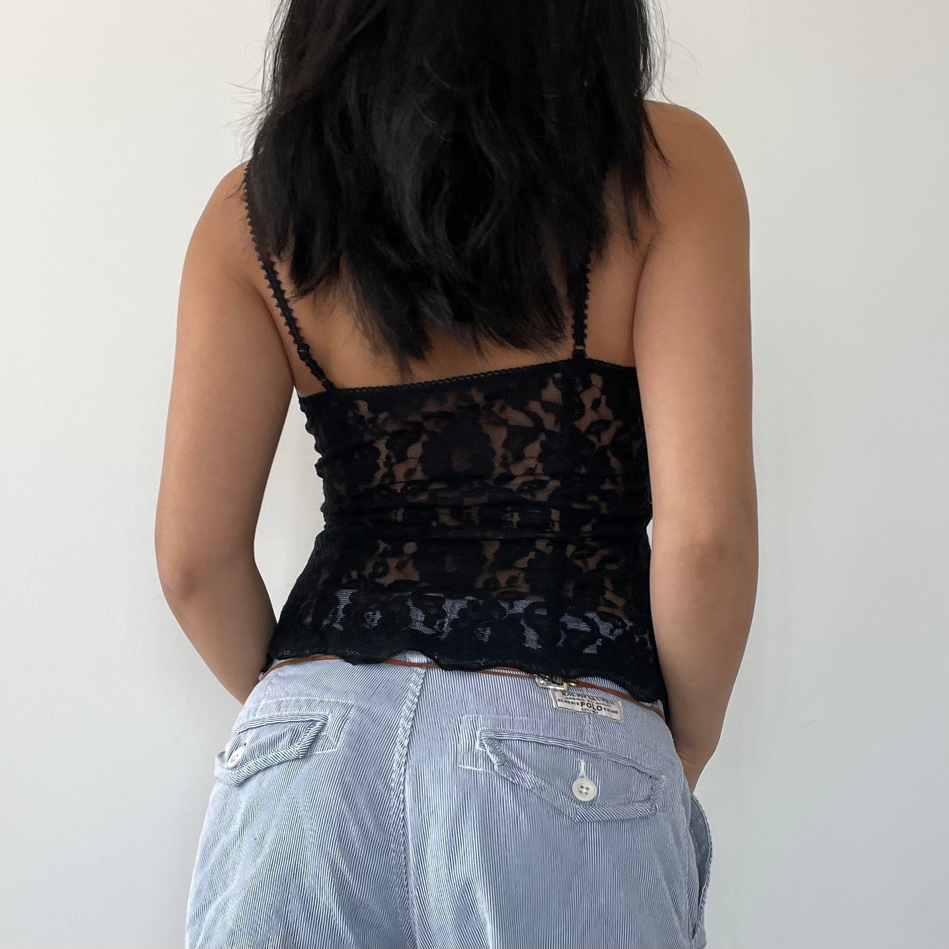 - Details: Black lace cami; bust area is double lined; sheer in the body; v-neck