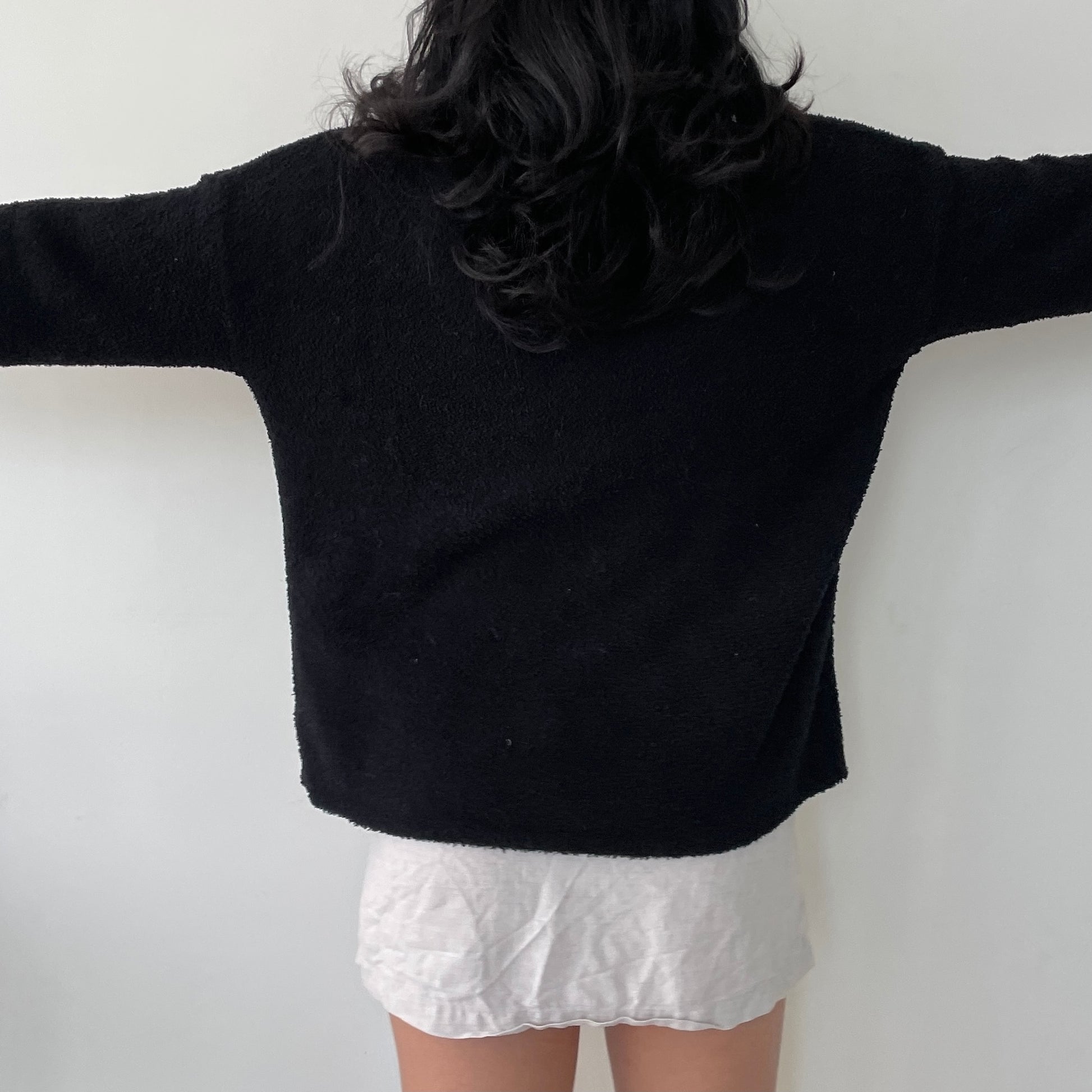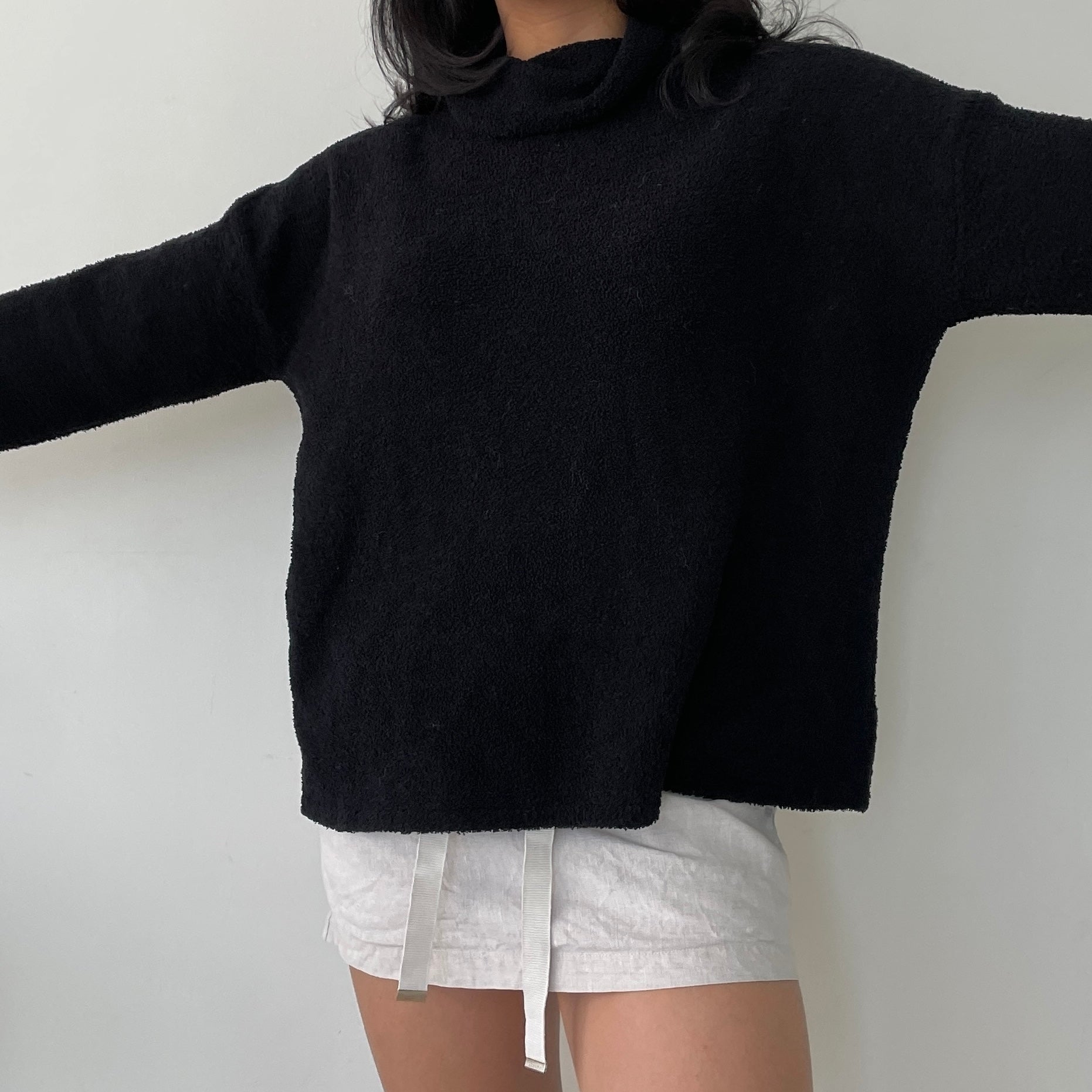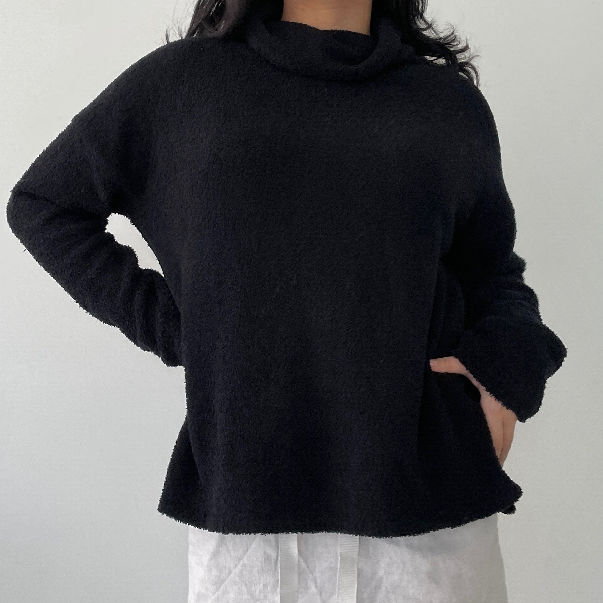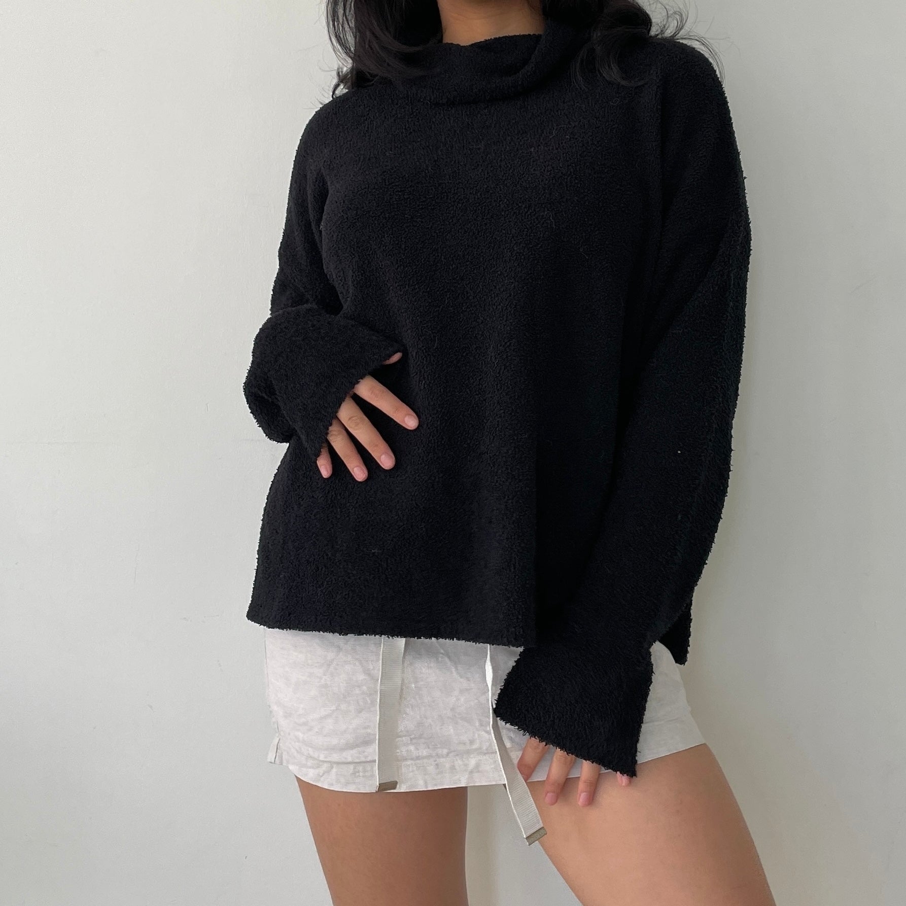 - Details: Slouchy relaxed fit; polo/rolled neck; long sleeves; soft fuzzy material