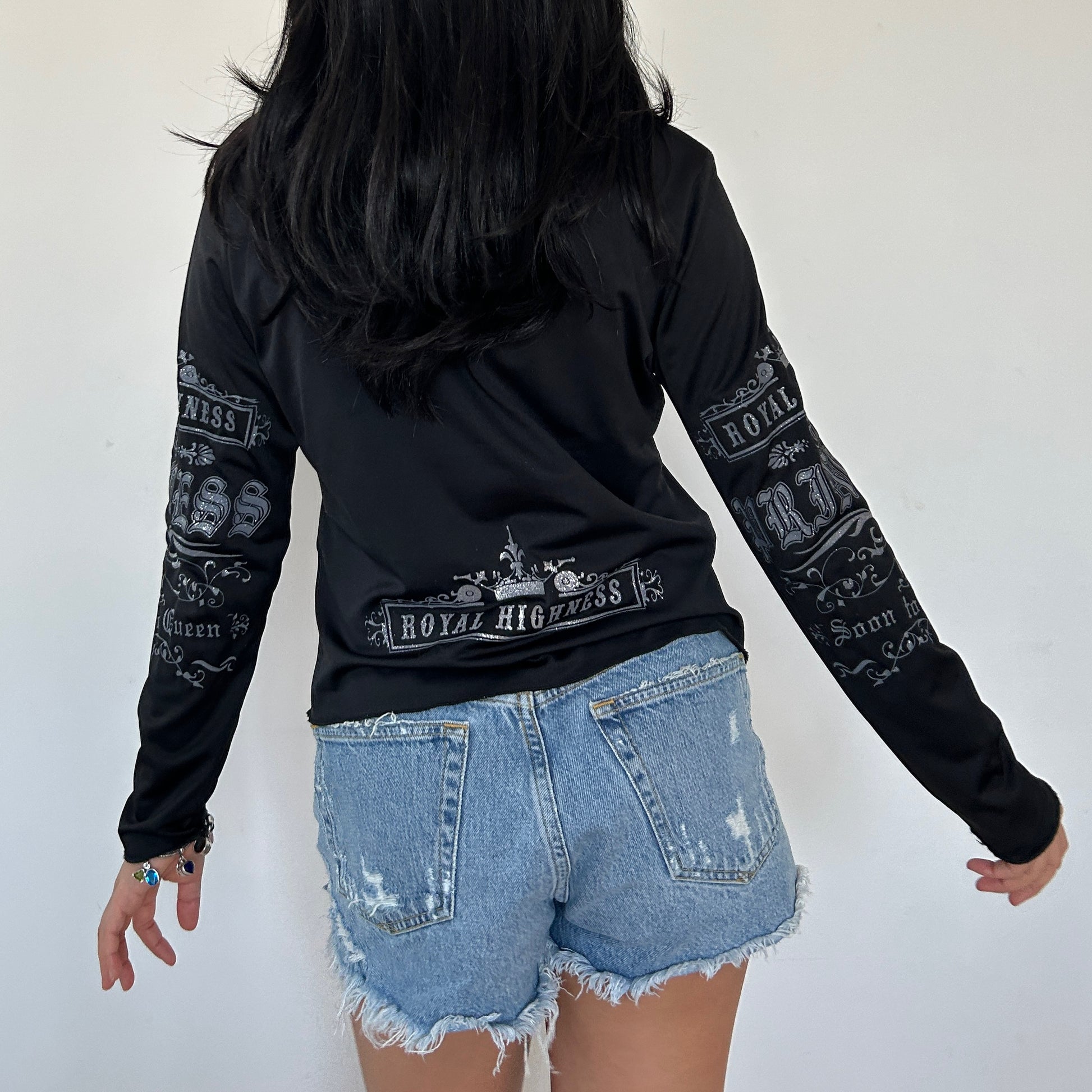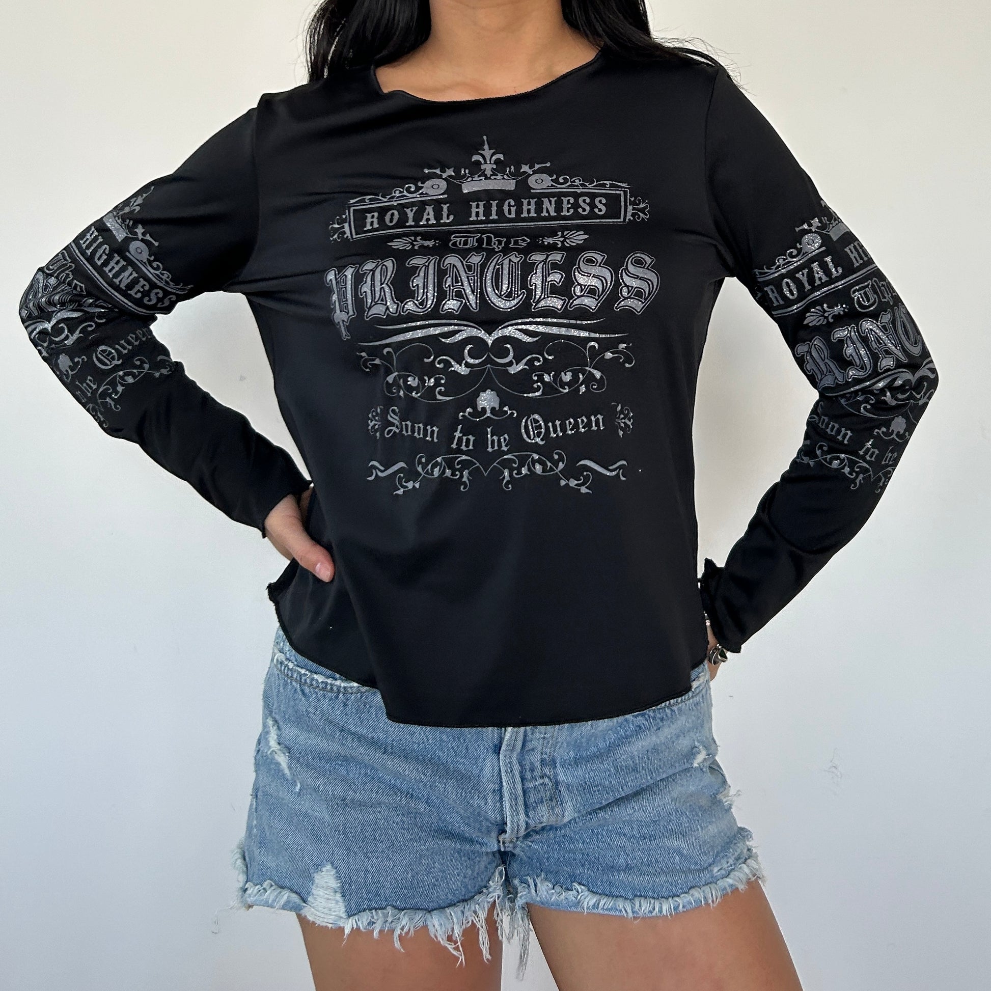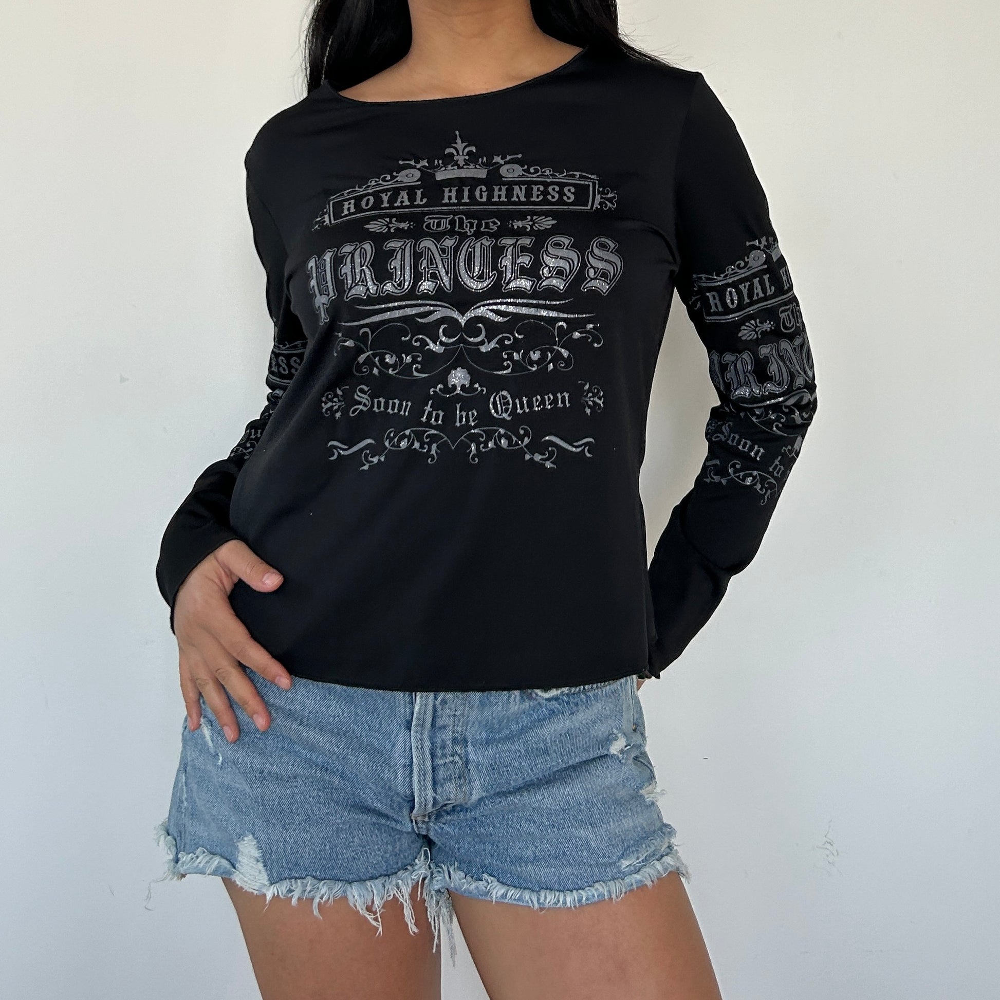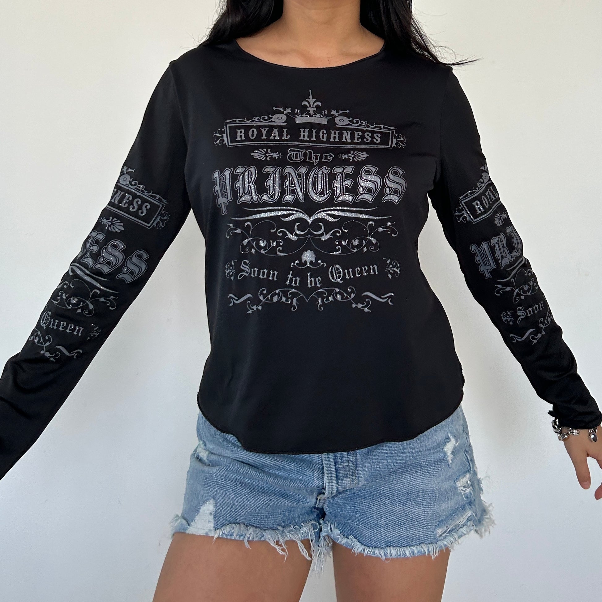- Details: Black long sleeve tee; 'Royal highness, the princess, soon to be queen' graphic on the front