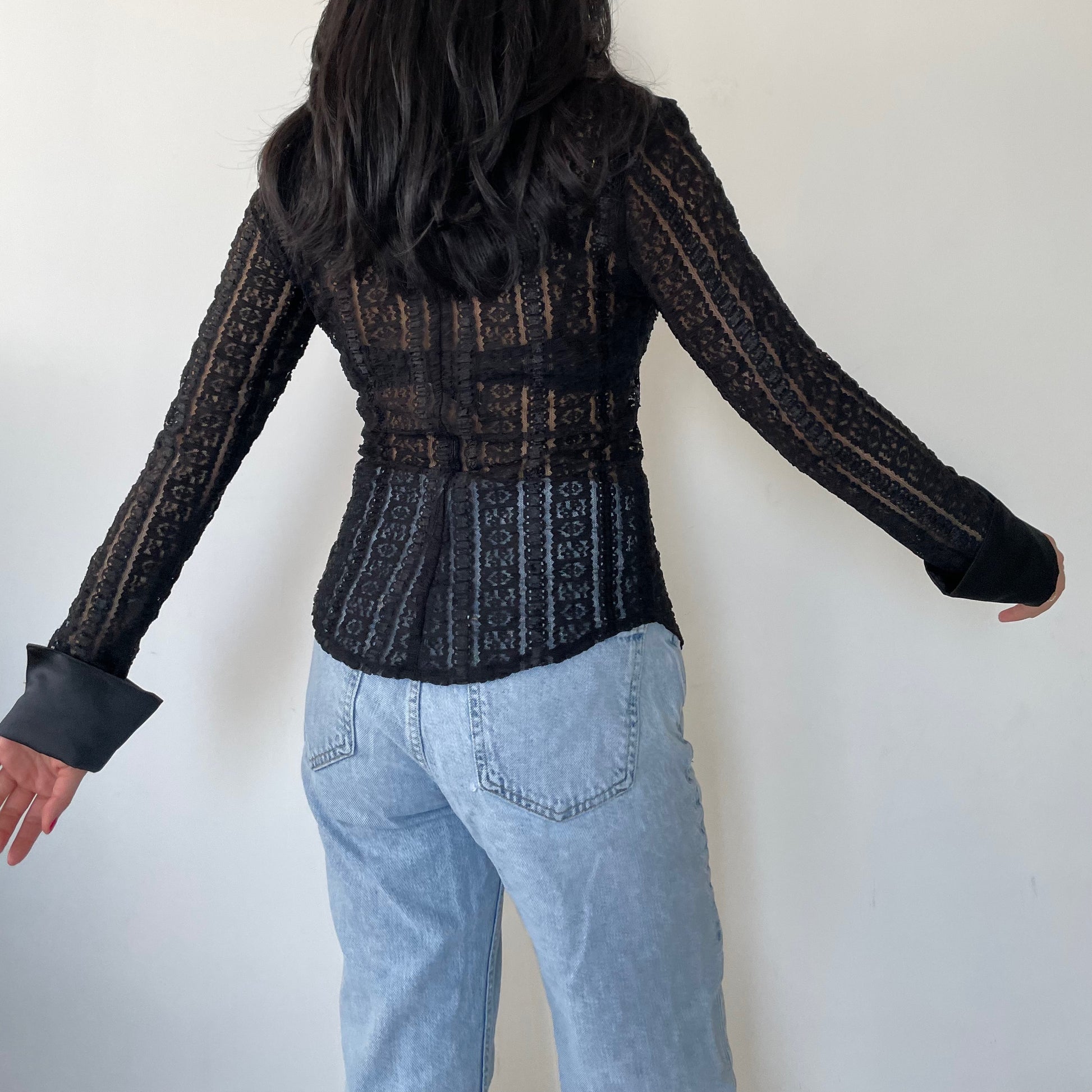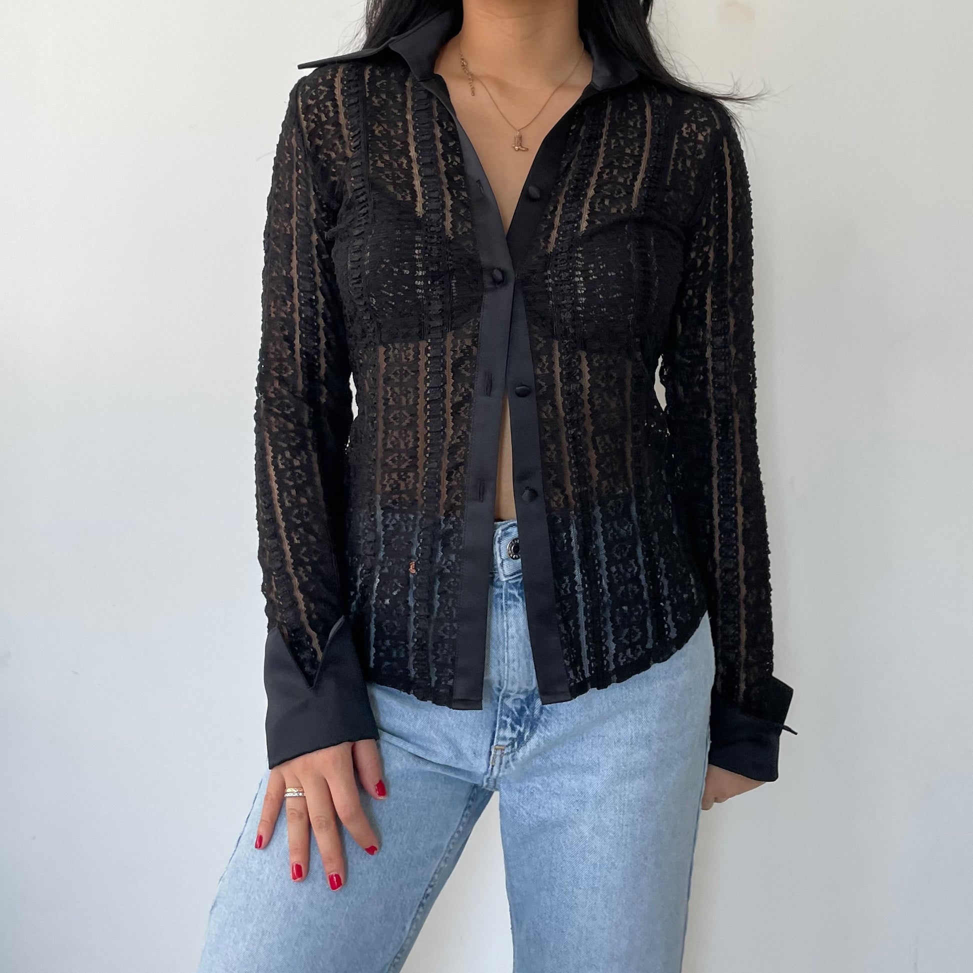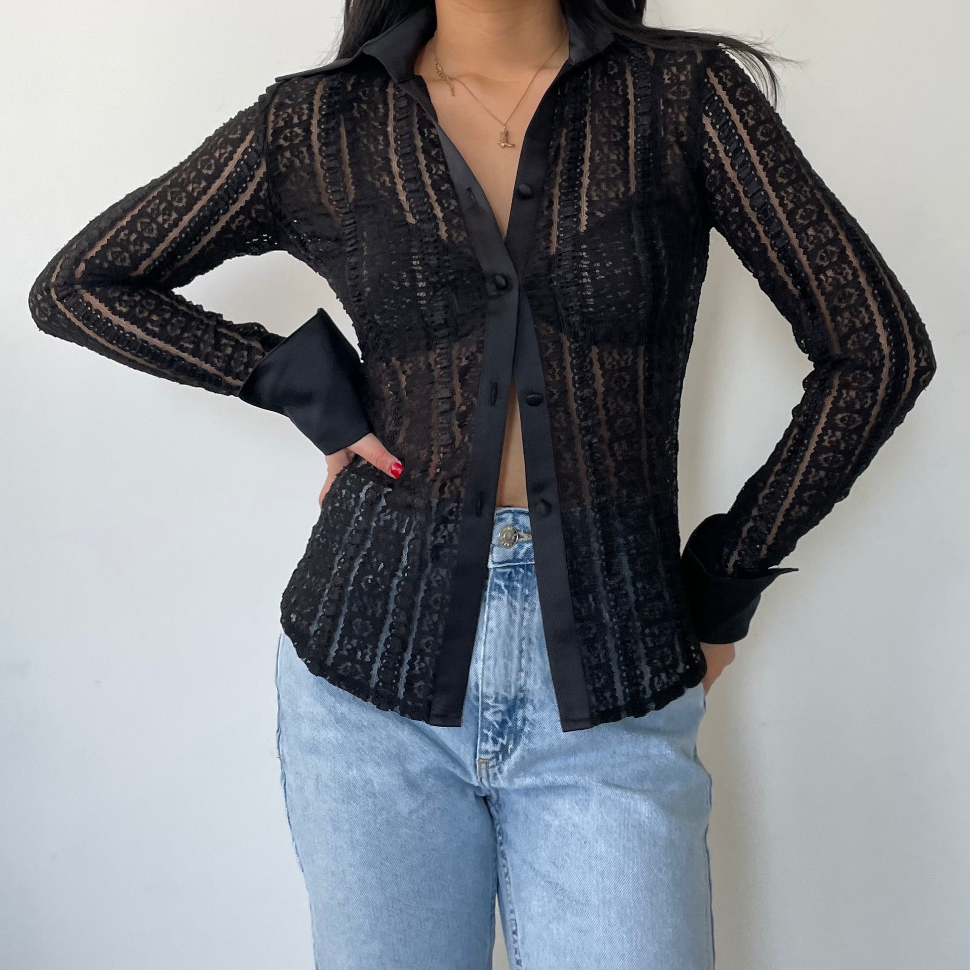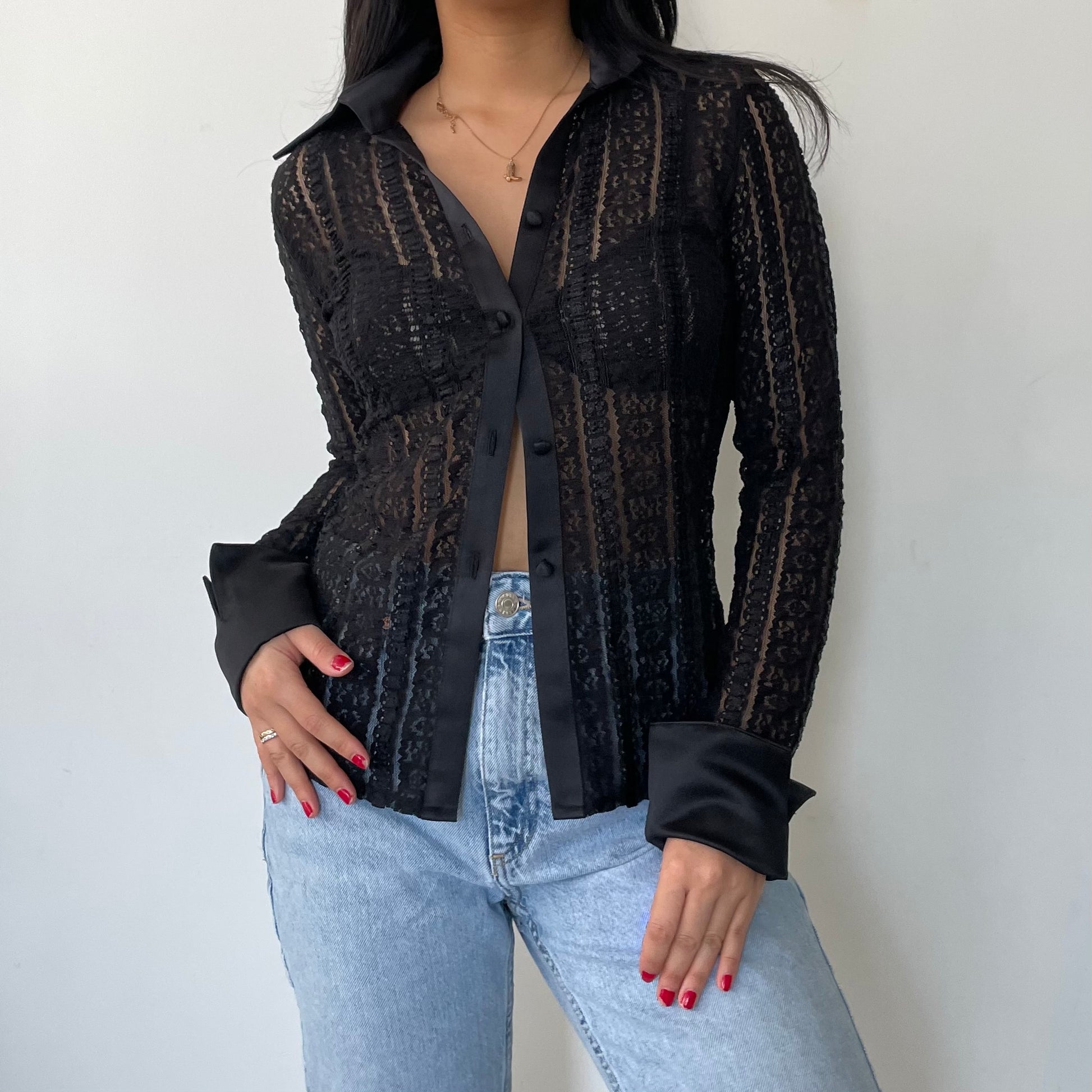 - Details: Sheer black lace blouse; button up; long sleeves; satin collar and rolled up sleeves; satin buttons