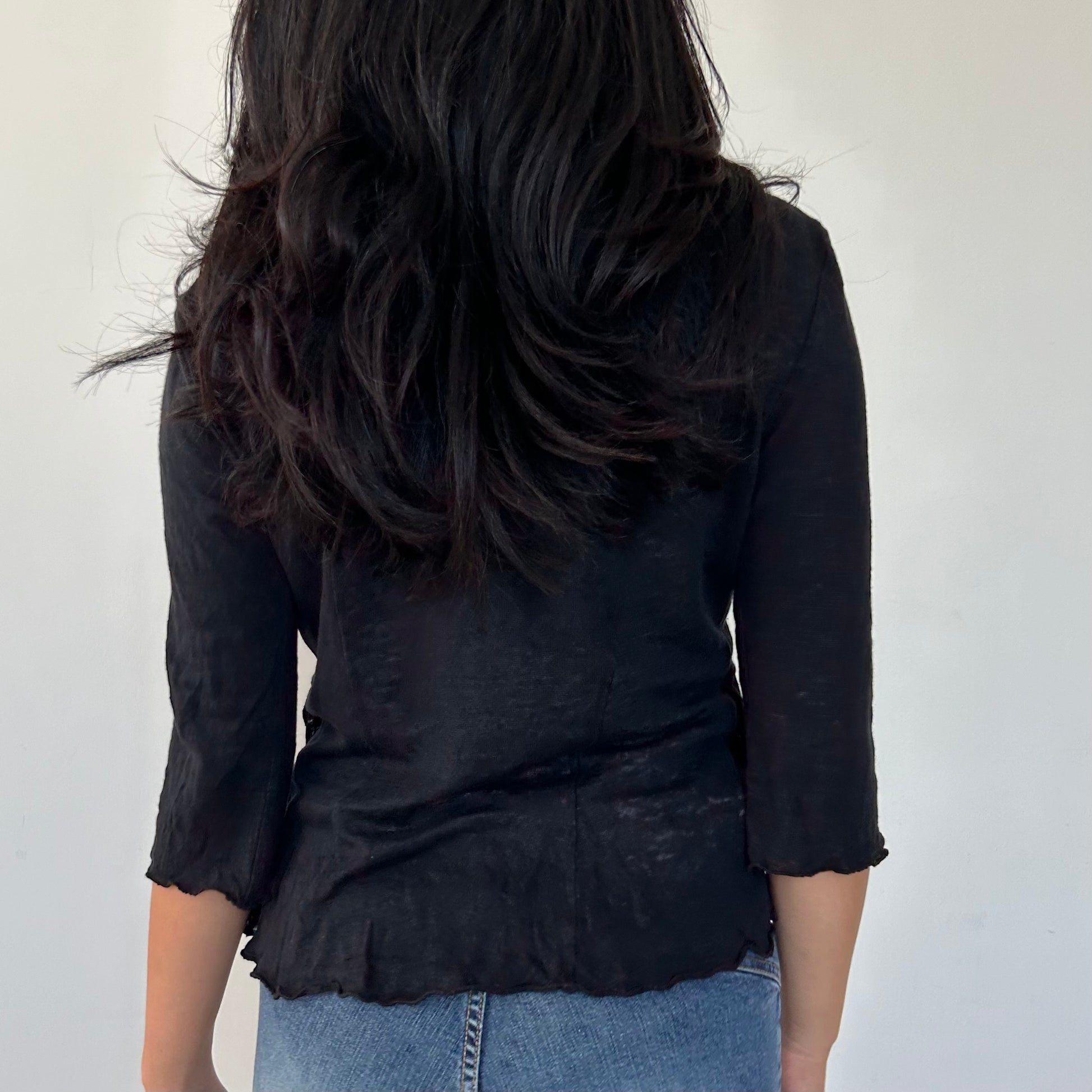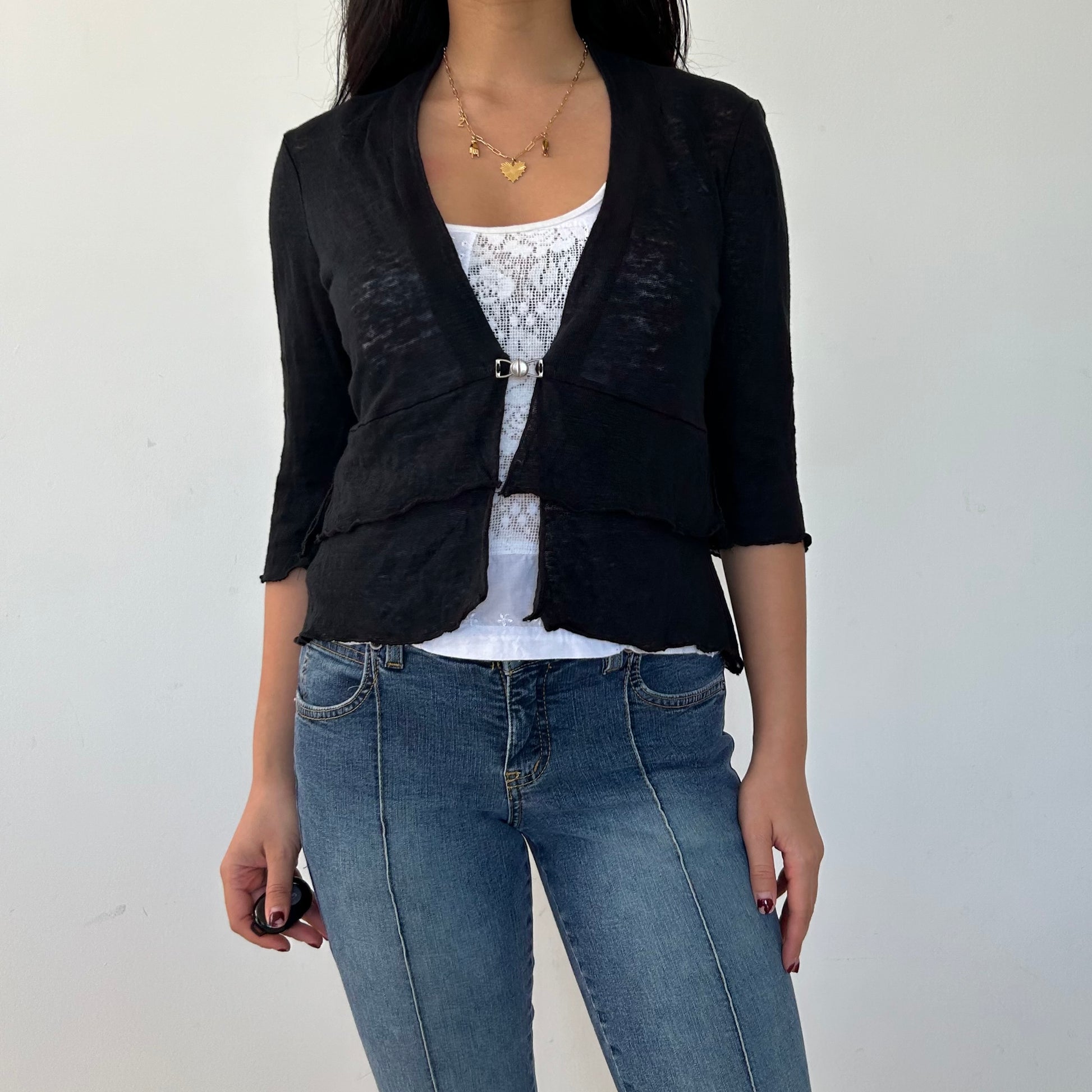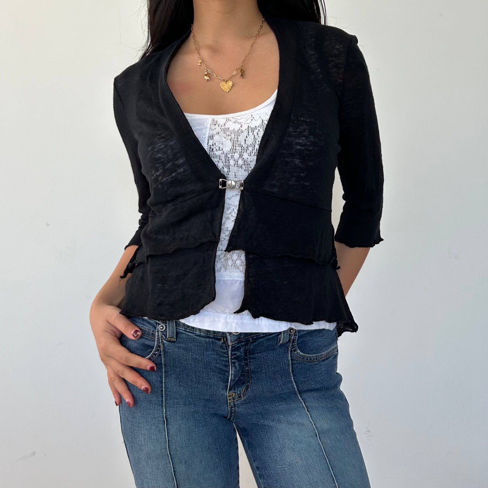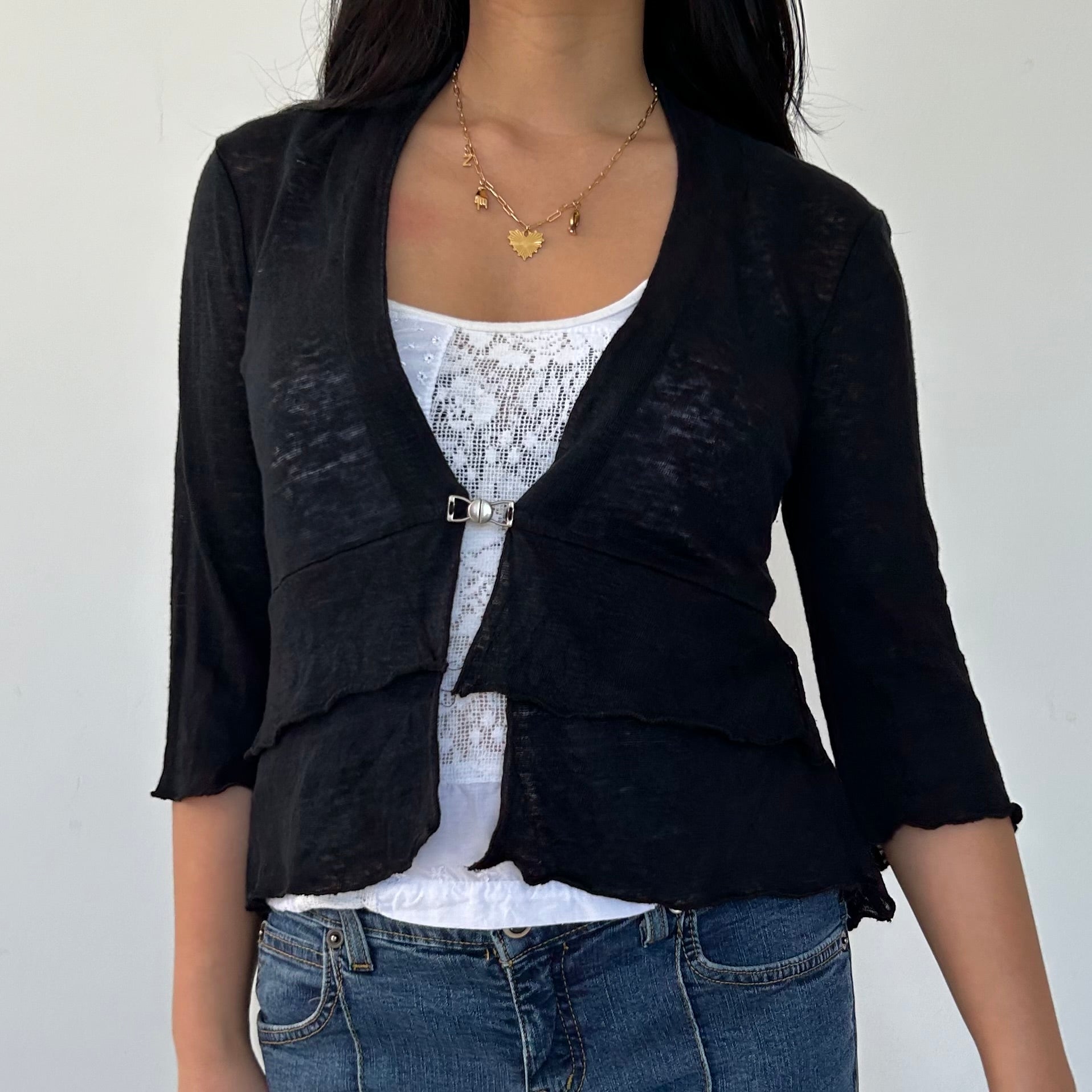 - Details: Black cardigan; ruffle details; silver clasp in the middle; three-quarter sleeves