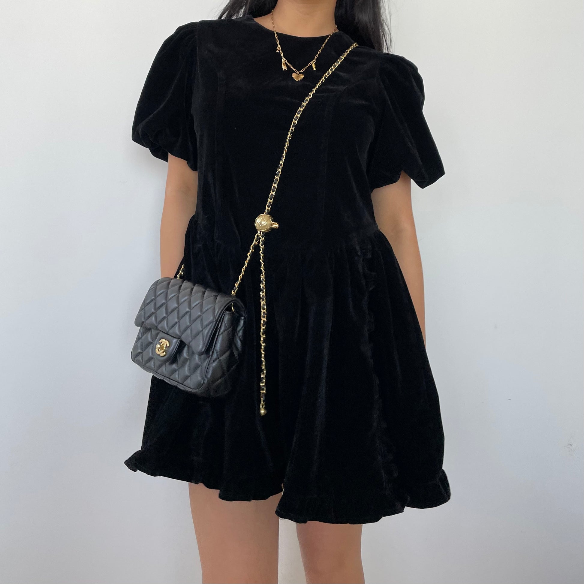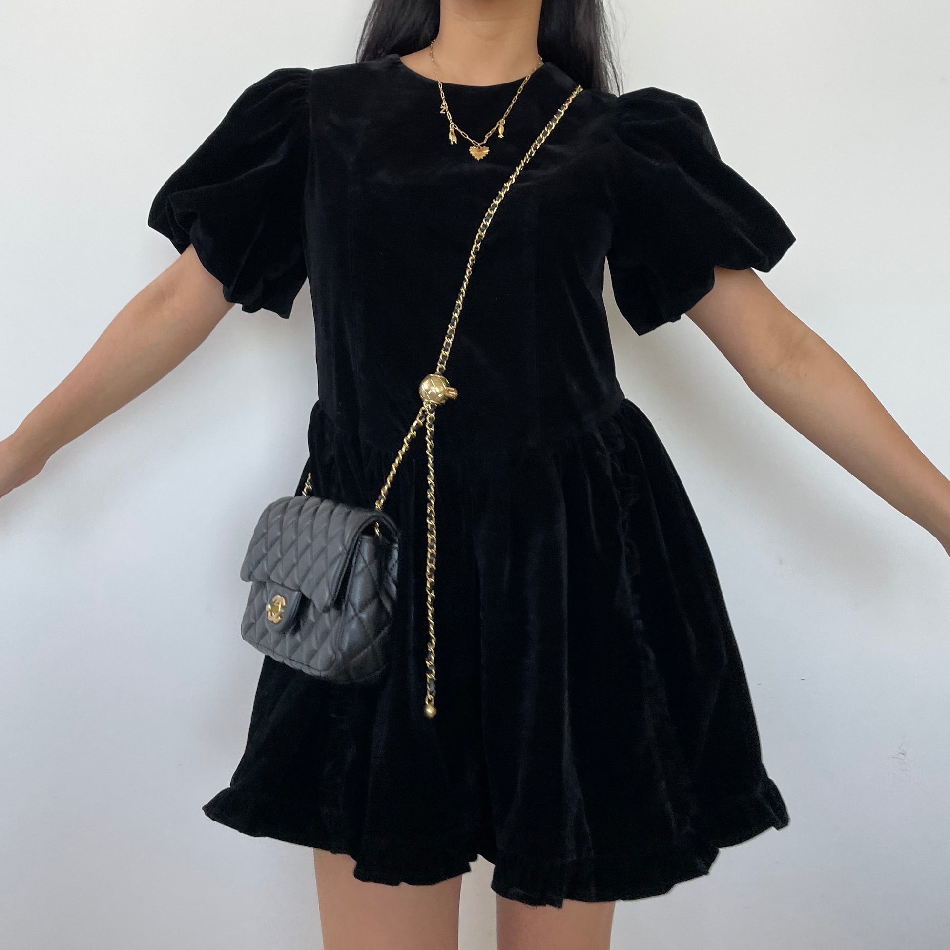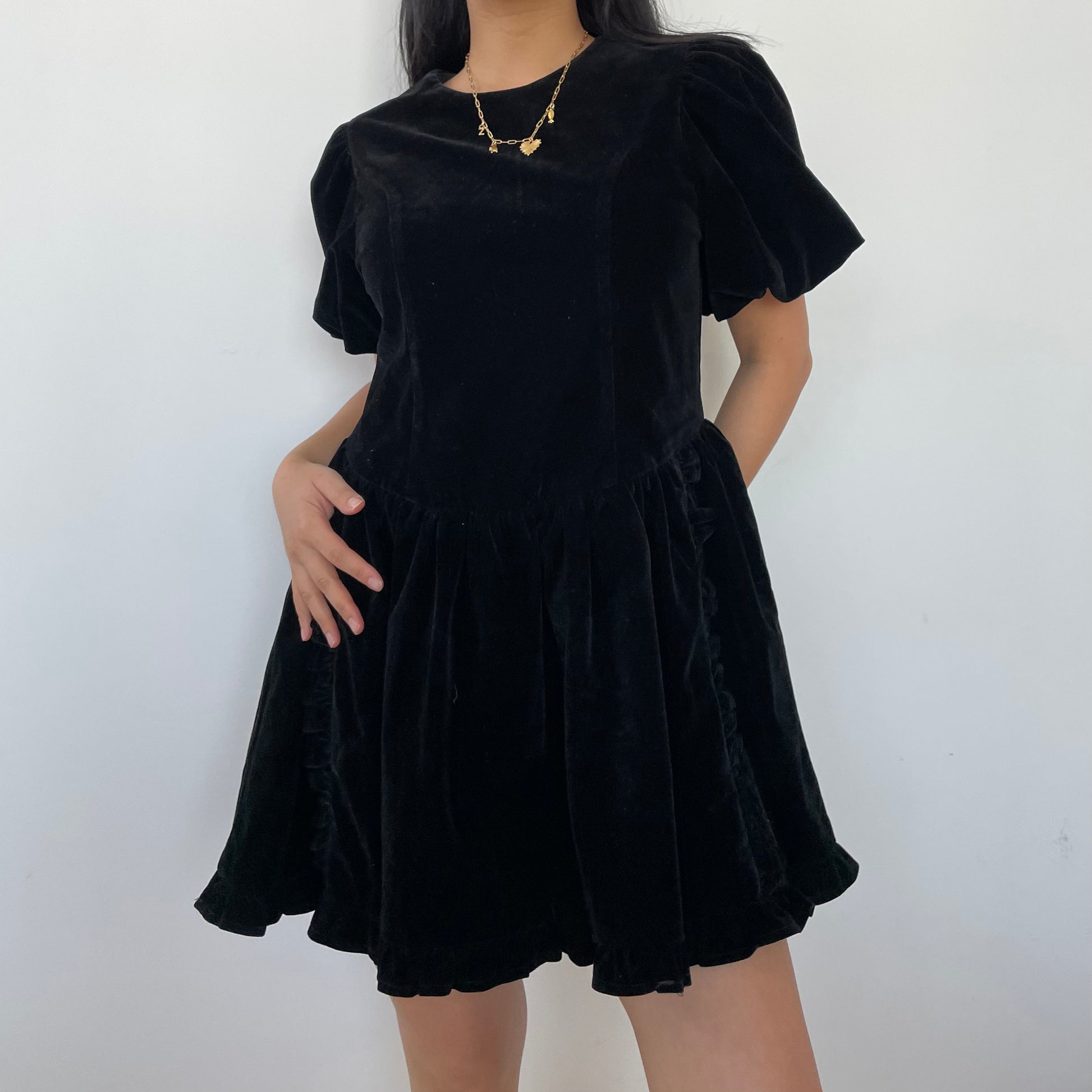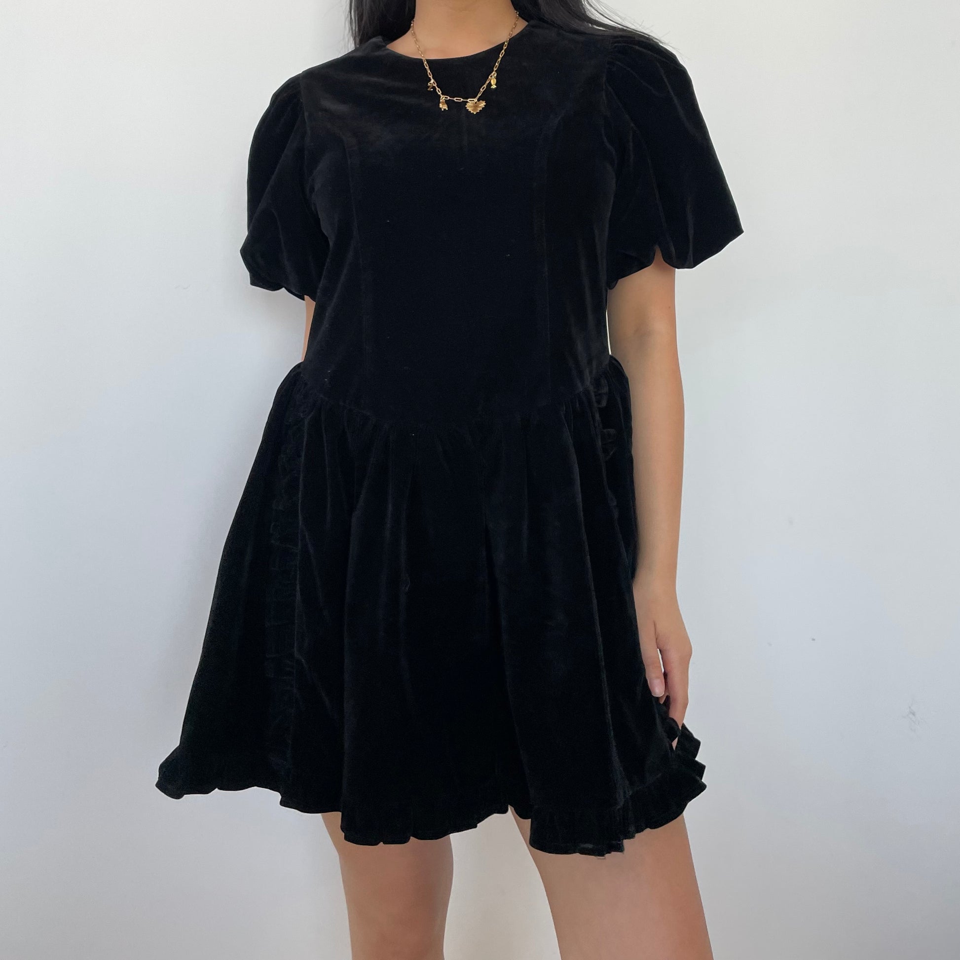 - Details: Black babydoll dress; double lined; thick velvet material; puff sleeves; ruffle lined hem