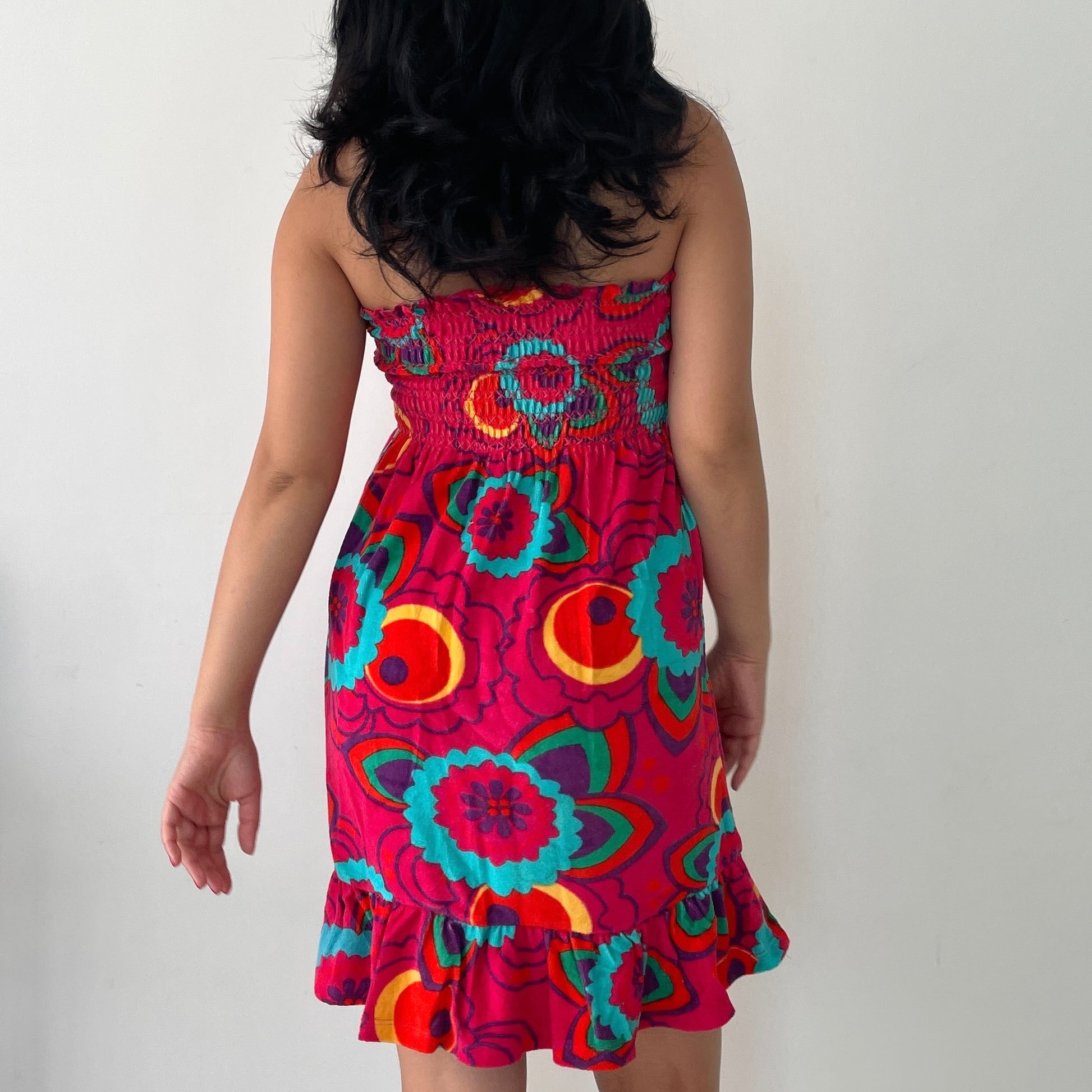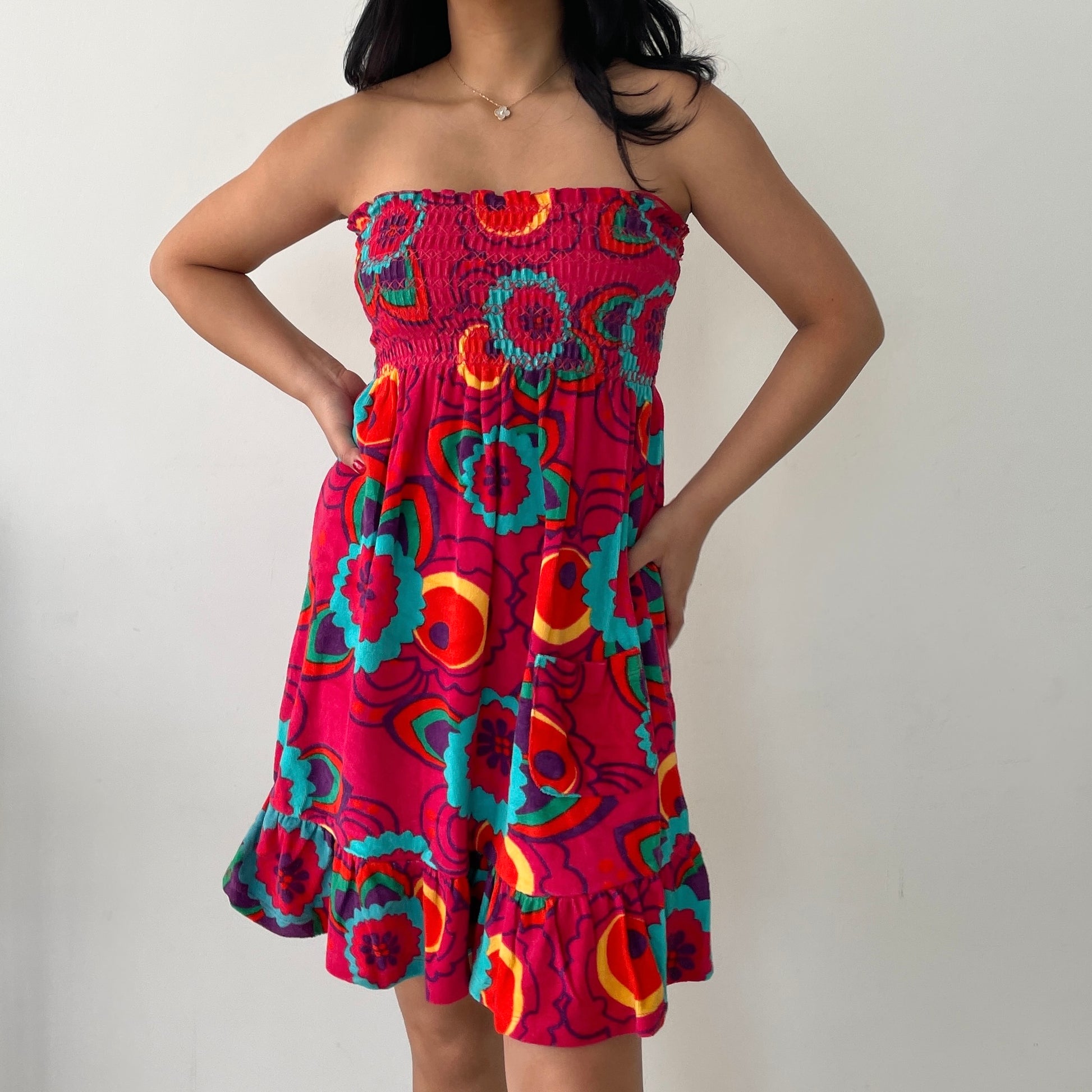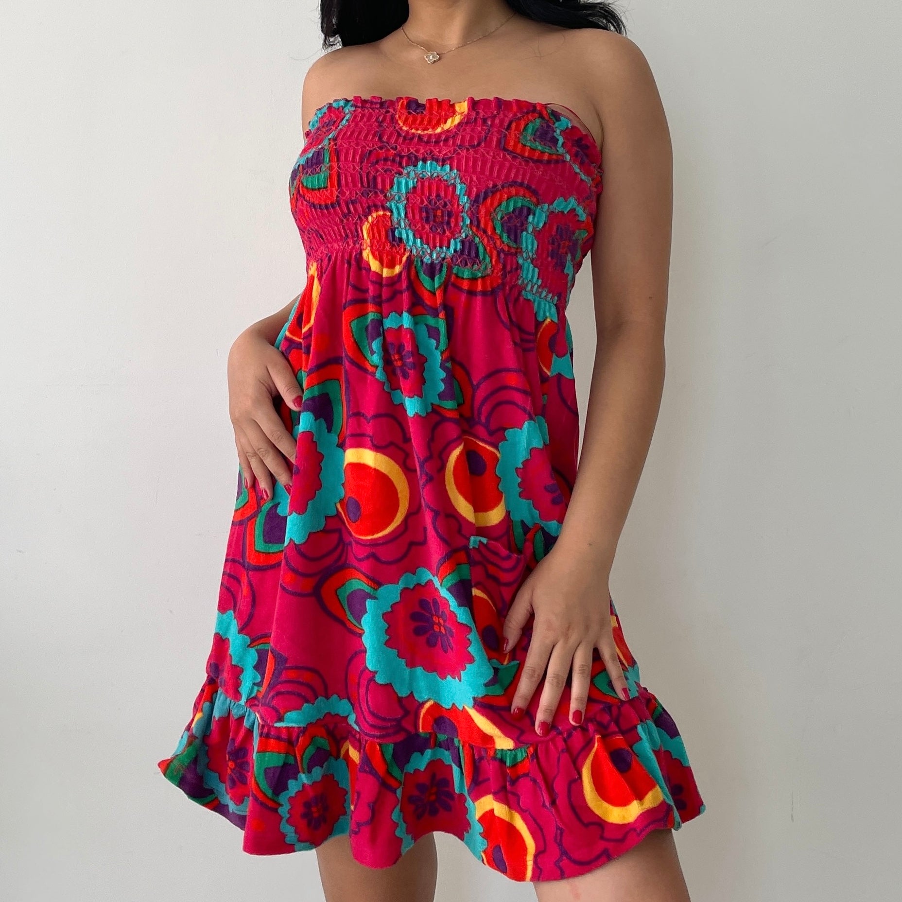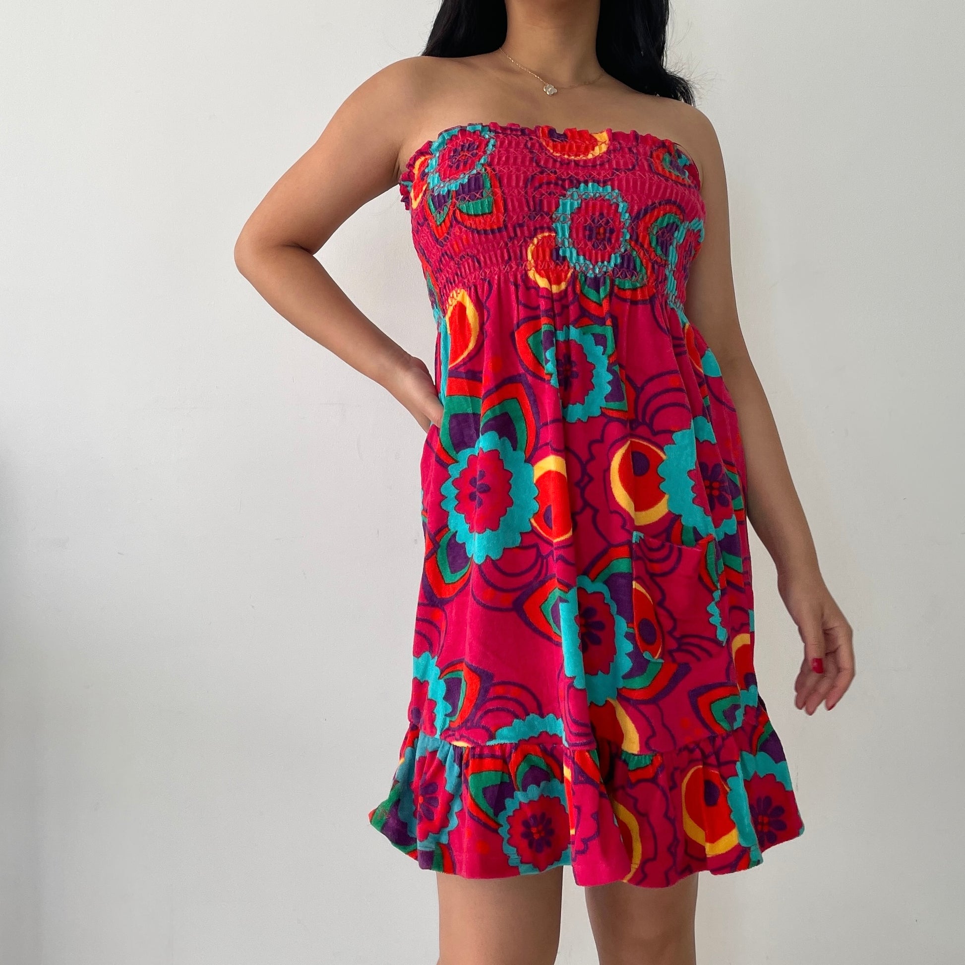 - Details: From the rich aunt archive! Fuschia, blue green, and yellow floral printed terry towel strapless mini dress; ruched bodice; single pocket on the front