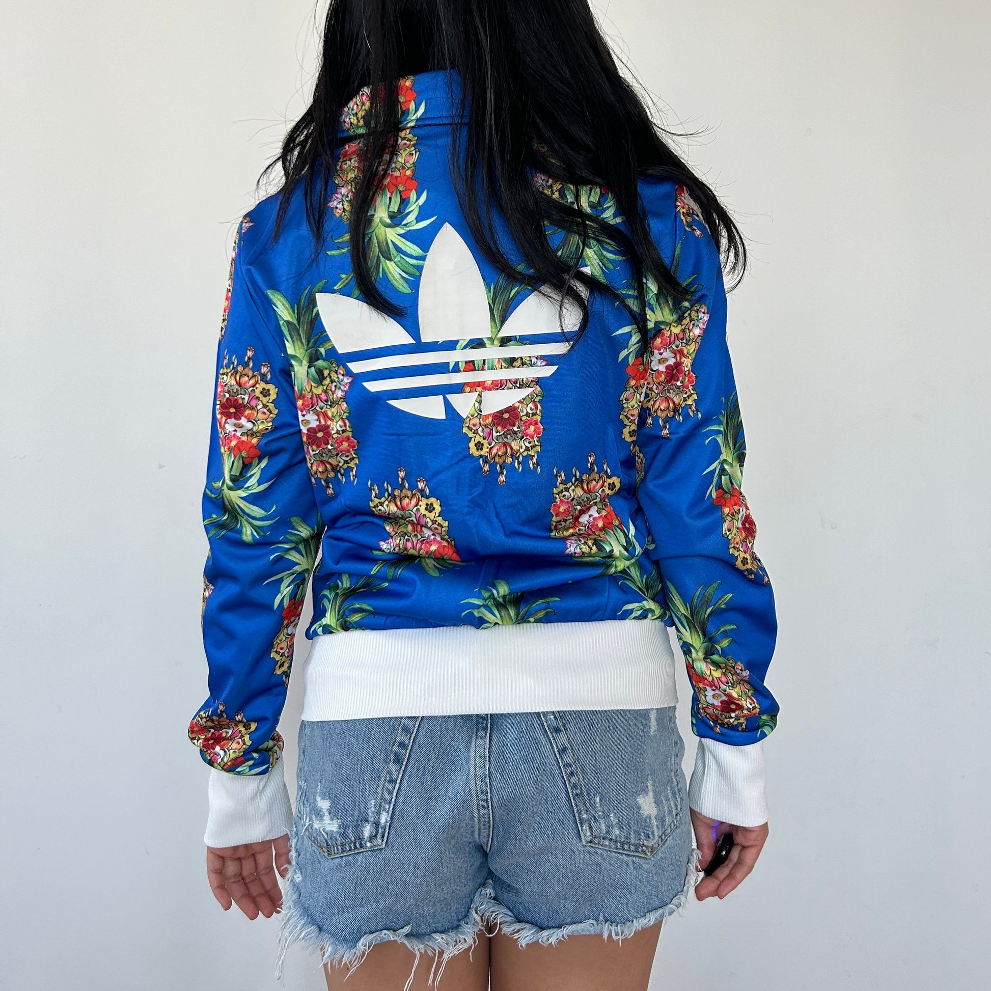 - Details: Brand new with tags; from their 2014 collab with Farm Rio; long sleeve zip up jacket; blue with pineapple print; two side zipper pockets