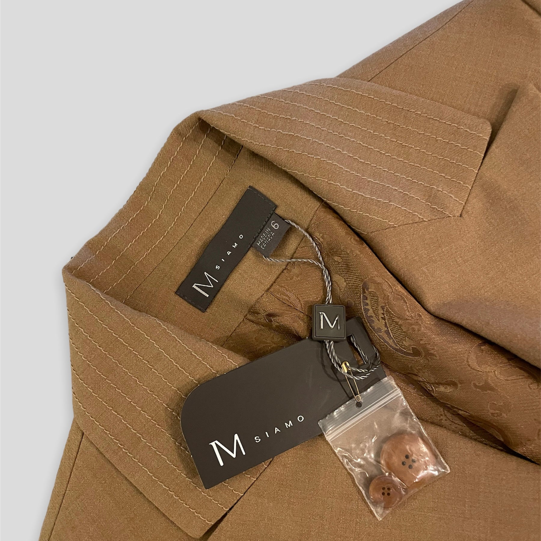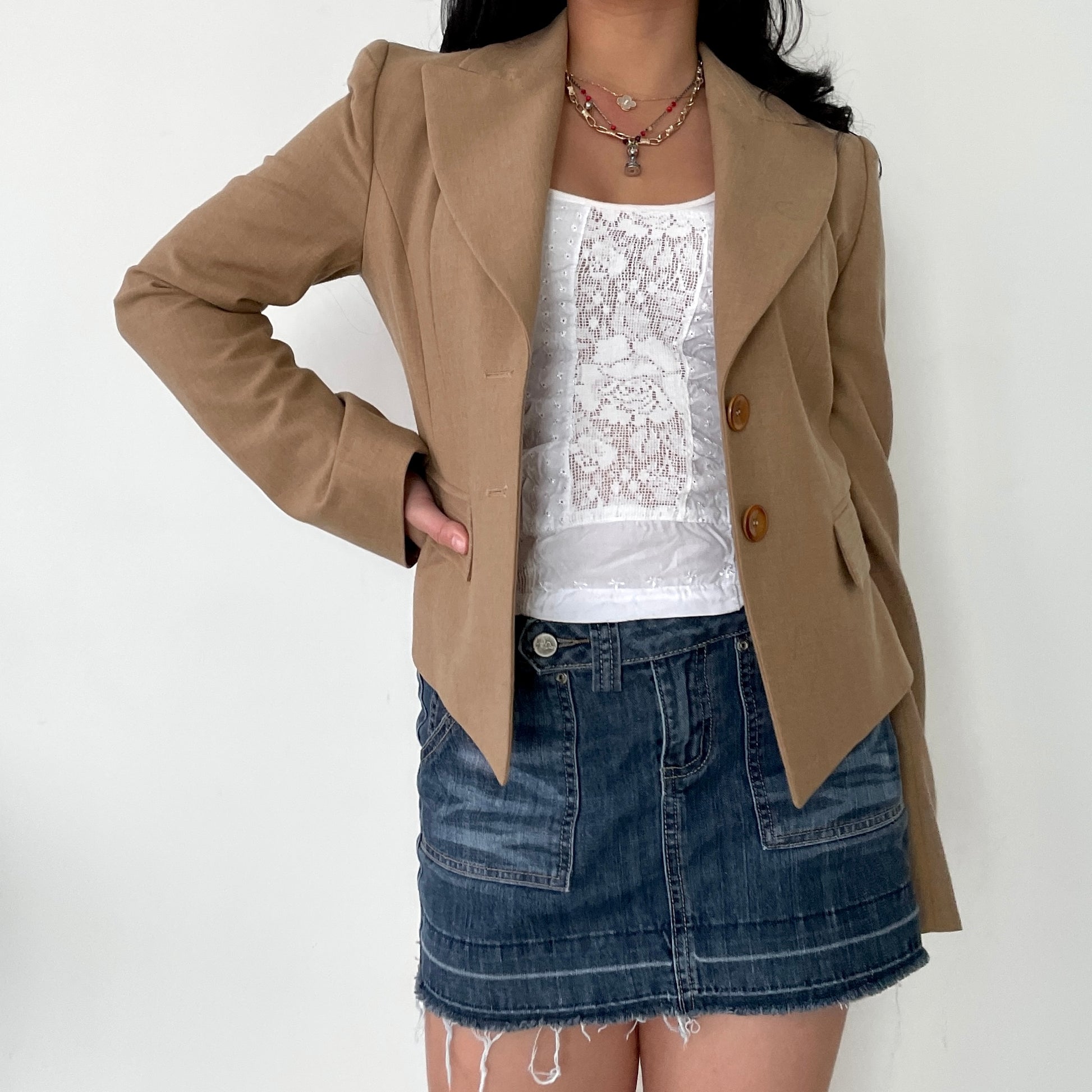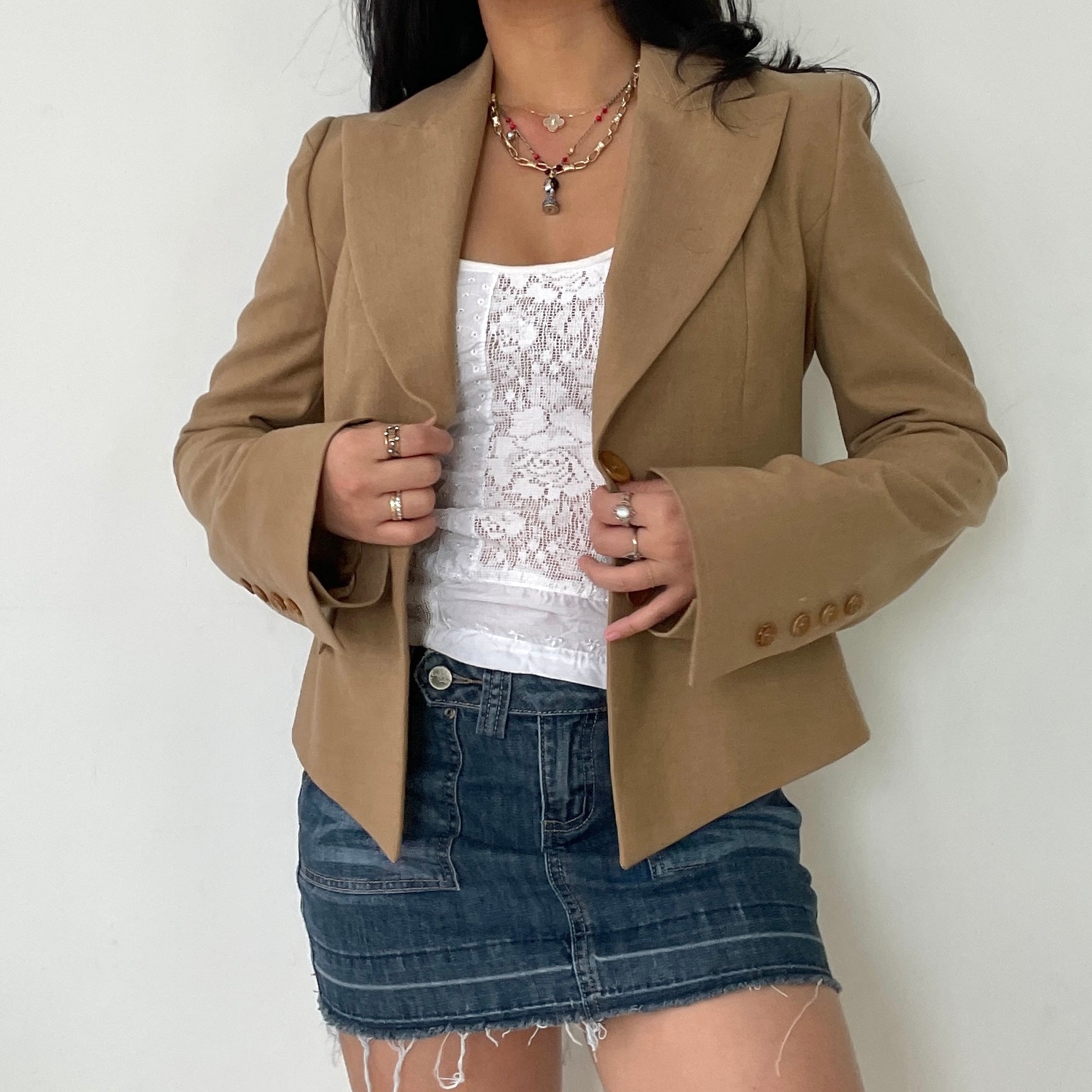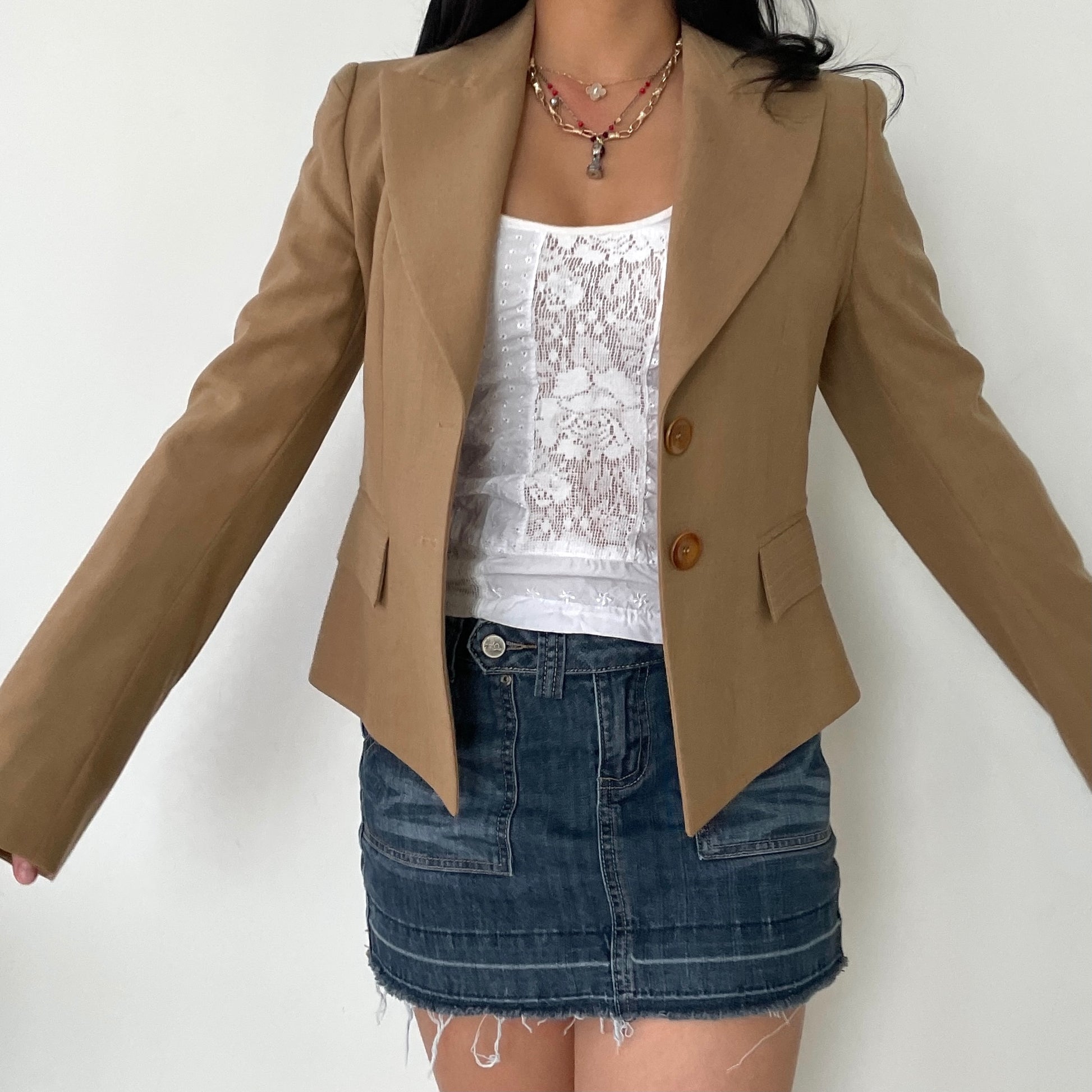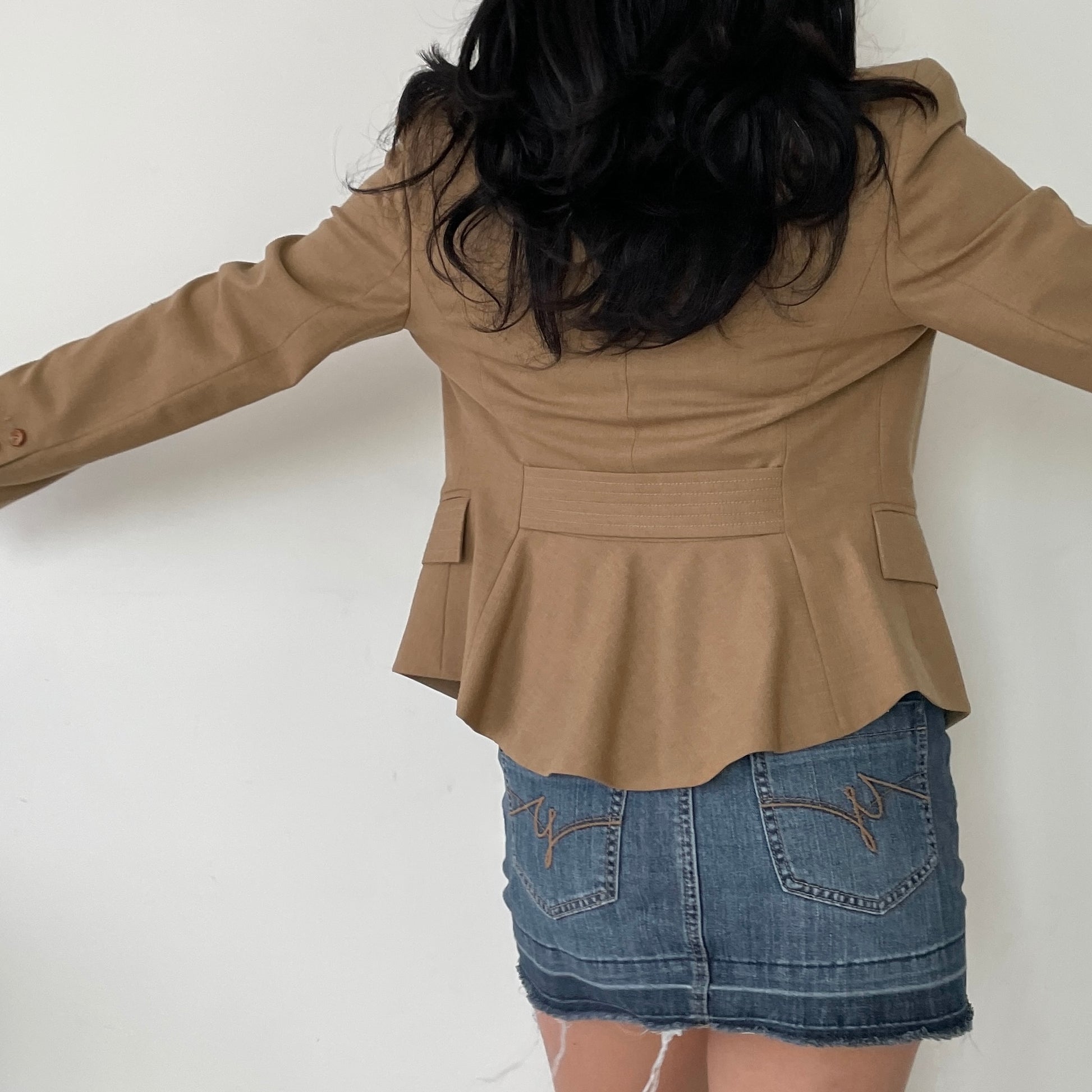 - Details: Very similar to Mugler; cropped beige blazer; sharp and tailored fit; single breasted; two front pockets; peplum style in the back; originally $930 CAD