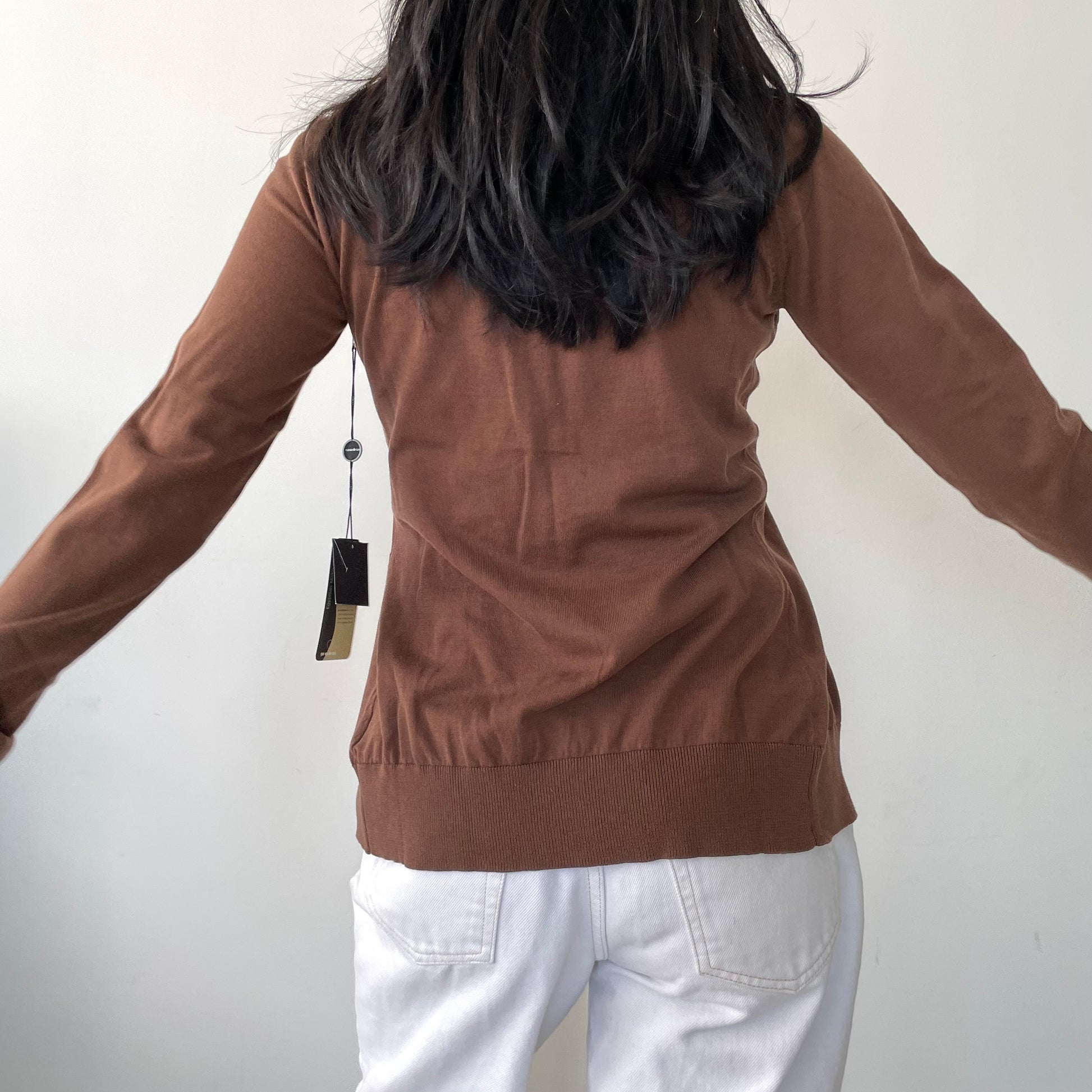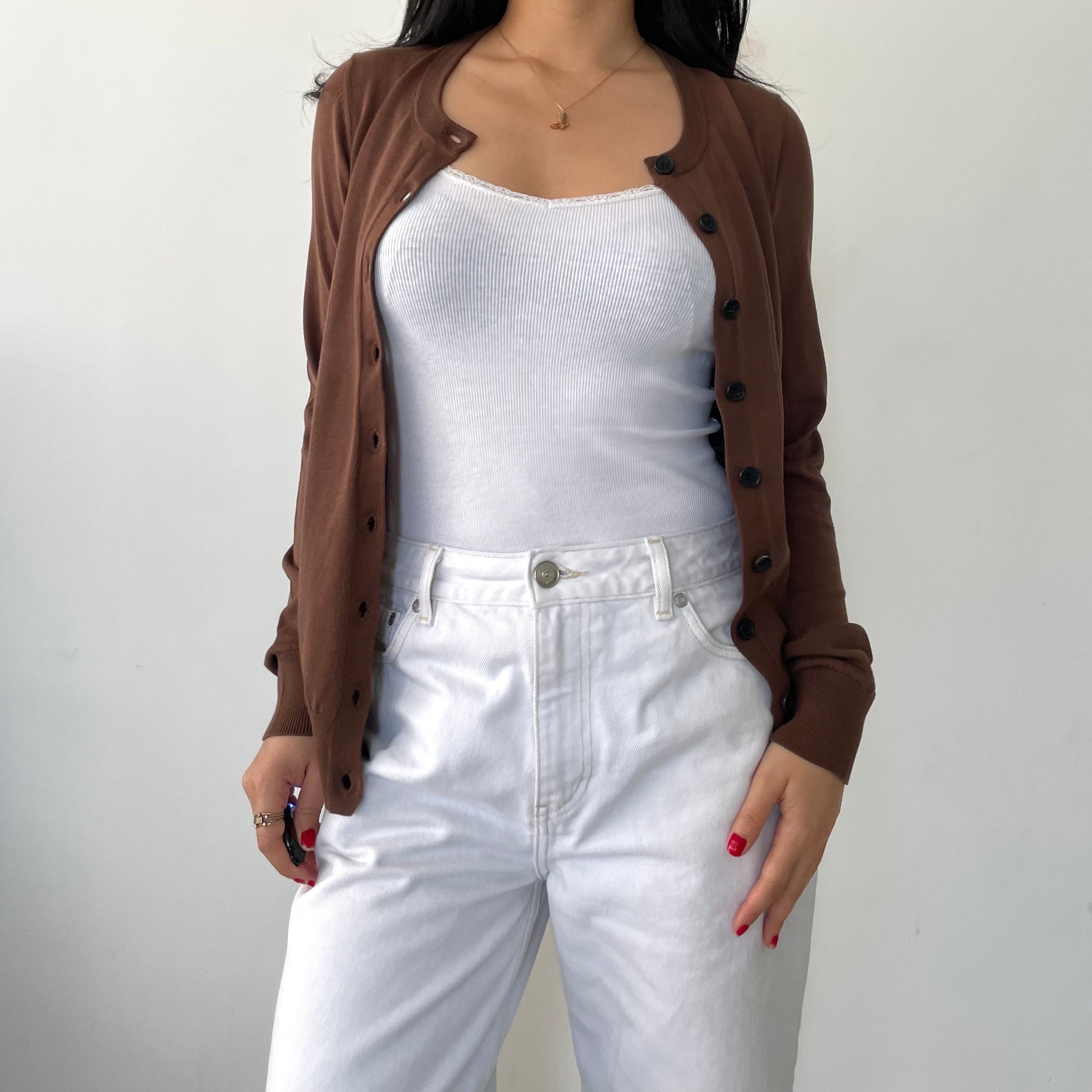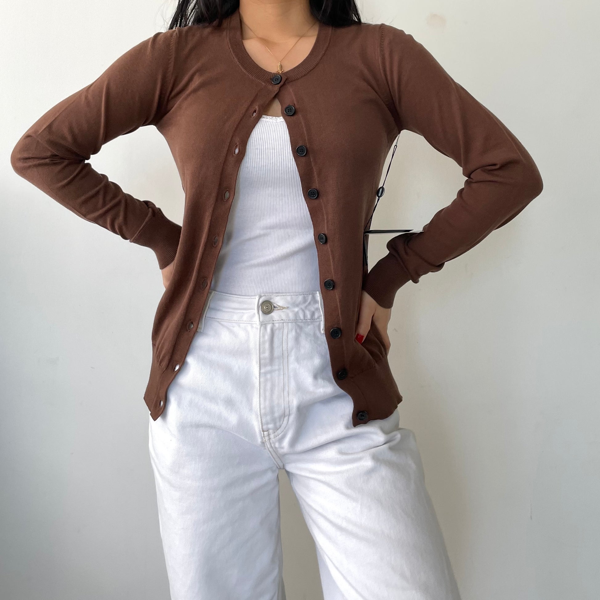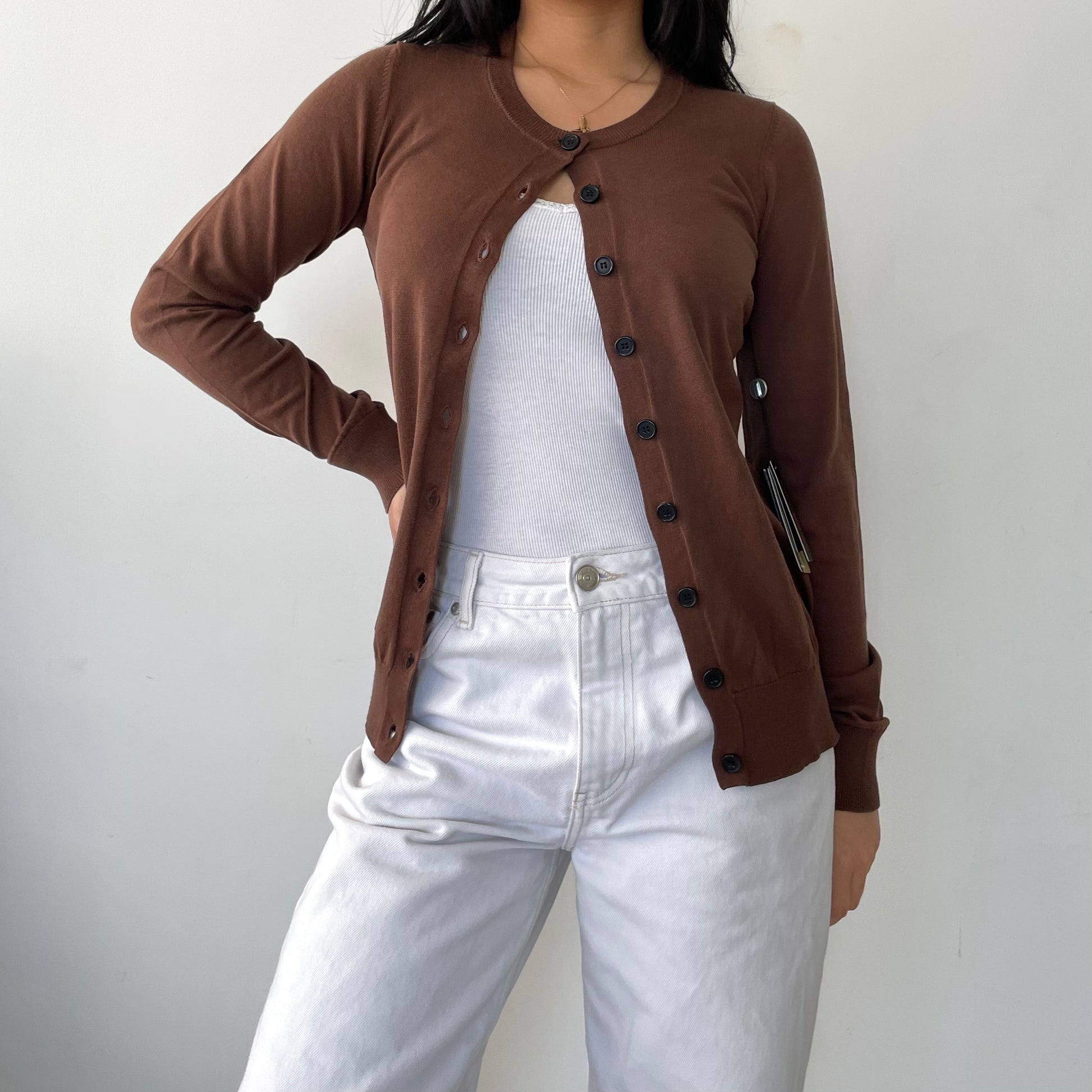 - Details: Lightweight brown knit cardigan; long sleeves; black buttons; nipped waist; crewneck