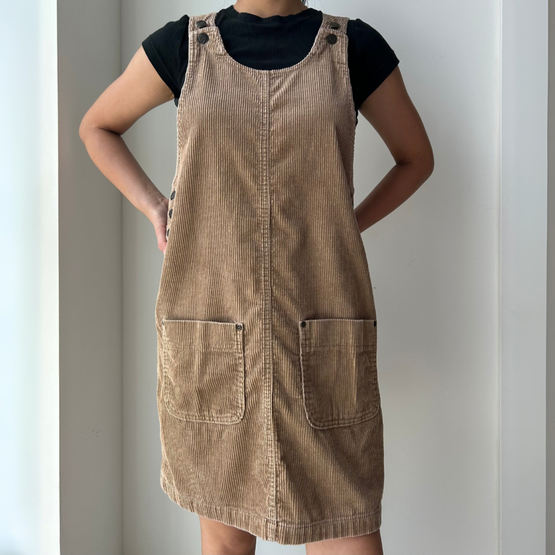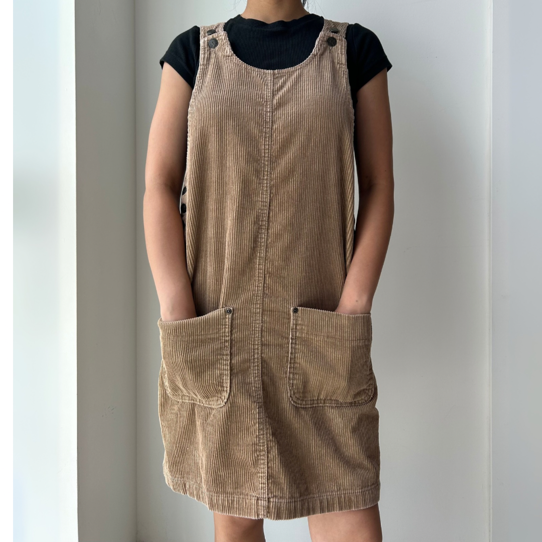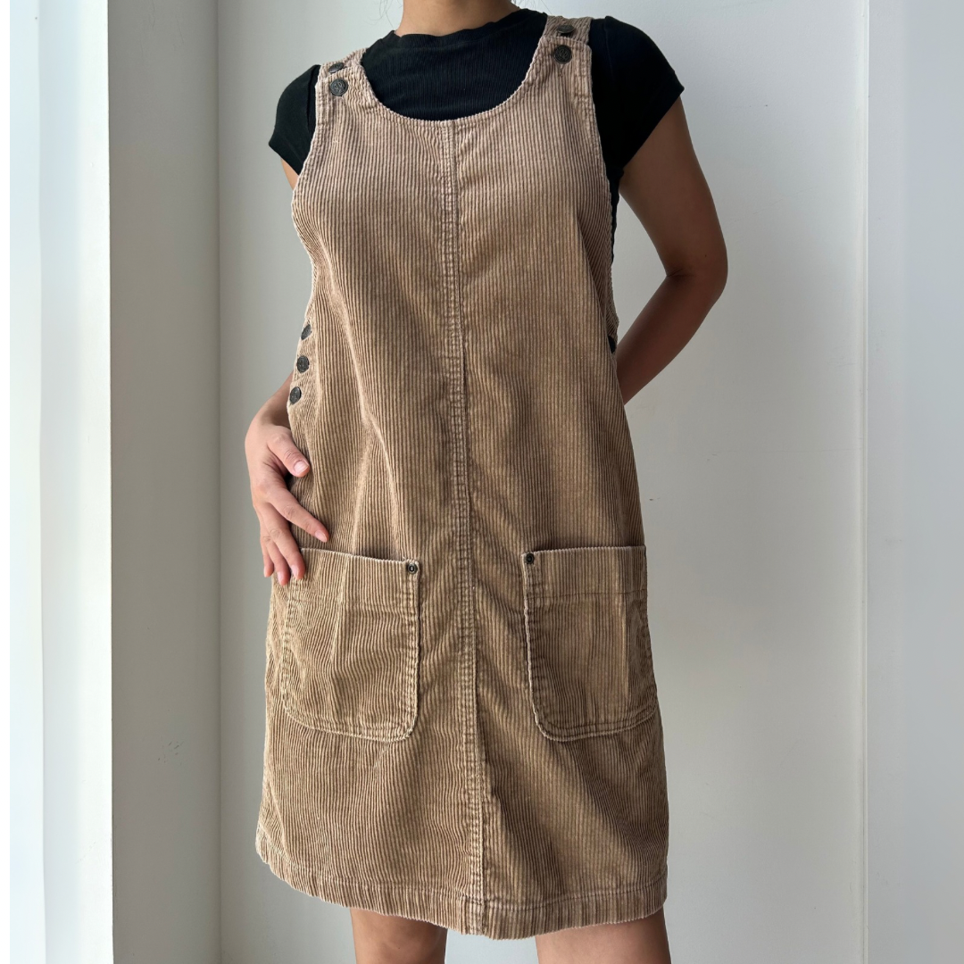 - Details: Brown corduroy with large patch pockets and side button details; pinafore dress
