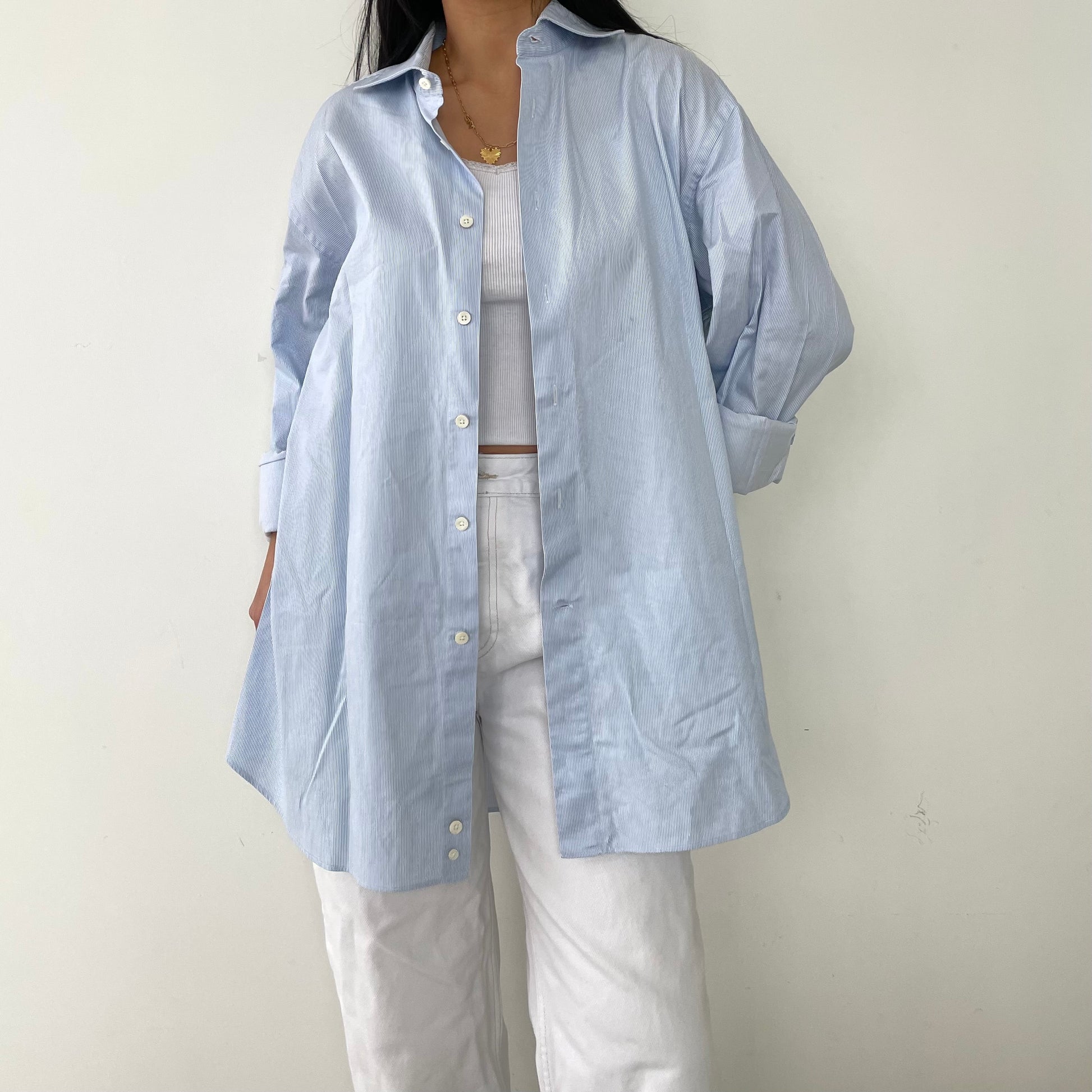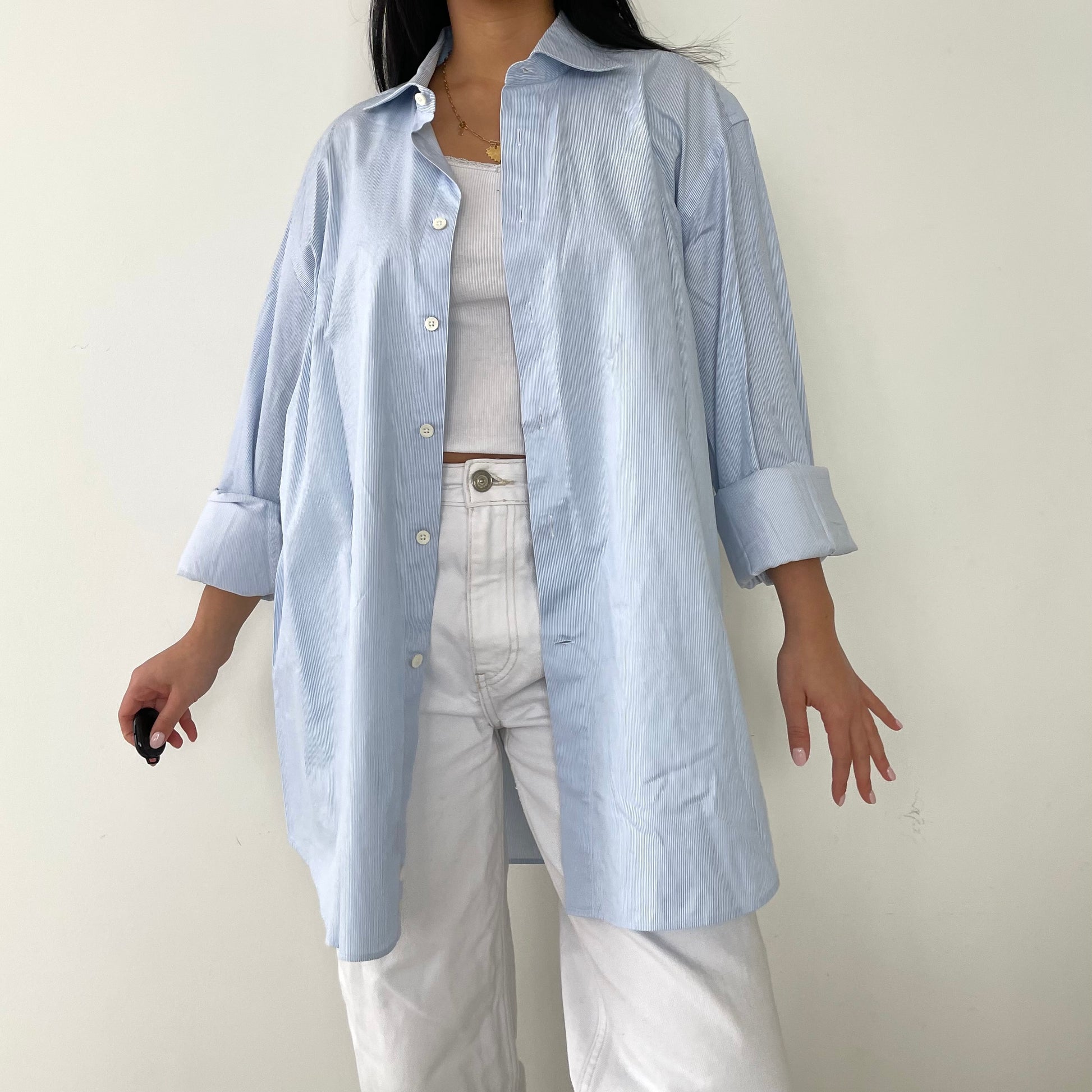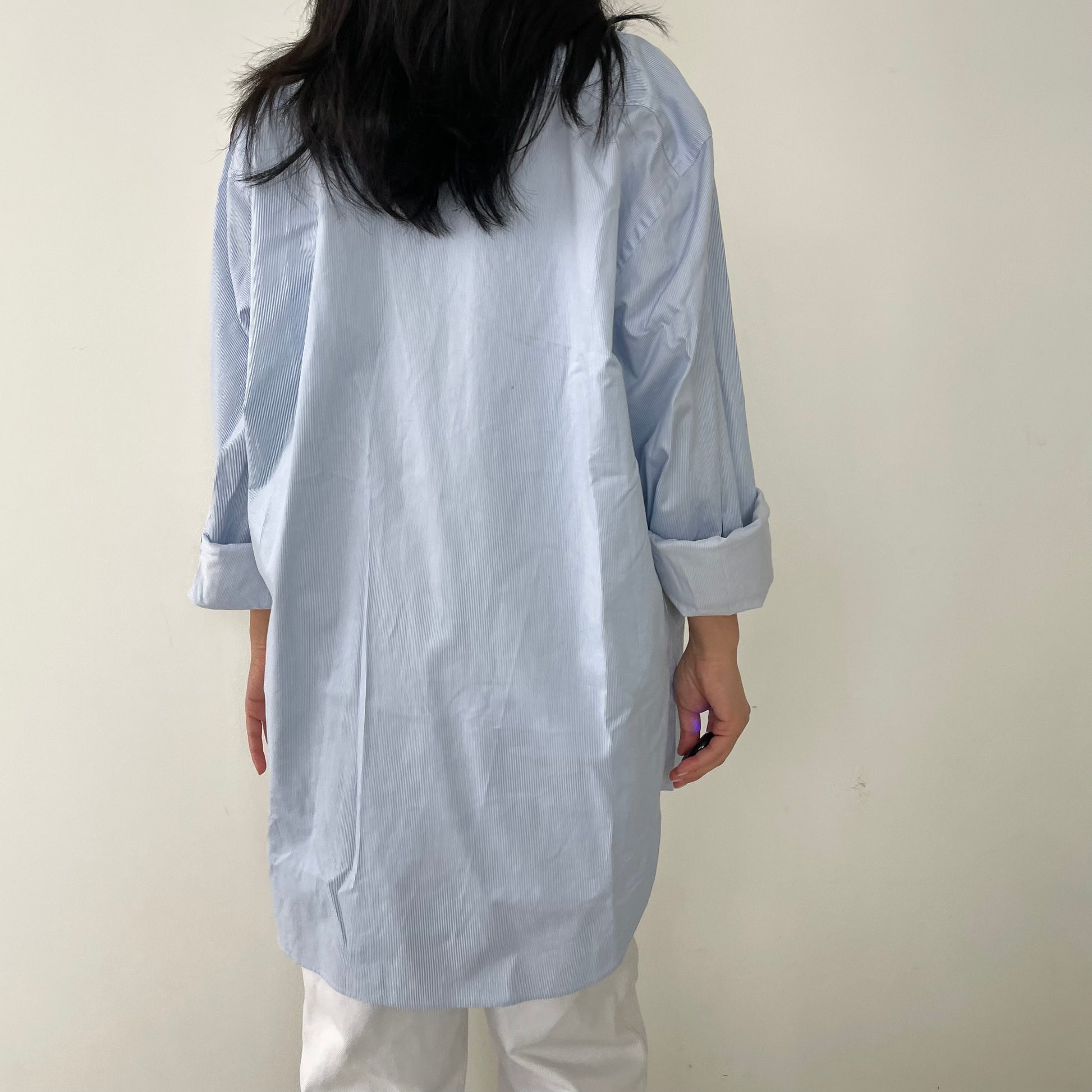 - Details: Sky blue and white vertical stripes; button down men's dress shirt; RRP $395+