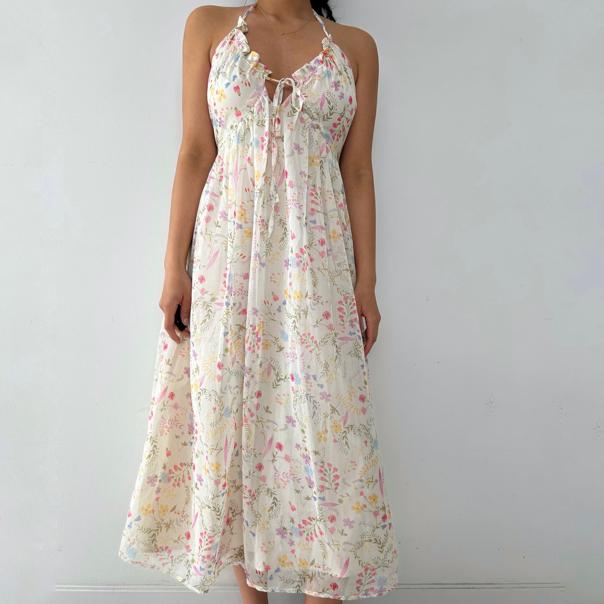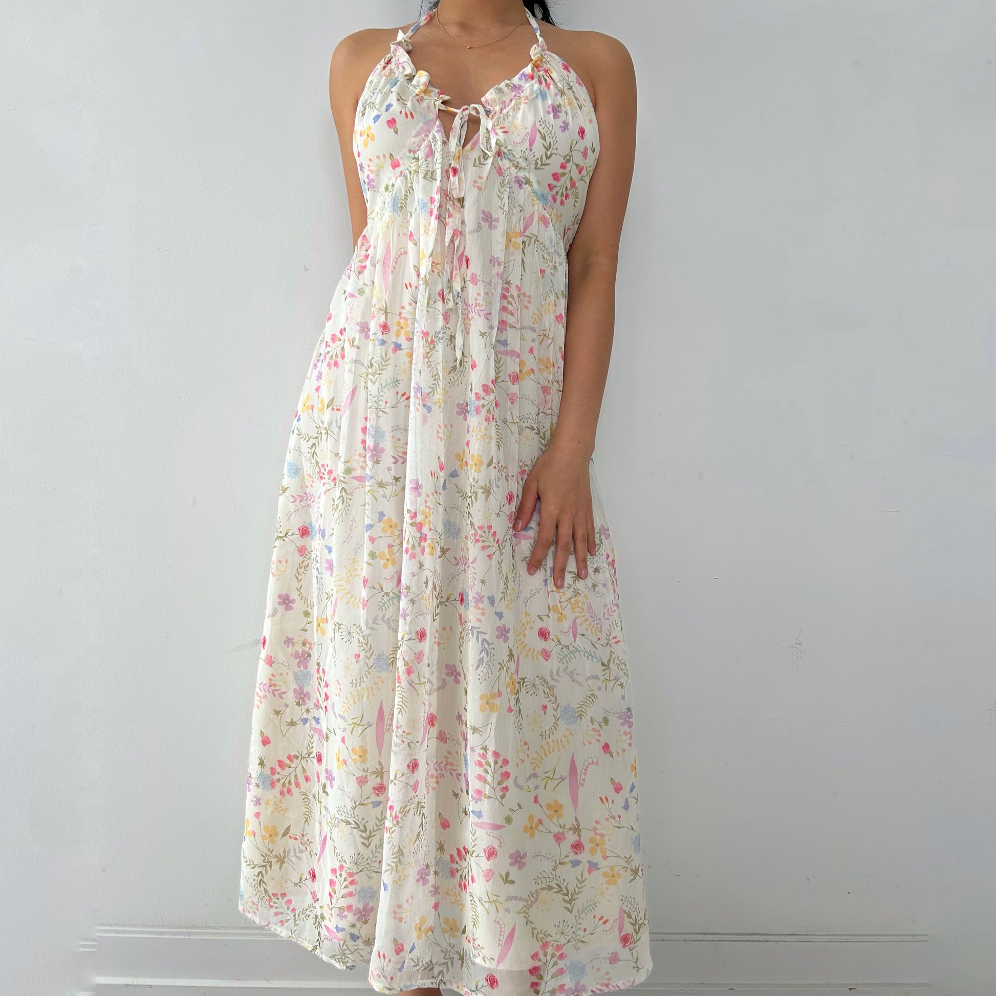 - Details: Tie back; halter neck maxi dress; cream floral print