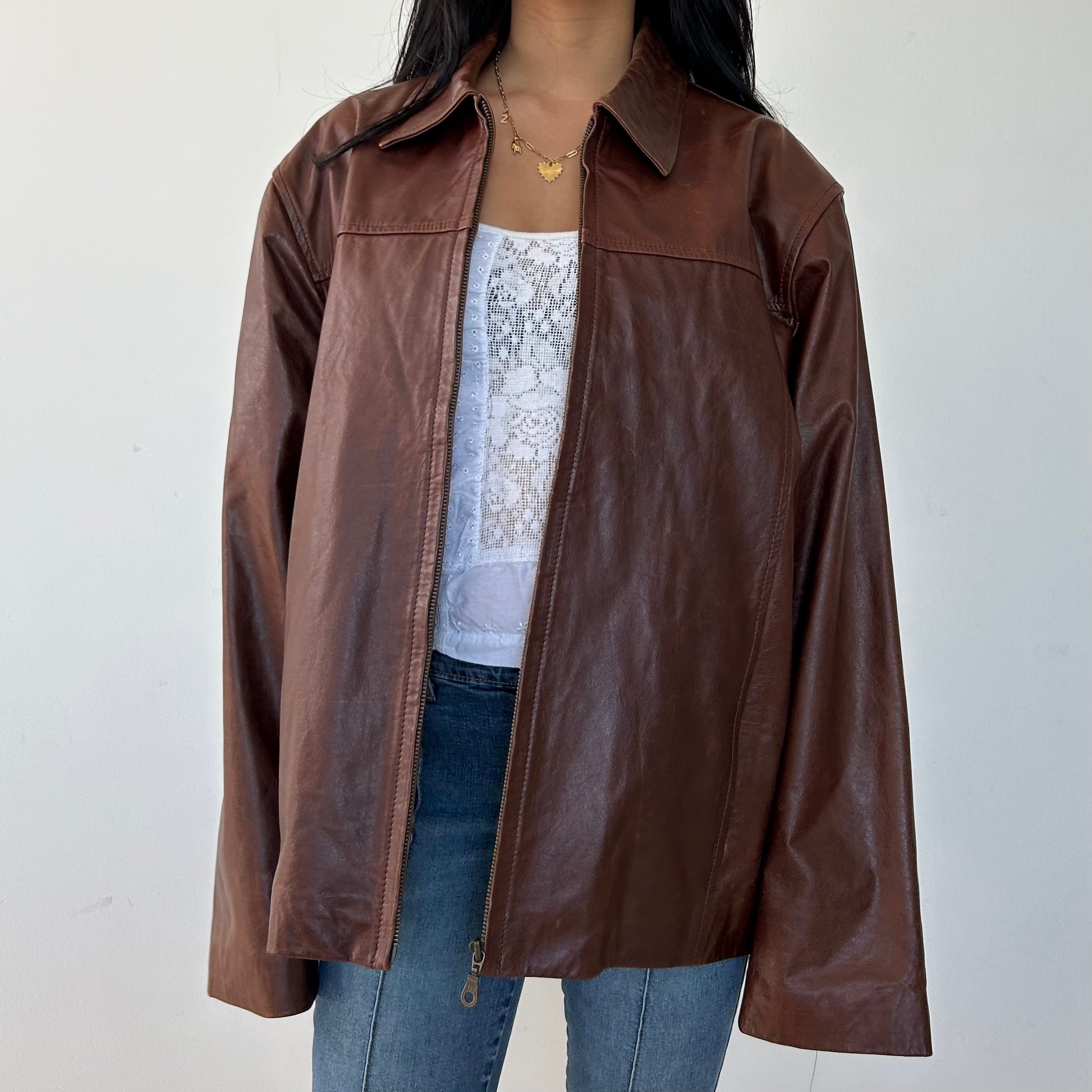 - Details: Classic brown leather jacket; silver zip closure; seam pockets; spread collar; full satin lining