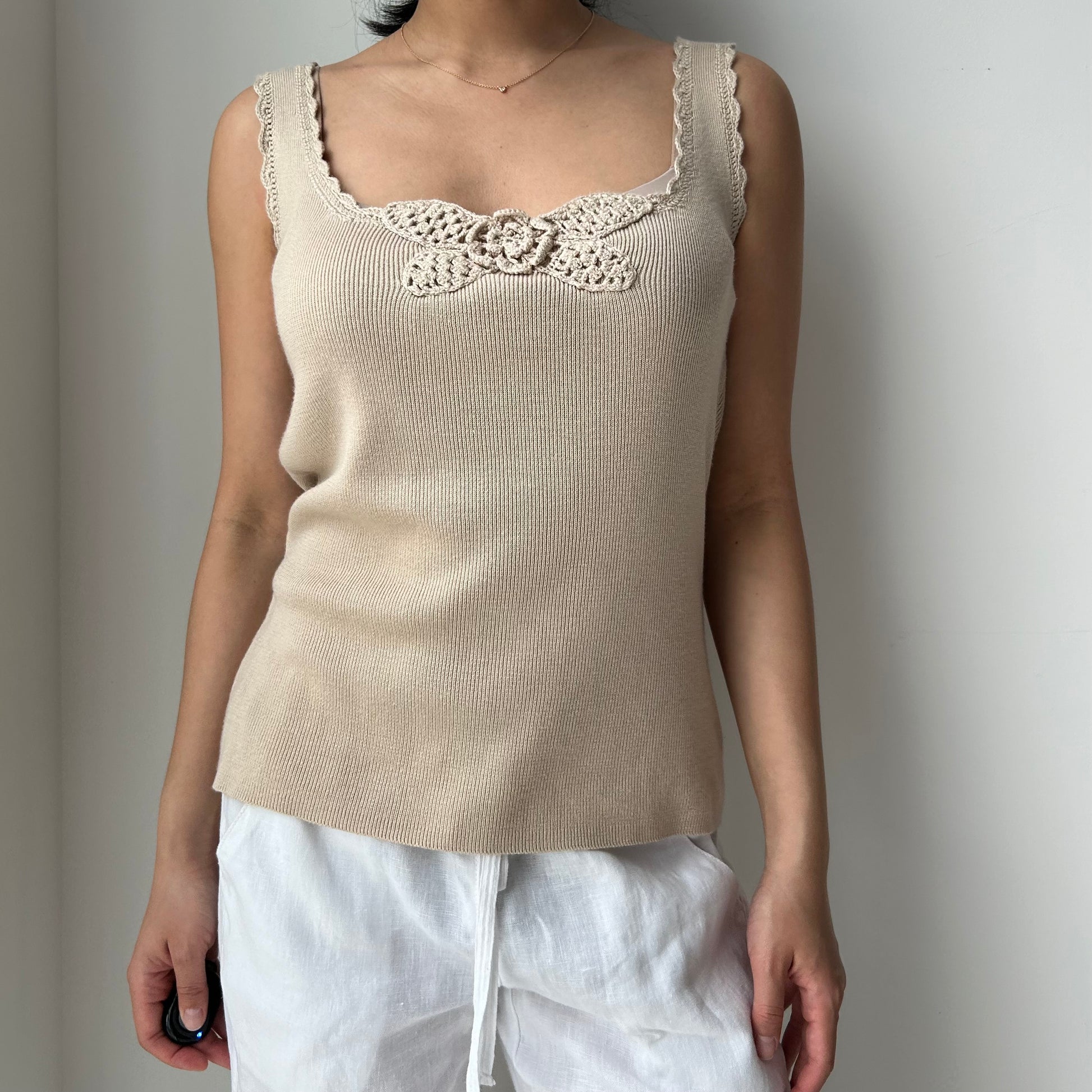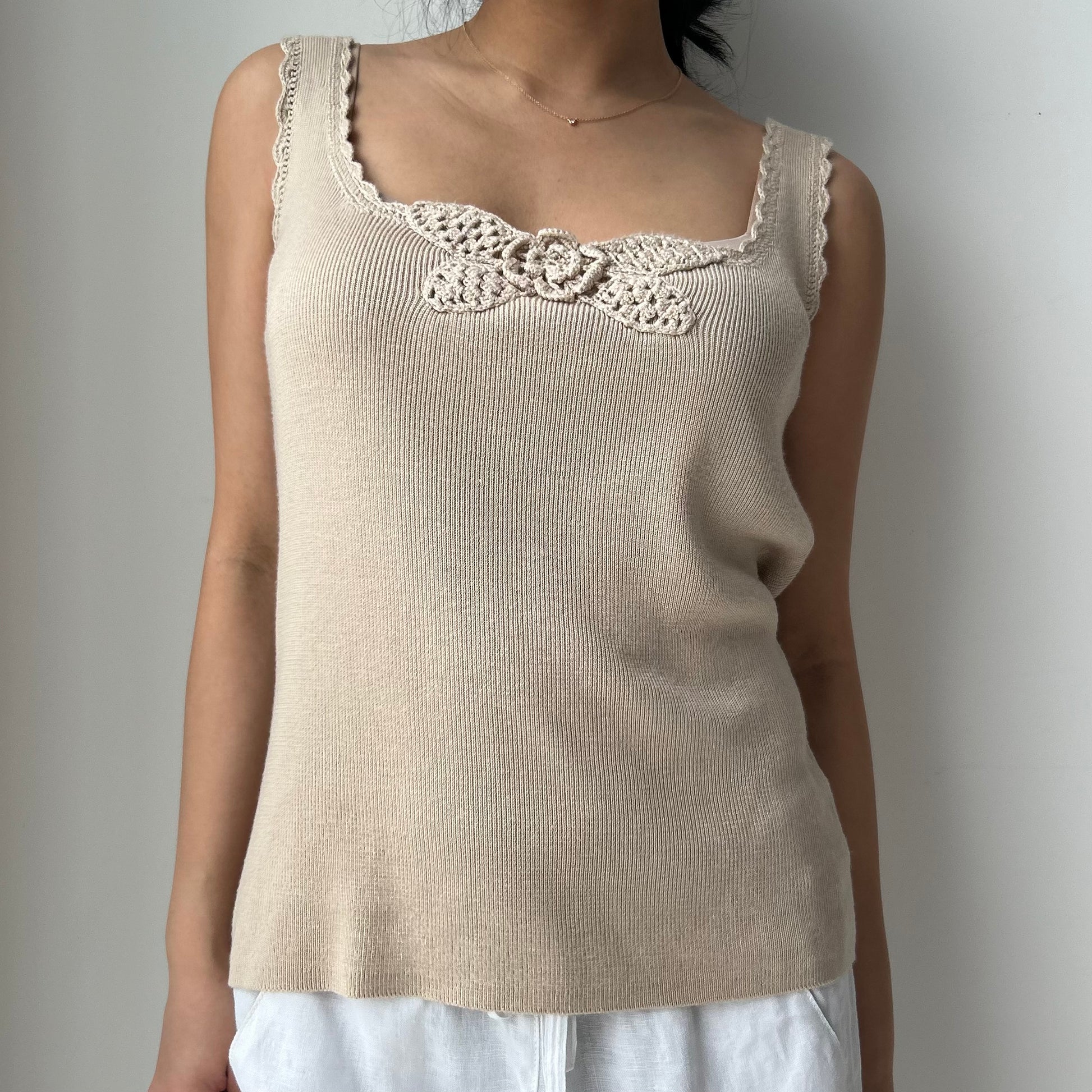 - Details: Scallop trim straps; floral knit embroidery at front; beige knit tank top