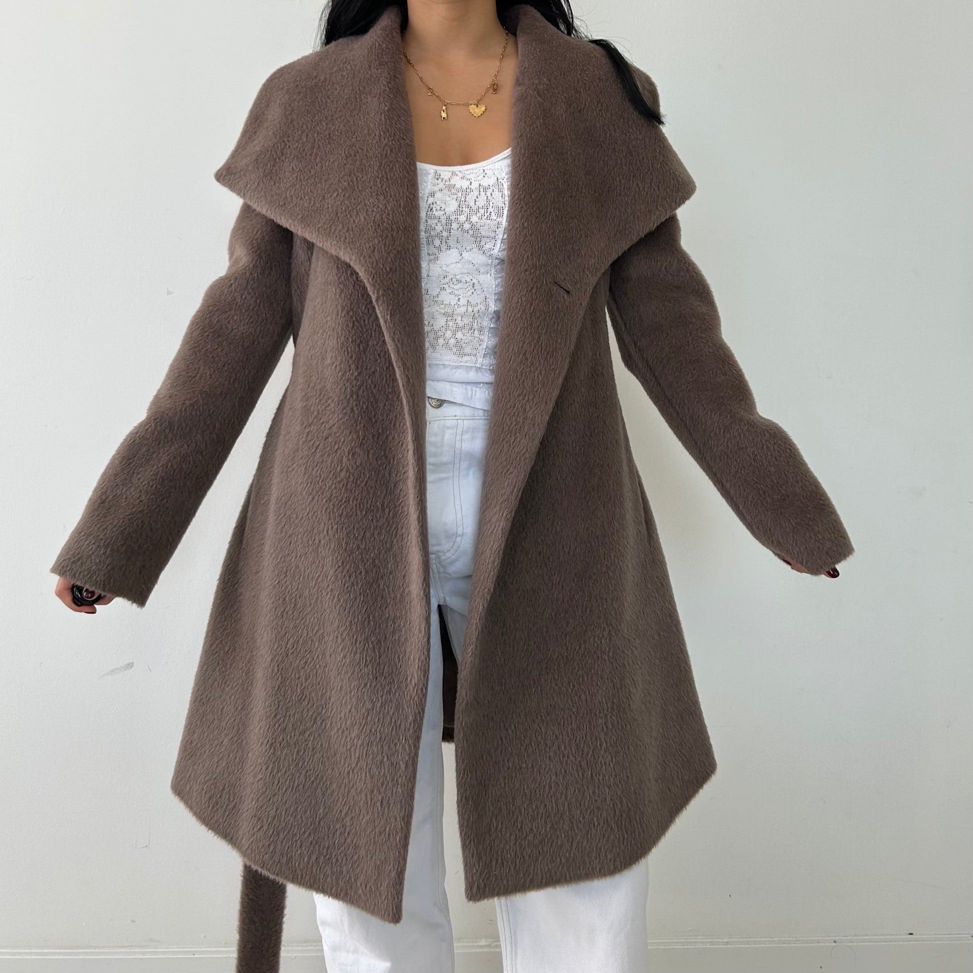 Details: RRP $1493 CAD; the 'Hannah' coat; taupe double-faced wool and alpaca blend wrap coat; large wing collar; tie belt; angled slit pockets; double lined
