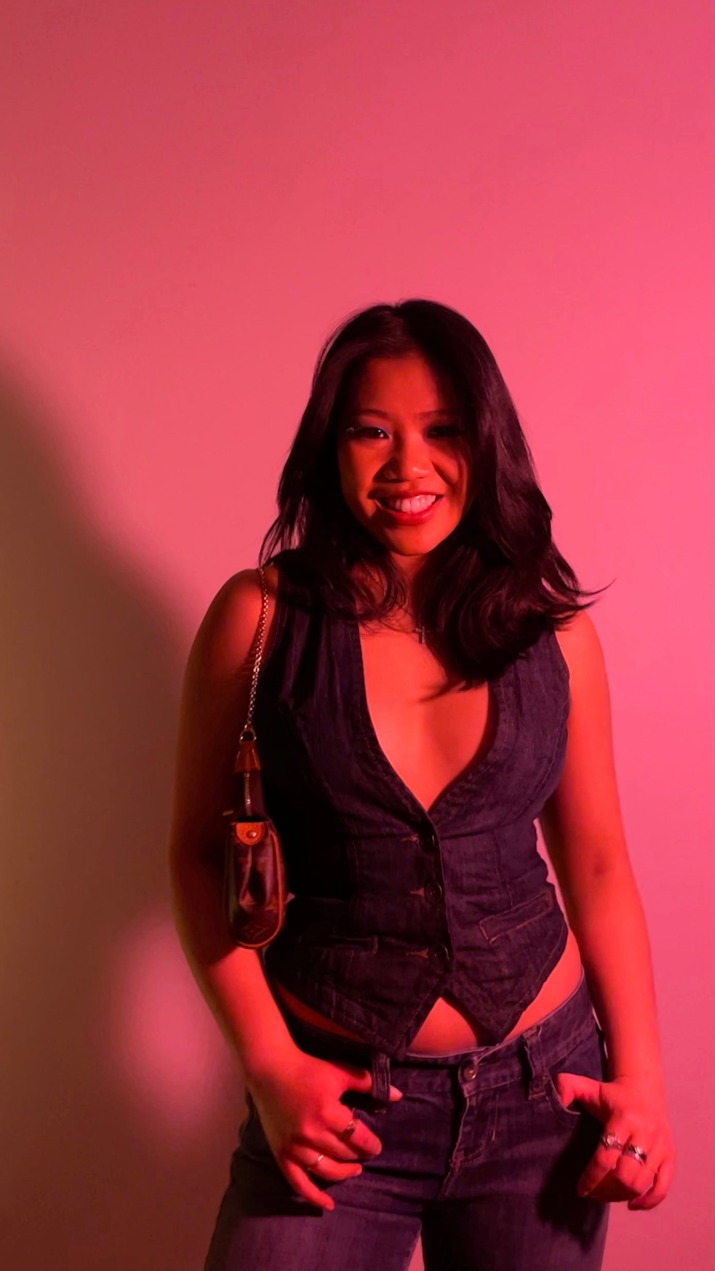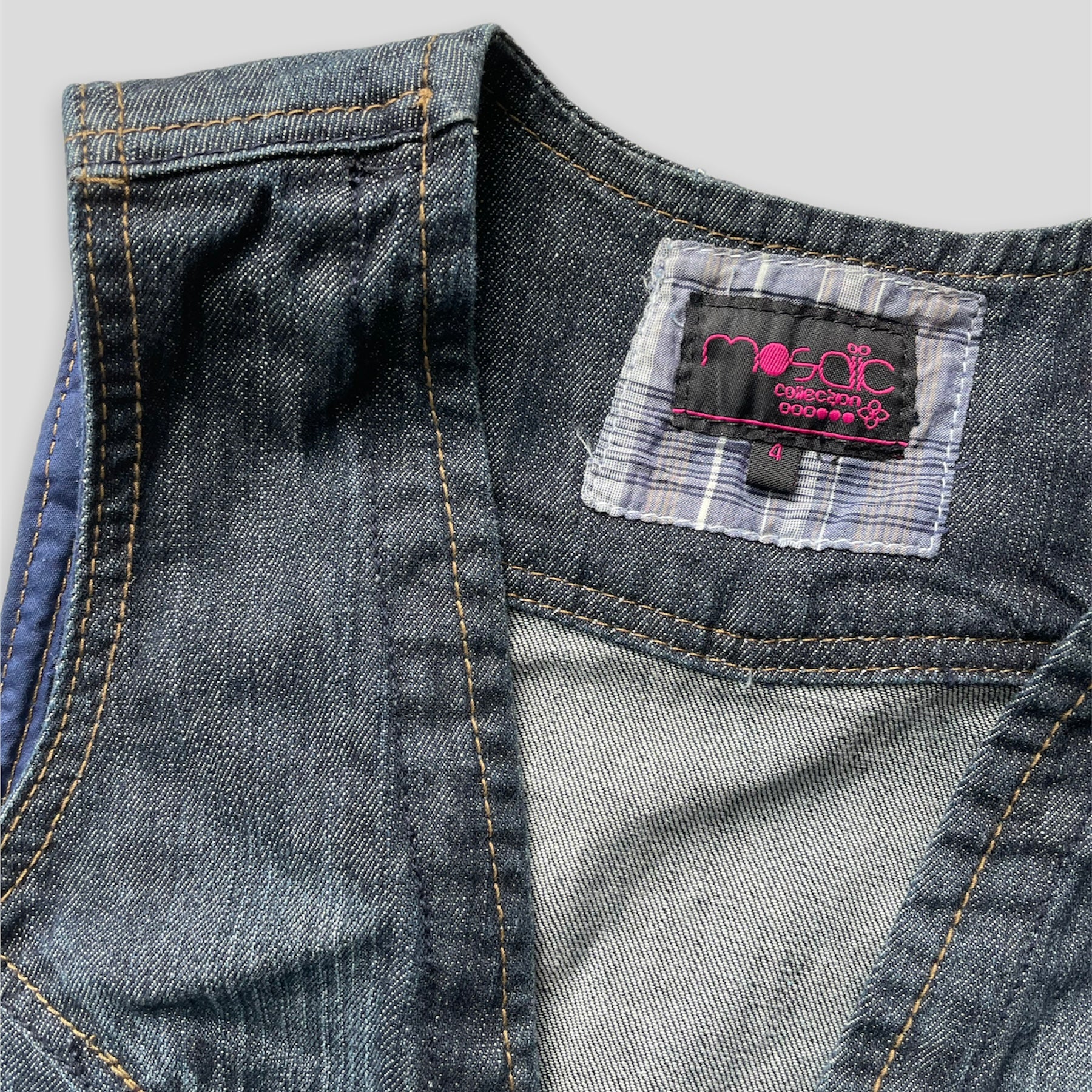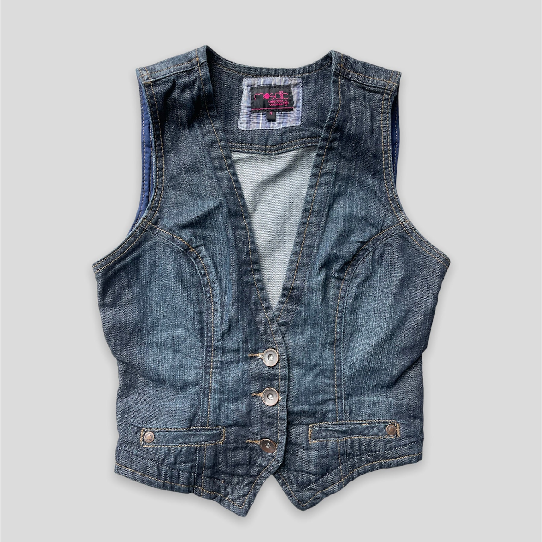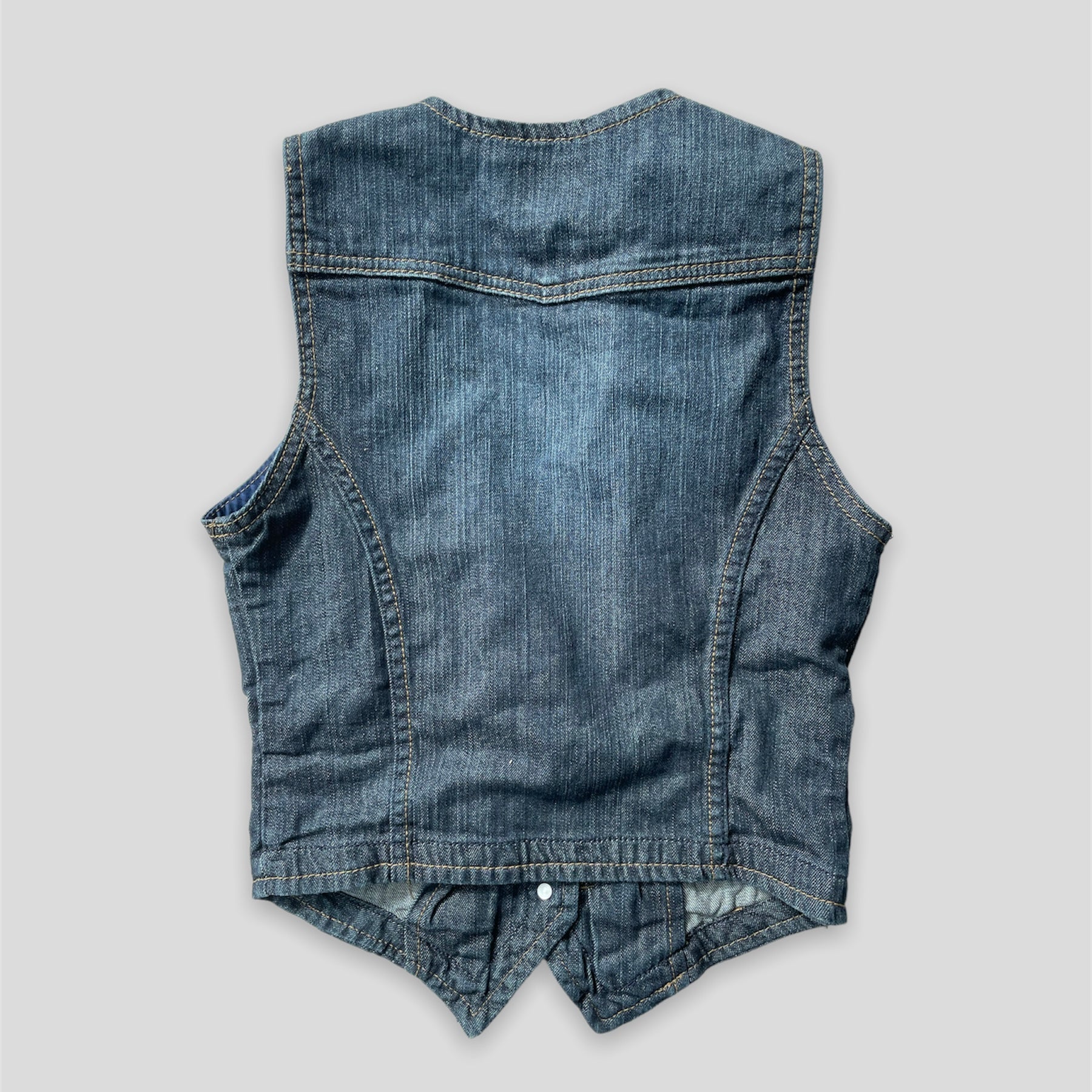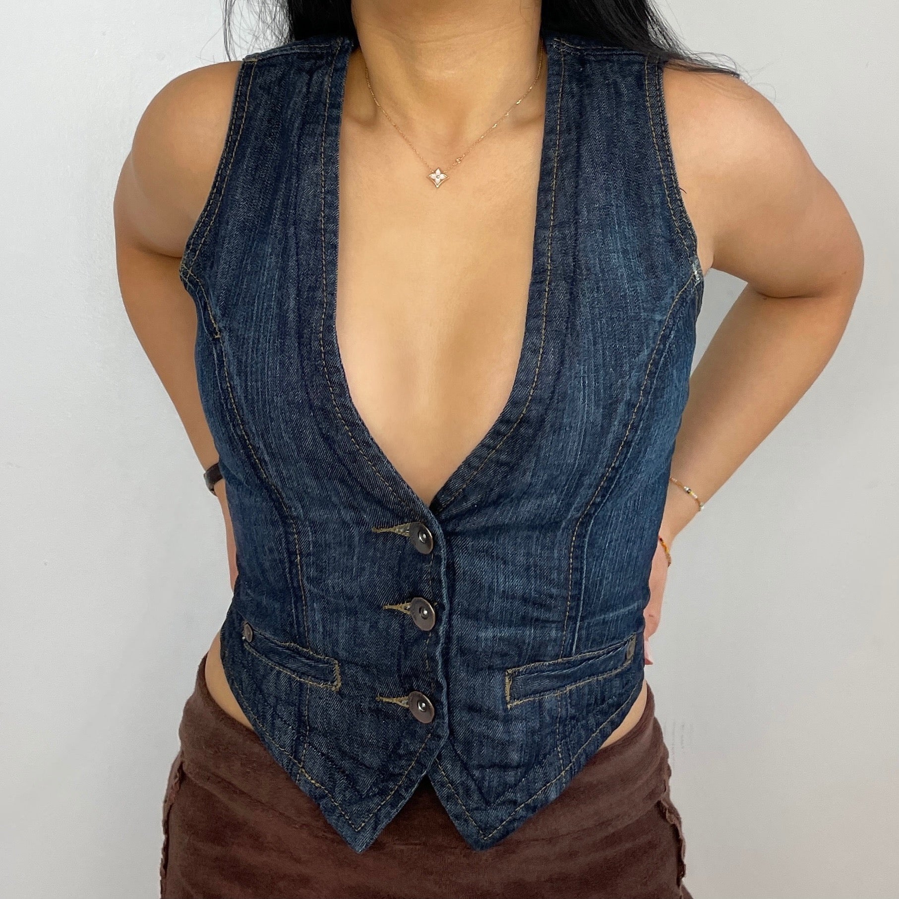 - Details: 3 front buttons; cropped; indigo denim vest with contrast brown stitching