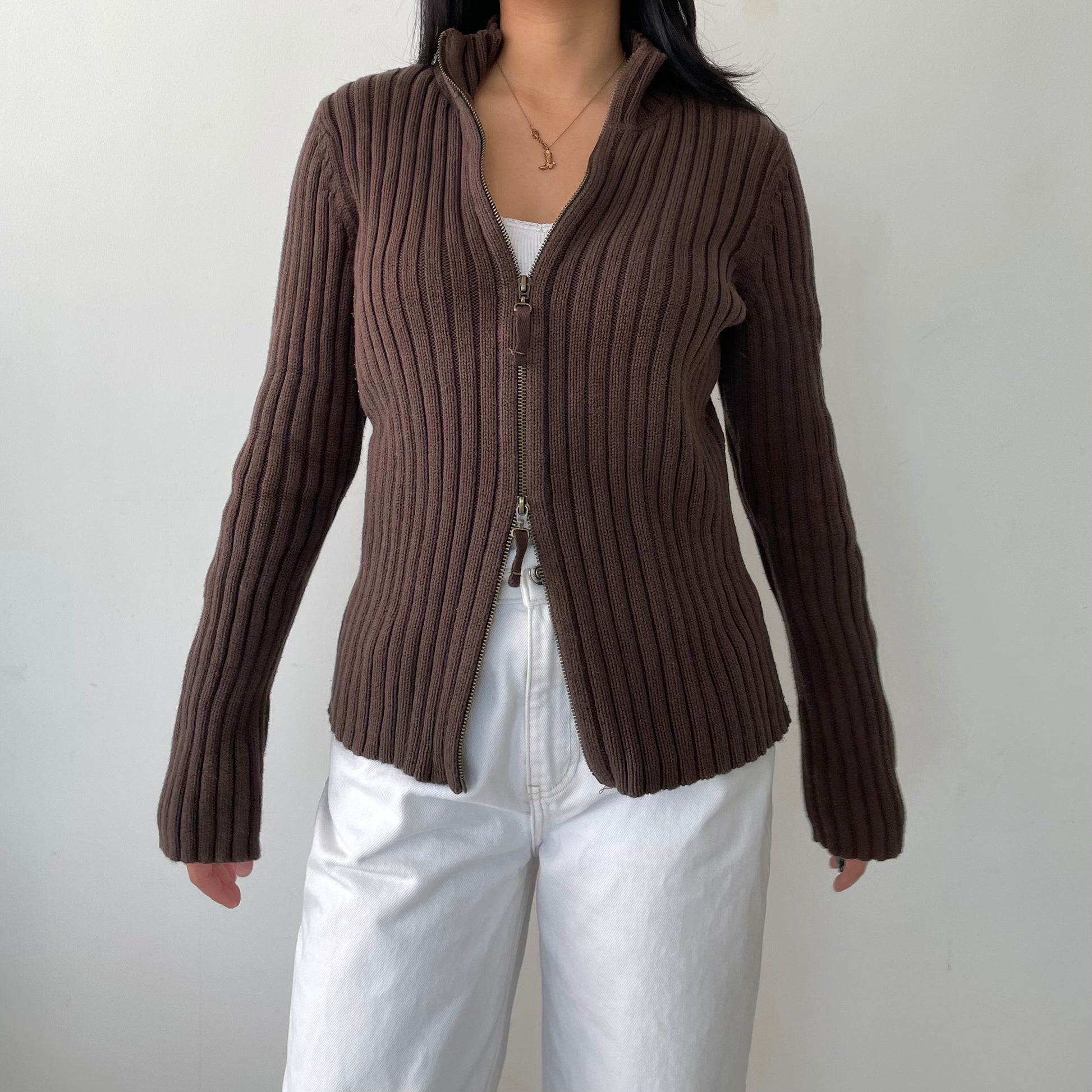 - Details: Insane brown knit sweater with a ribbed material, double zip that zips up to a turtleneck, long sleeves, and an extremely flattering fit. Perfect for the fall, major Gilmore Girls vibes!
