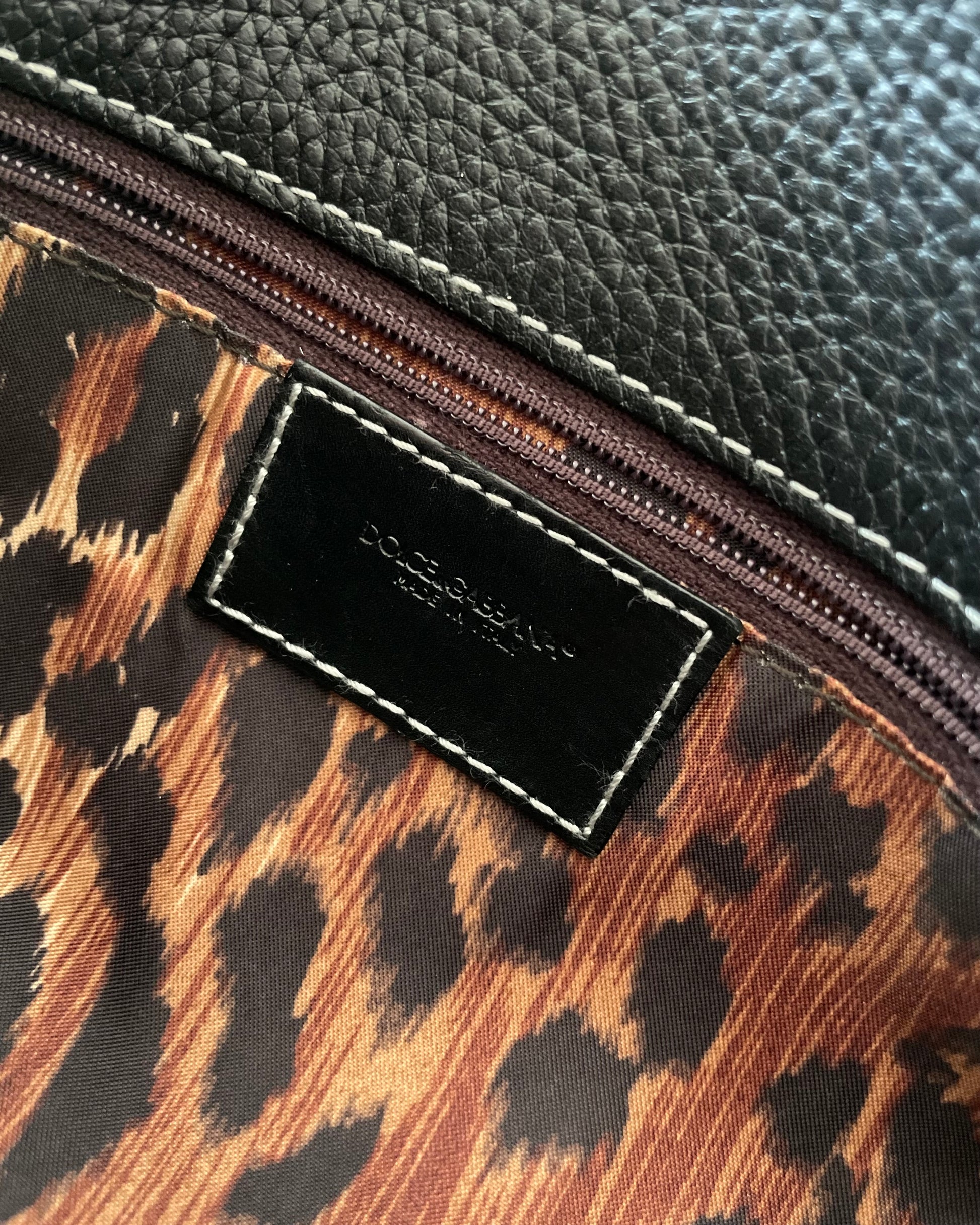 - Details: Leopard print on the inside; no dust bag; black pebbled leather shoulder bag with silver hardware; circle detail and magnetic button clasp; D&G silver metal keychain detail