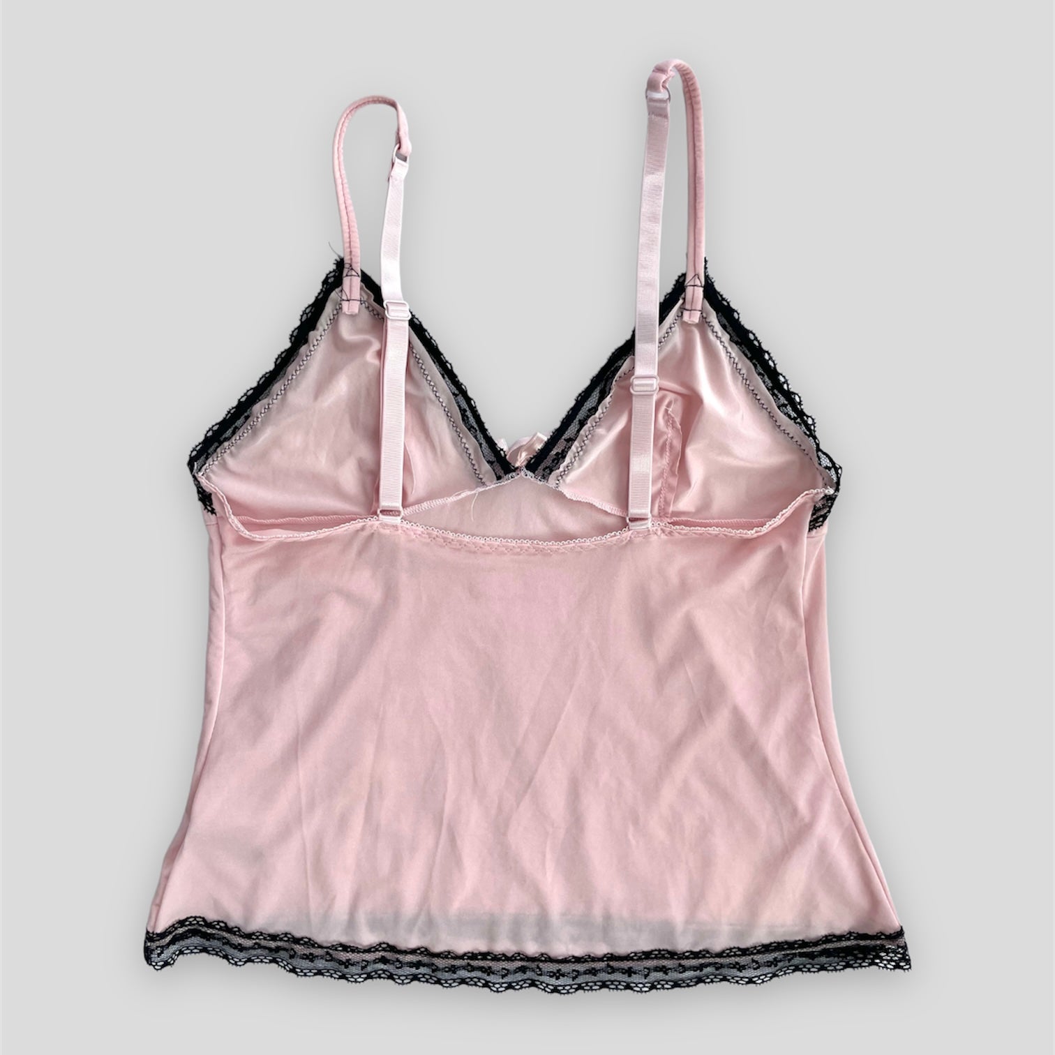 - Details: The cutest dainty pink bow cami top with adjustable straps, and a black lace trim