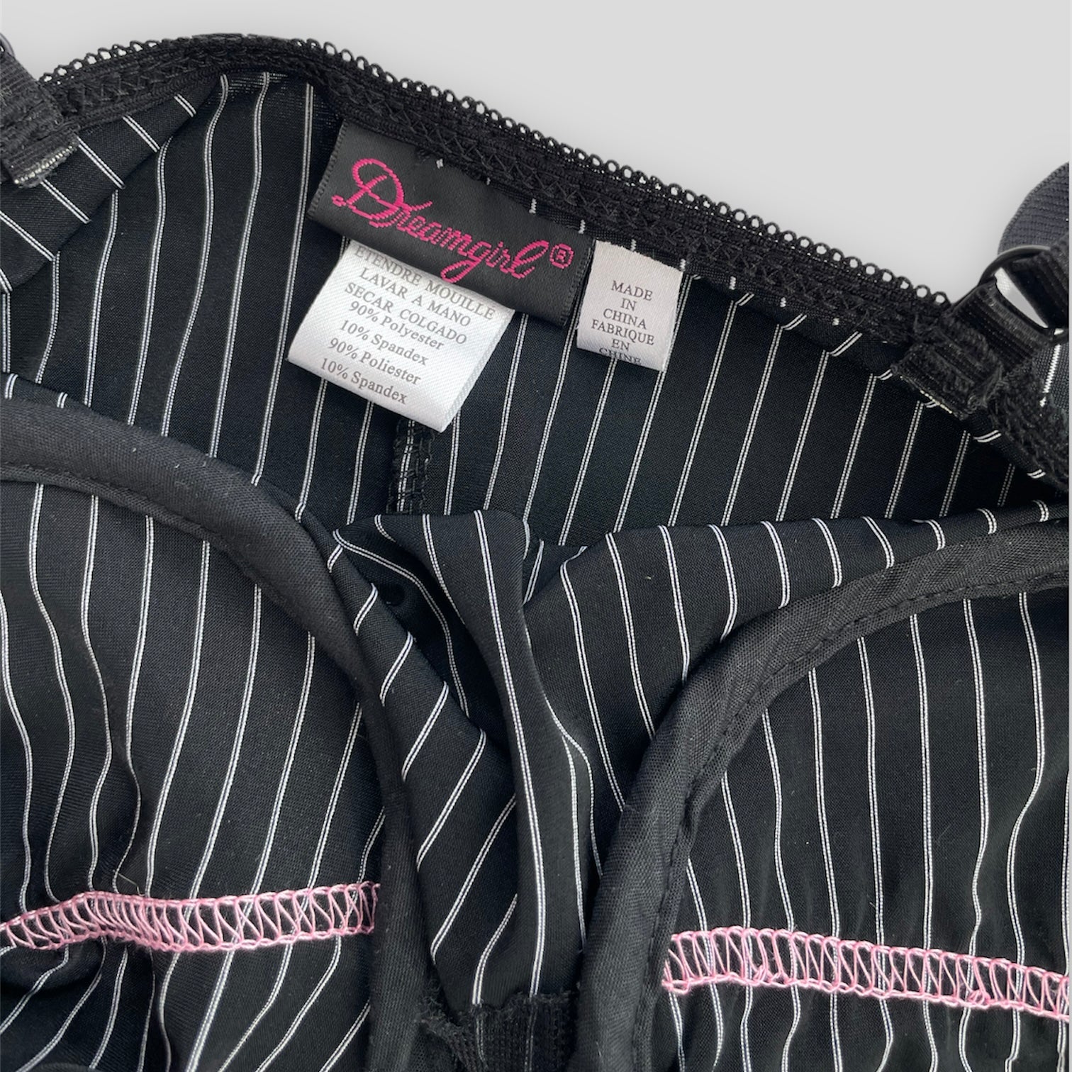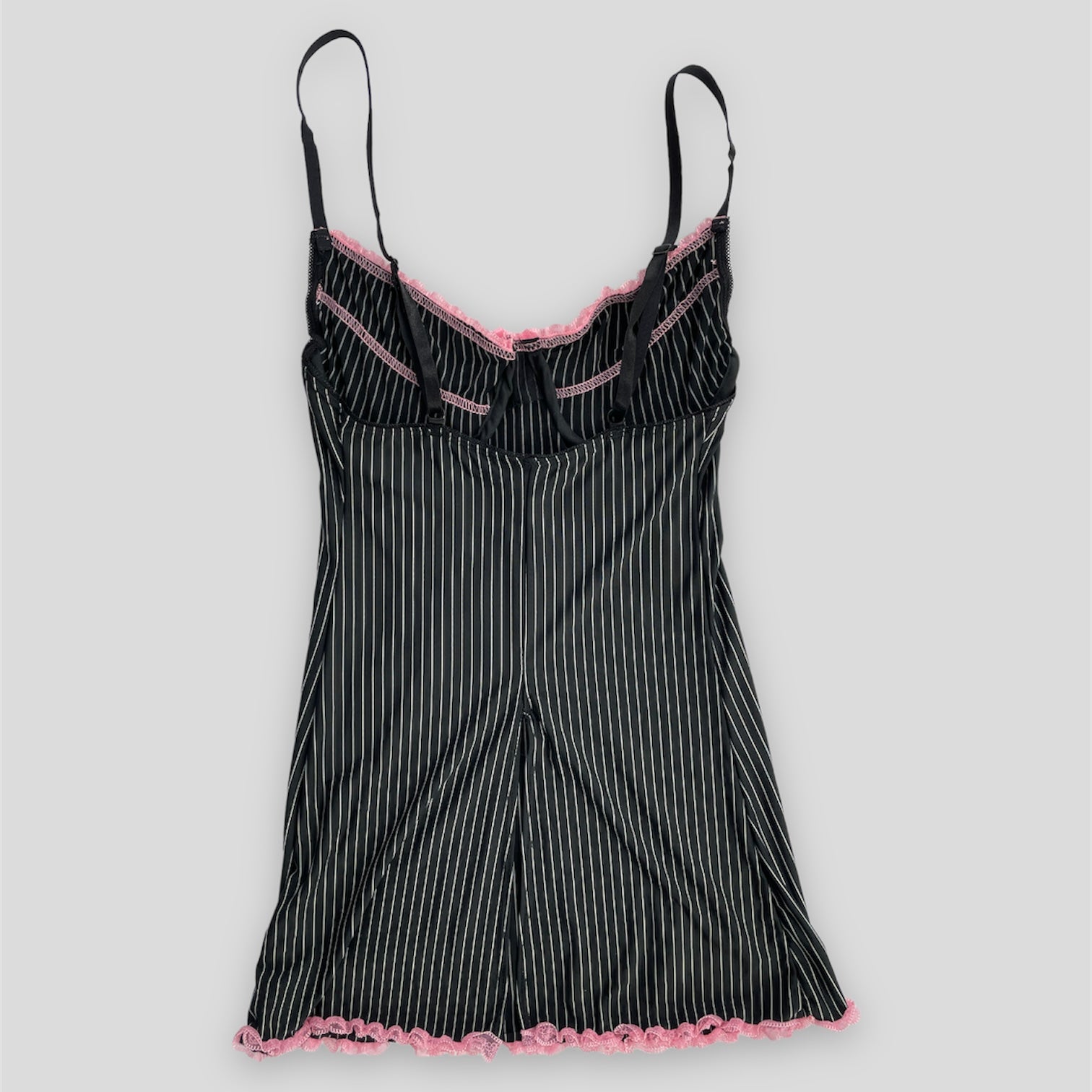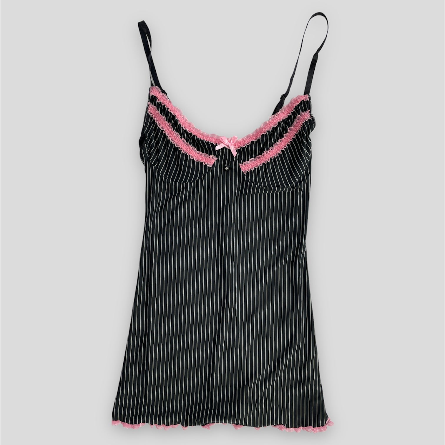 - Details: Pink lace ruffle trim and bow detail; adjustable straps; small open slit and the back; balconette bust area; black gemstone detail; black and white pinstripe tank top