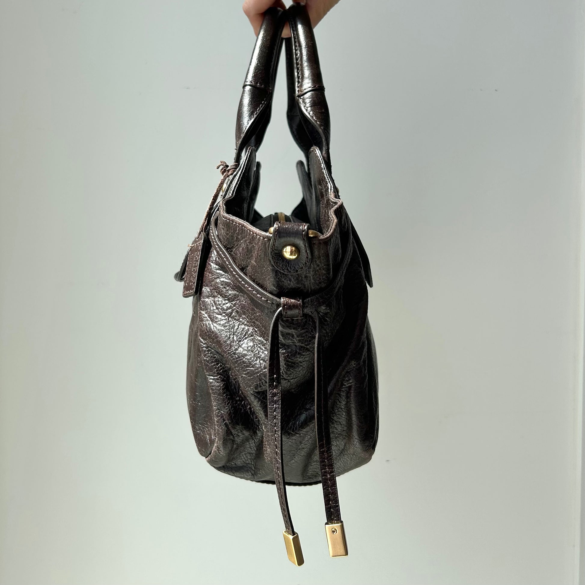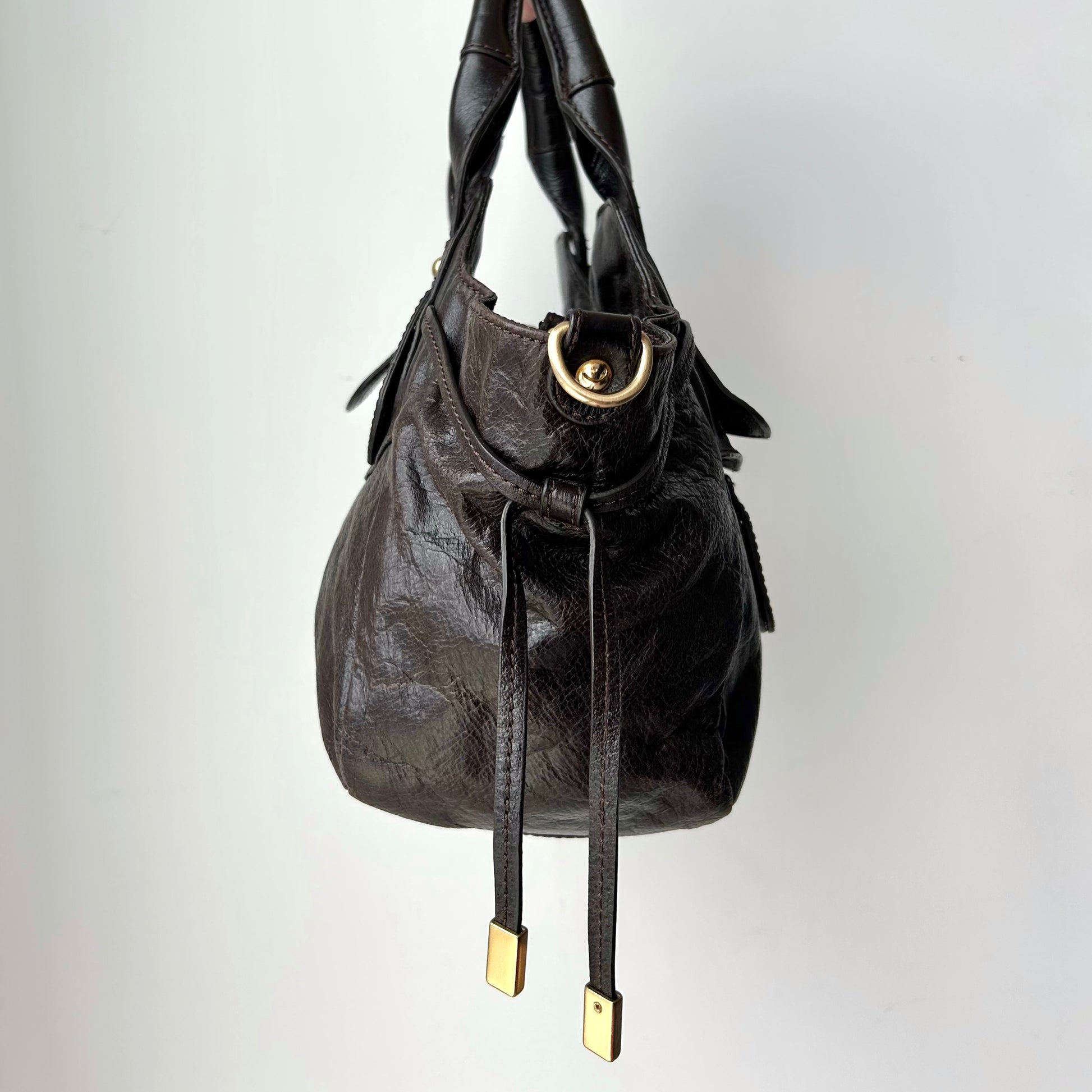 - Details: Brown carryall tote bag; crinkled leather; slouchy structured silhouette; dual top handles; gold-tone hardware accents; spacious main compartment with top zip closure; internal slip pockets and zip pocket; adjustable drawstring details at sides; logo hangtag