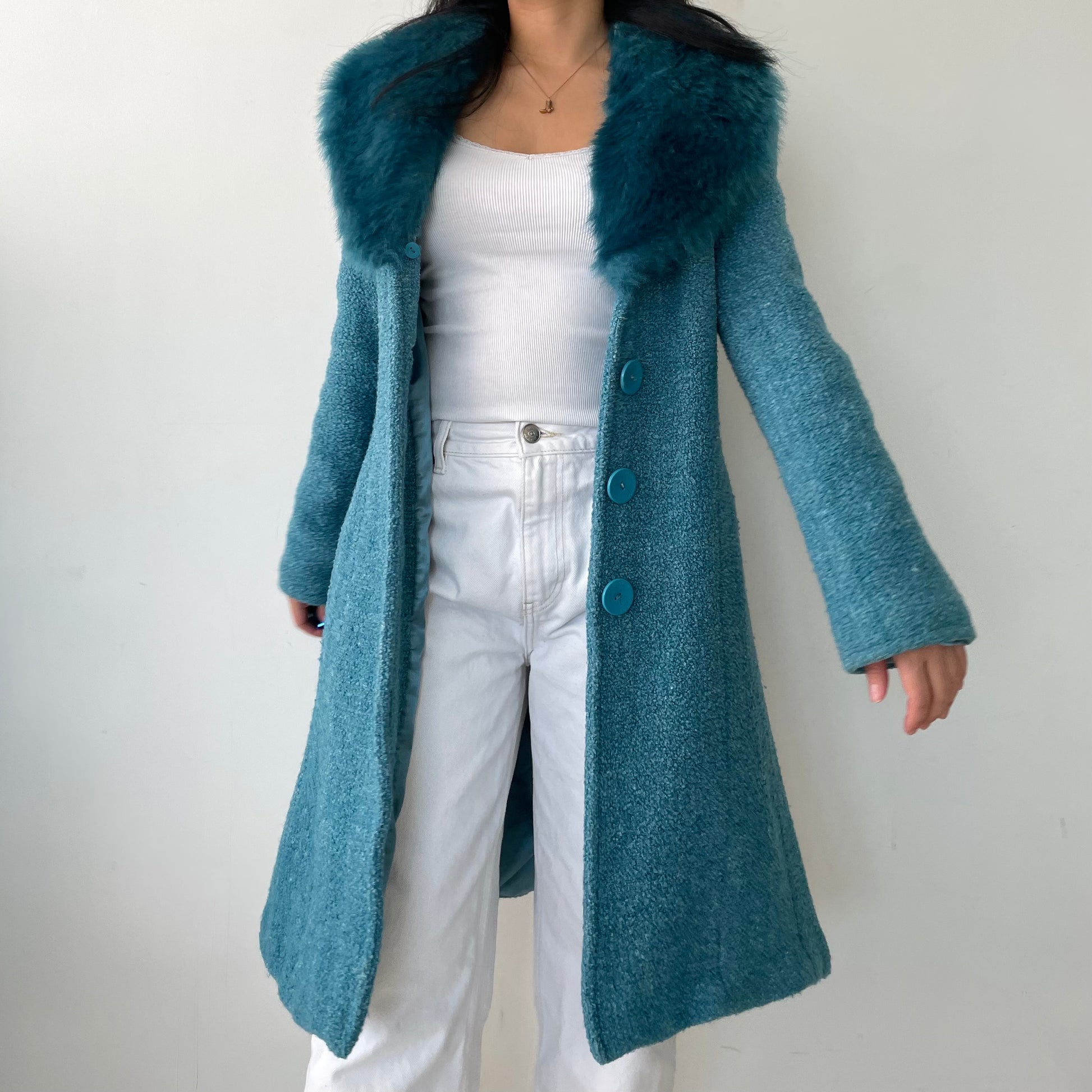- Details: Turquoise faux fur trim long coat; bouclé texture