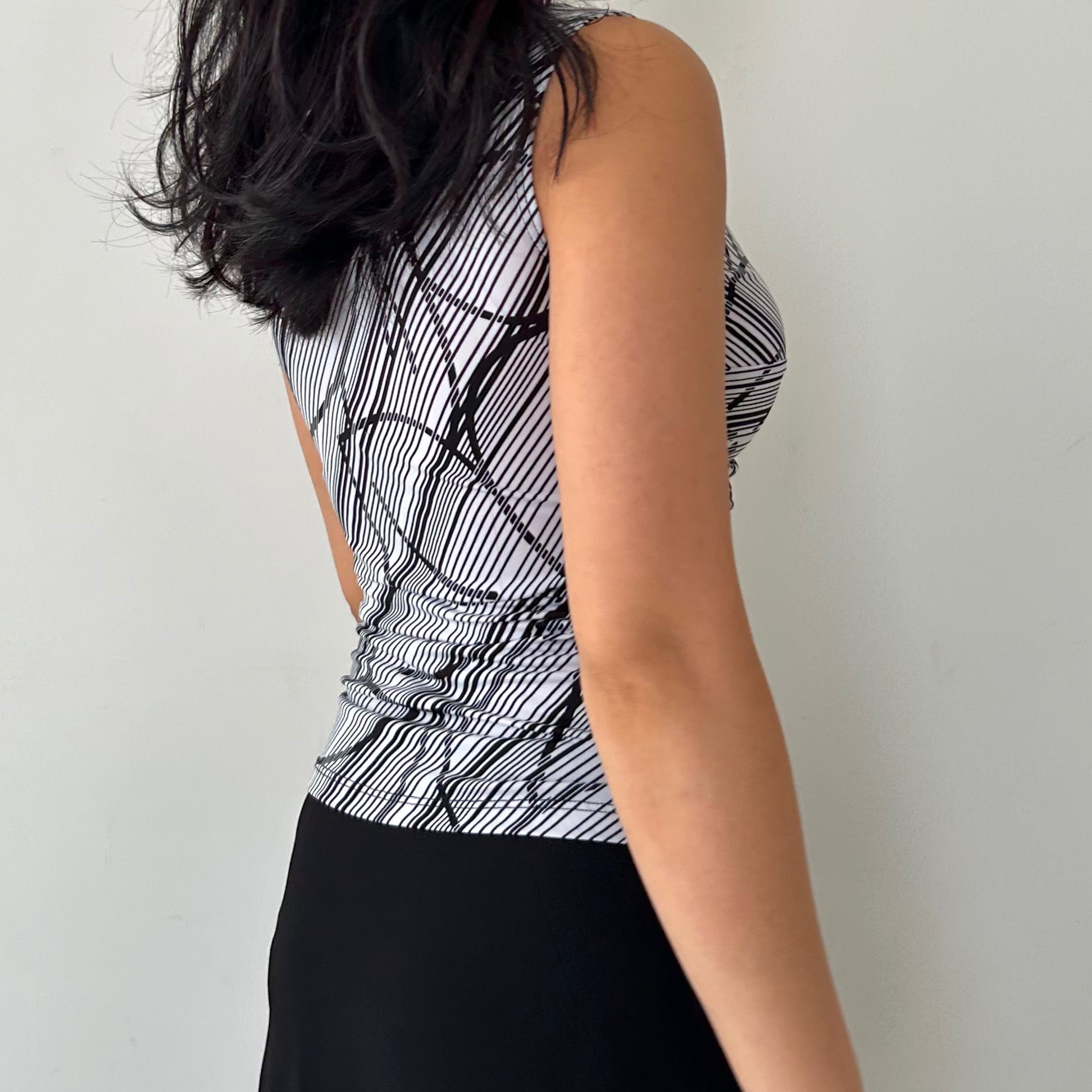 - Details: Sleeveless plunge v-neck tank top; black white striped geometric print floral design; knot front