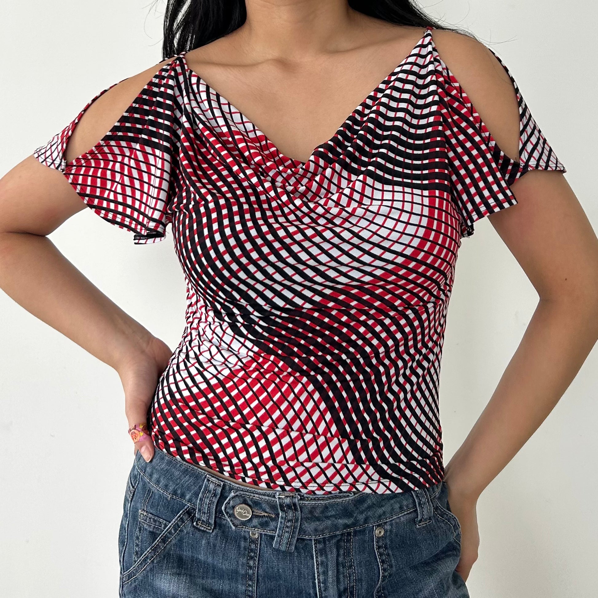 - Details: Red, black, and white geometric grid pattern; cowl neck; cold shoulder; slinky material