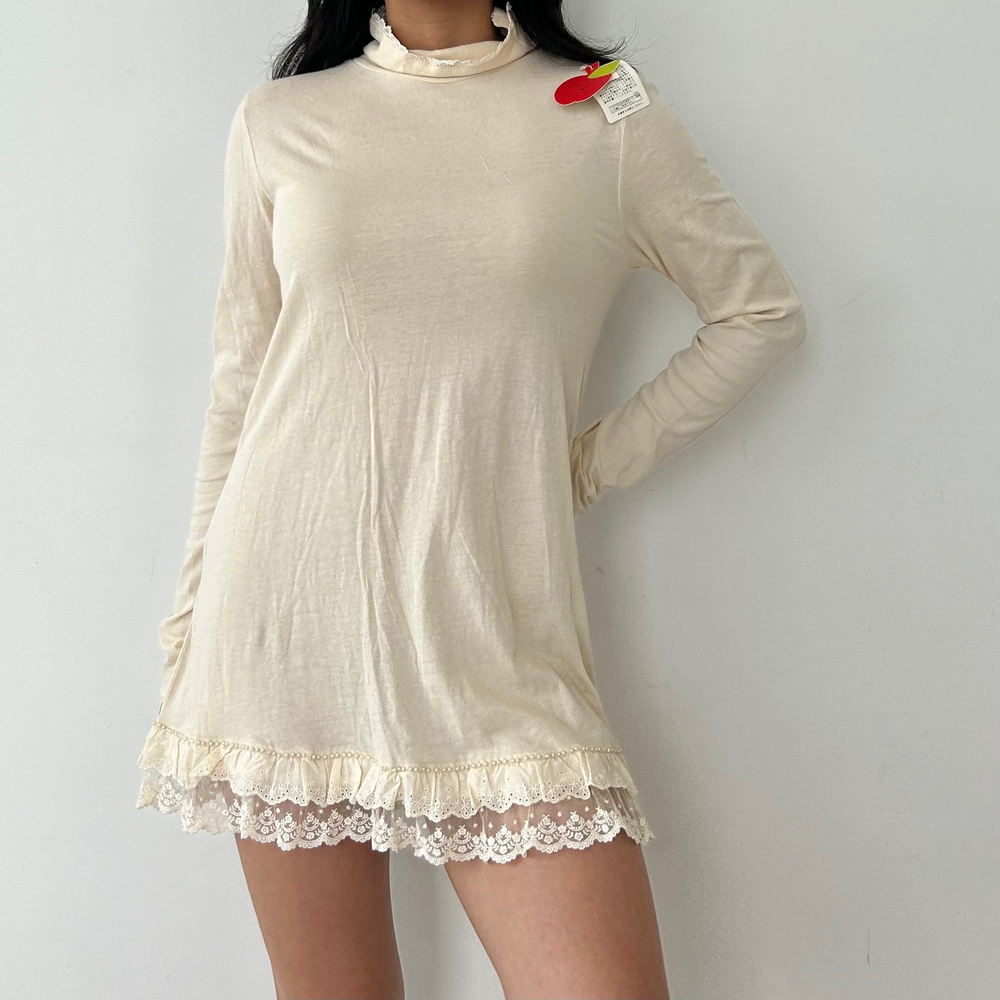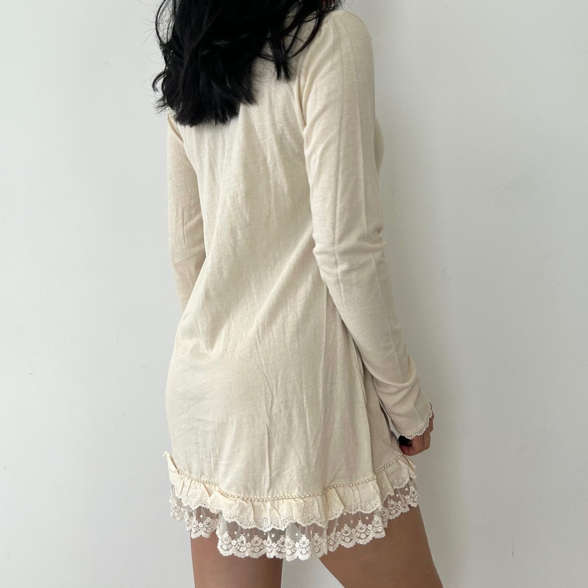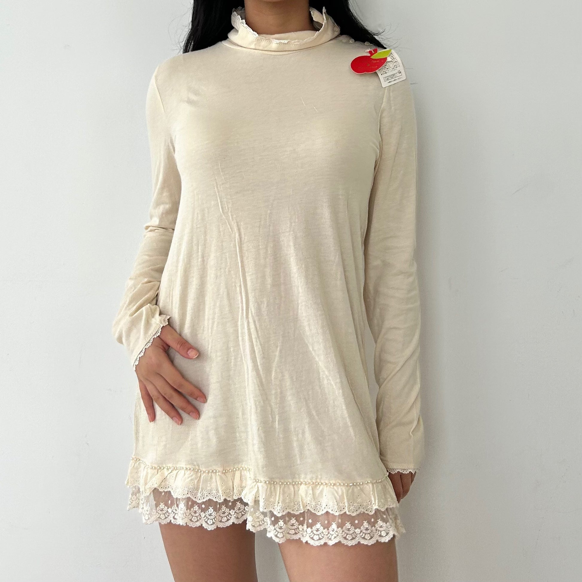 - Details: Pearl bead trim; broderie anglaise and scalloped trim hem; long sleeves; buttons on the side of the mock neck