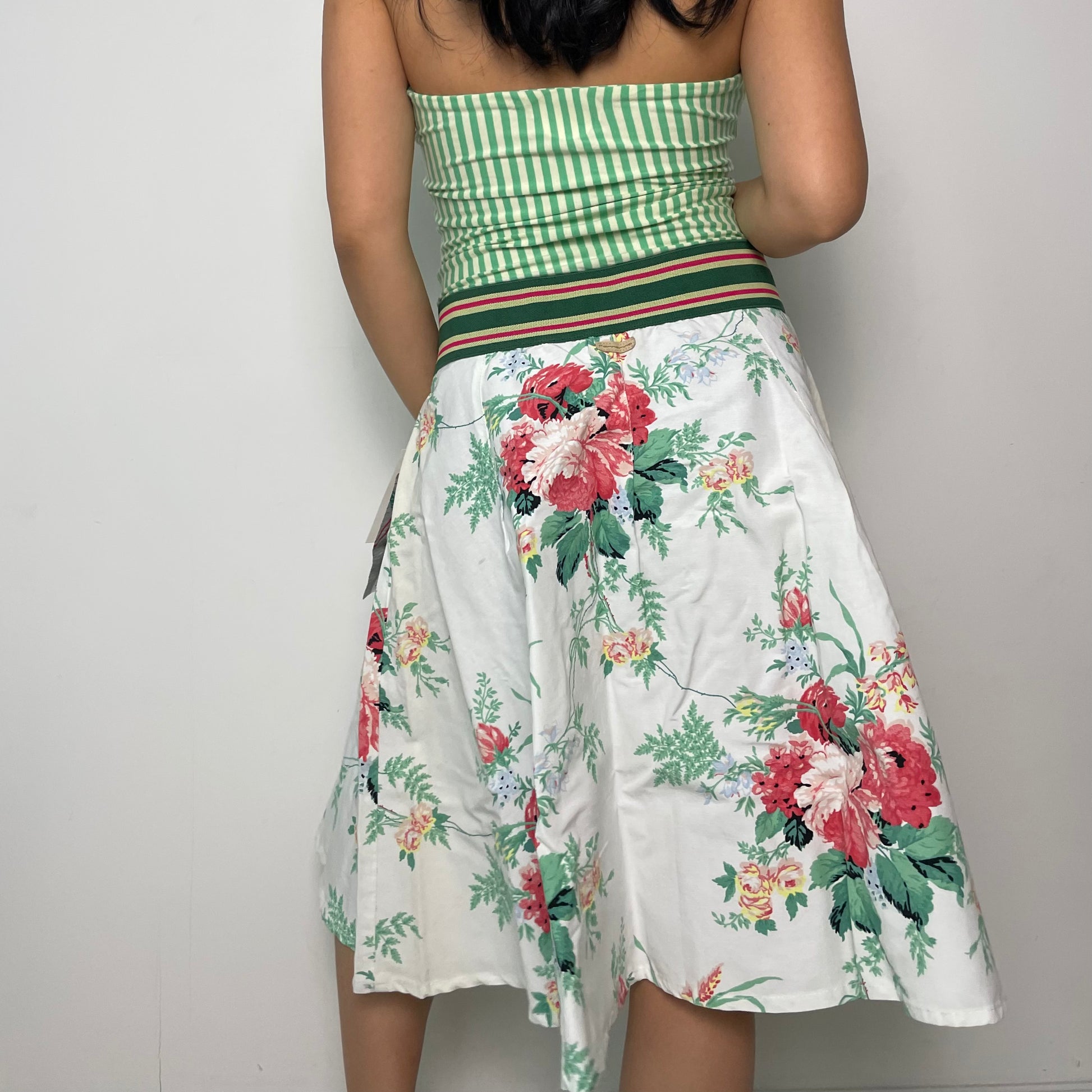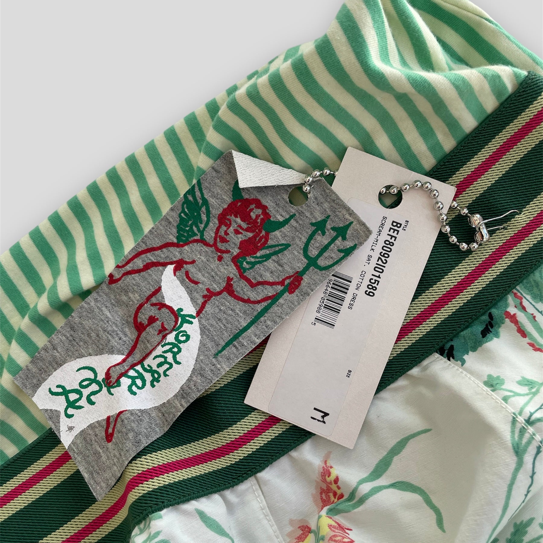 - Details: Green striped halter dress with red and yellow sequinned text on the bust; green, yellow, and pink horizontally striped elasticated waistband; pink and green floral print on a white cotton skirt