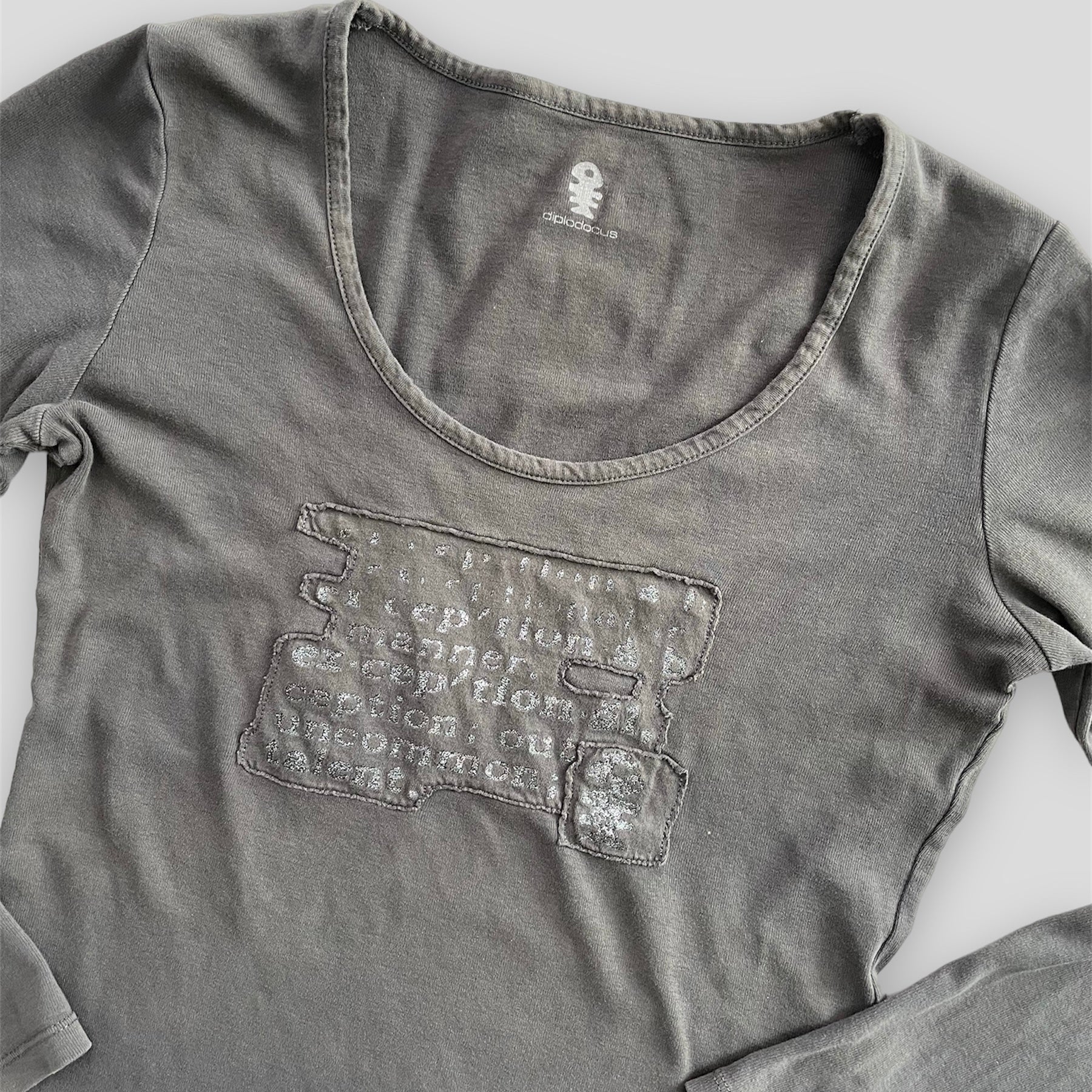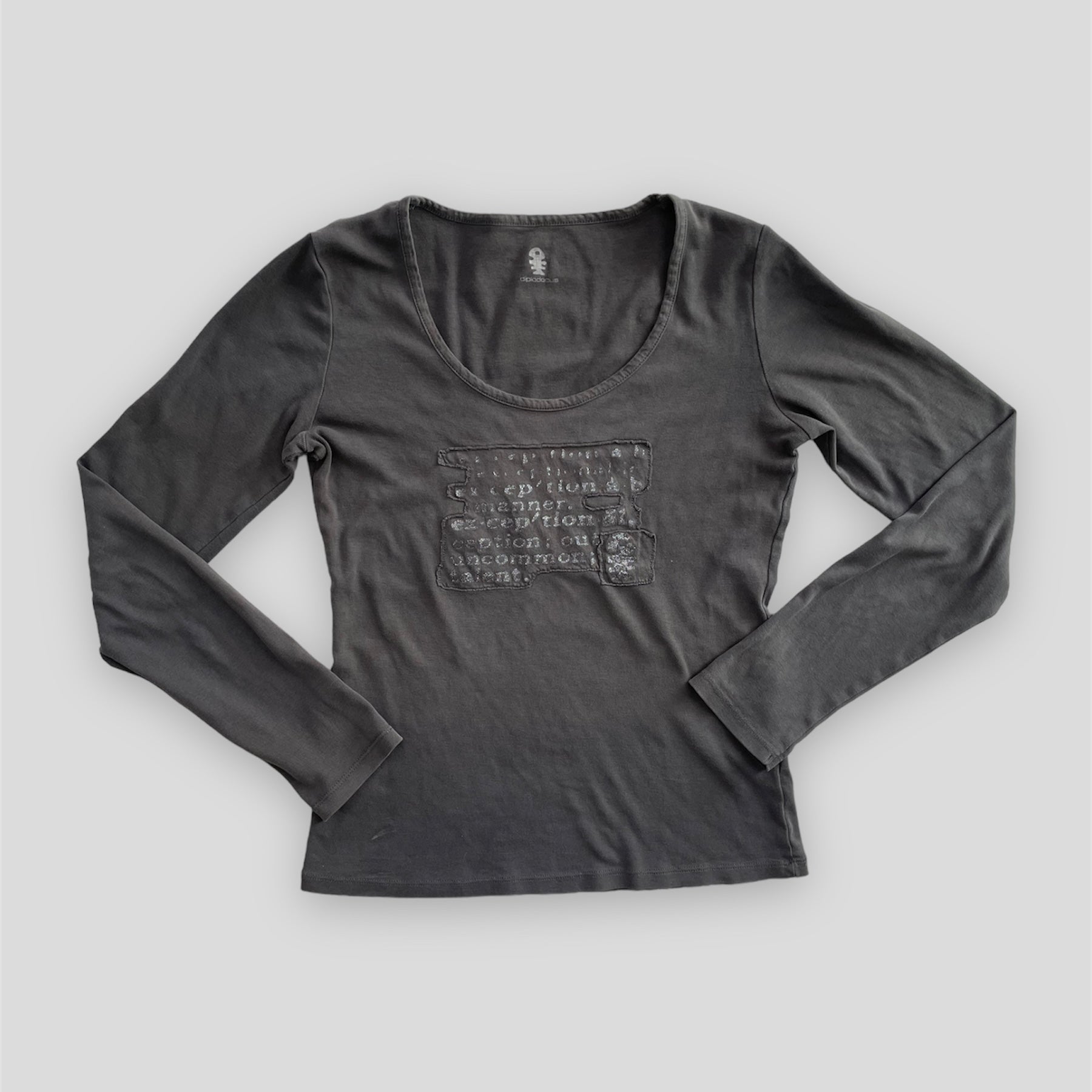 - Details: Long sleeve scoop neck grey t-shirt; printed text design on the front