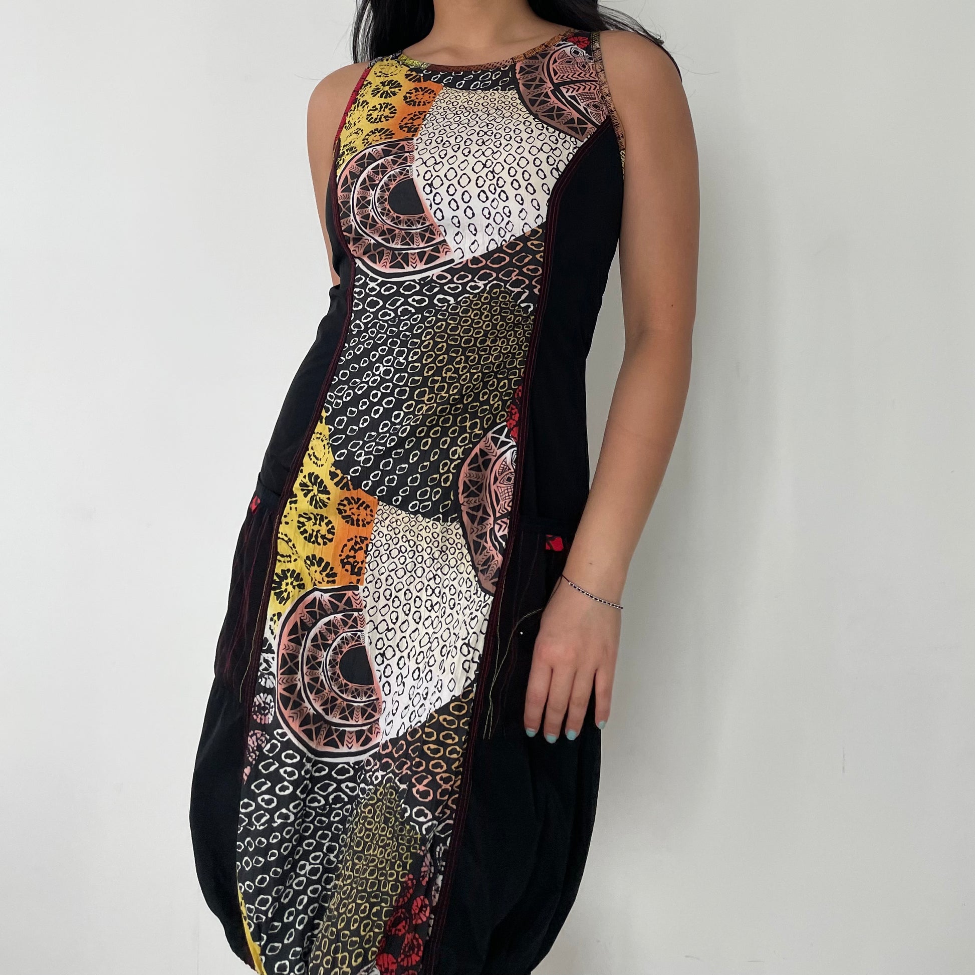 - Details: Black sleeveless dress; orange, yellow, red, white, and black pattern reminiscent of Cop Copine designs; parachute material; red contrast stitching; concealed side zip