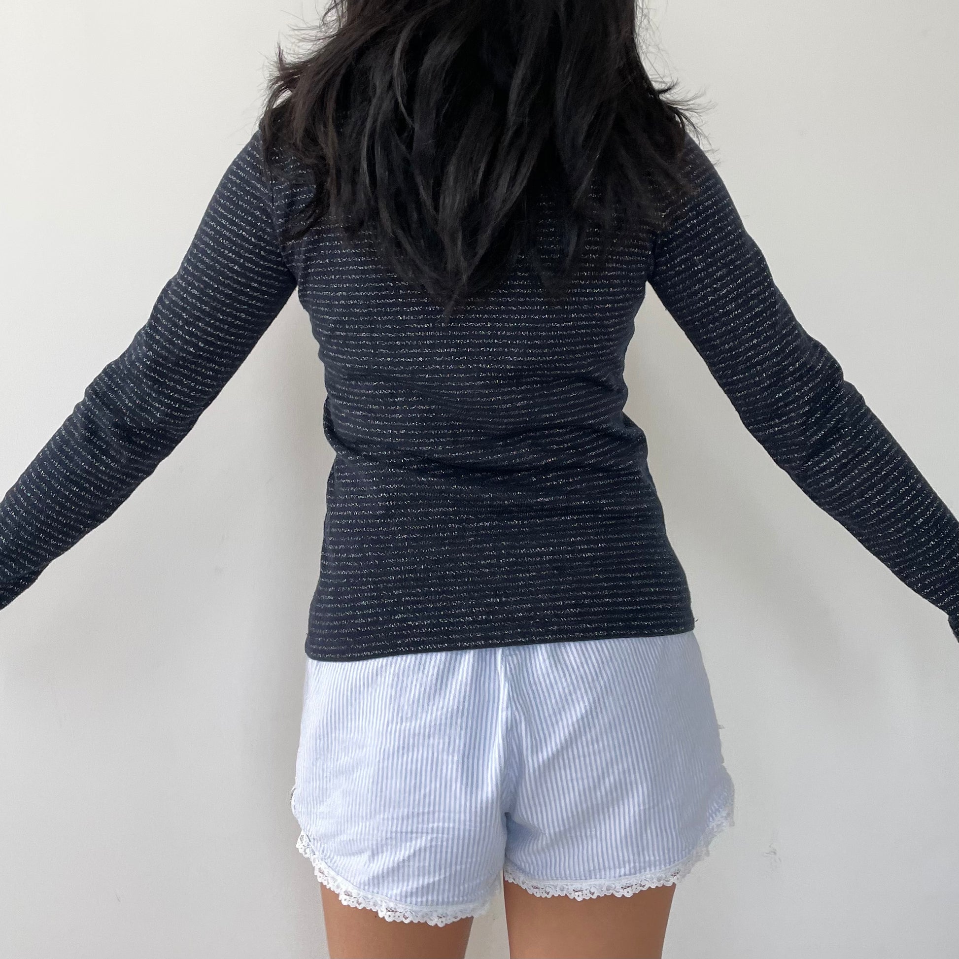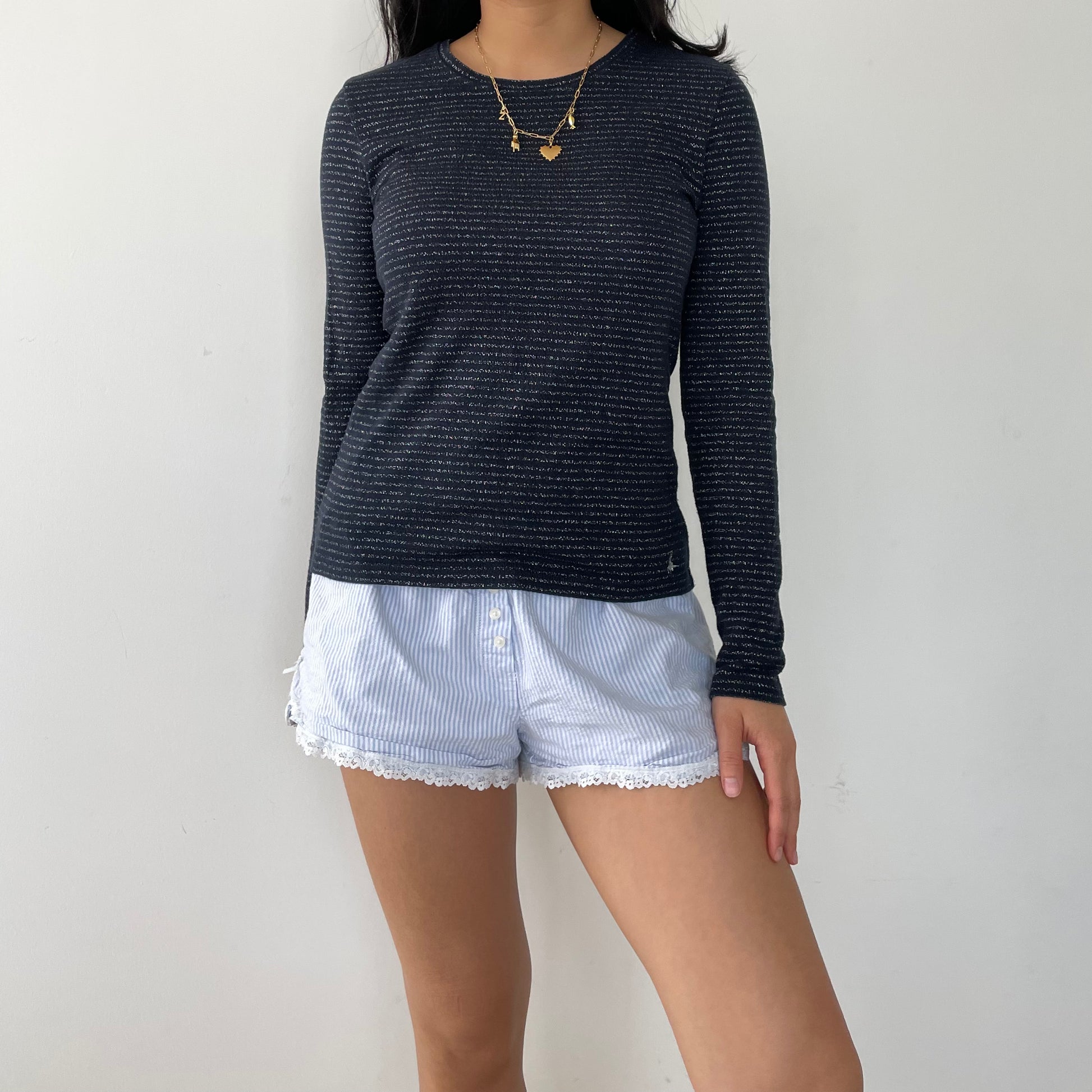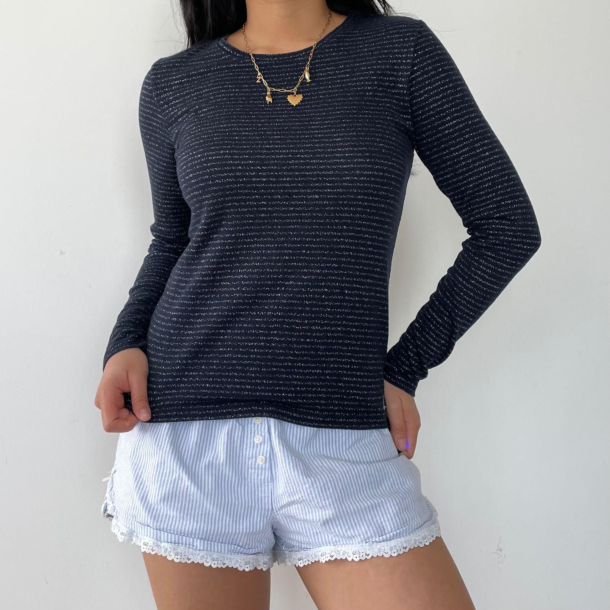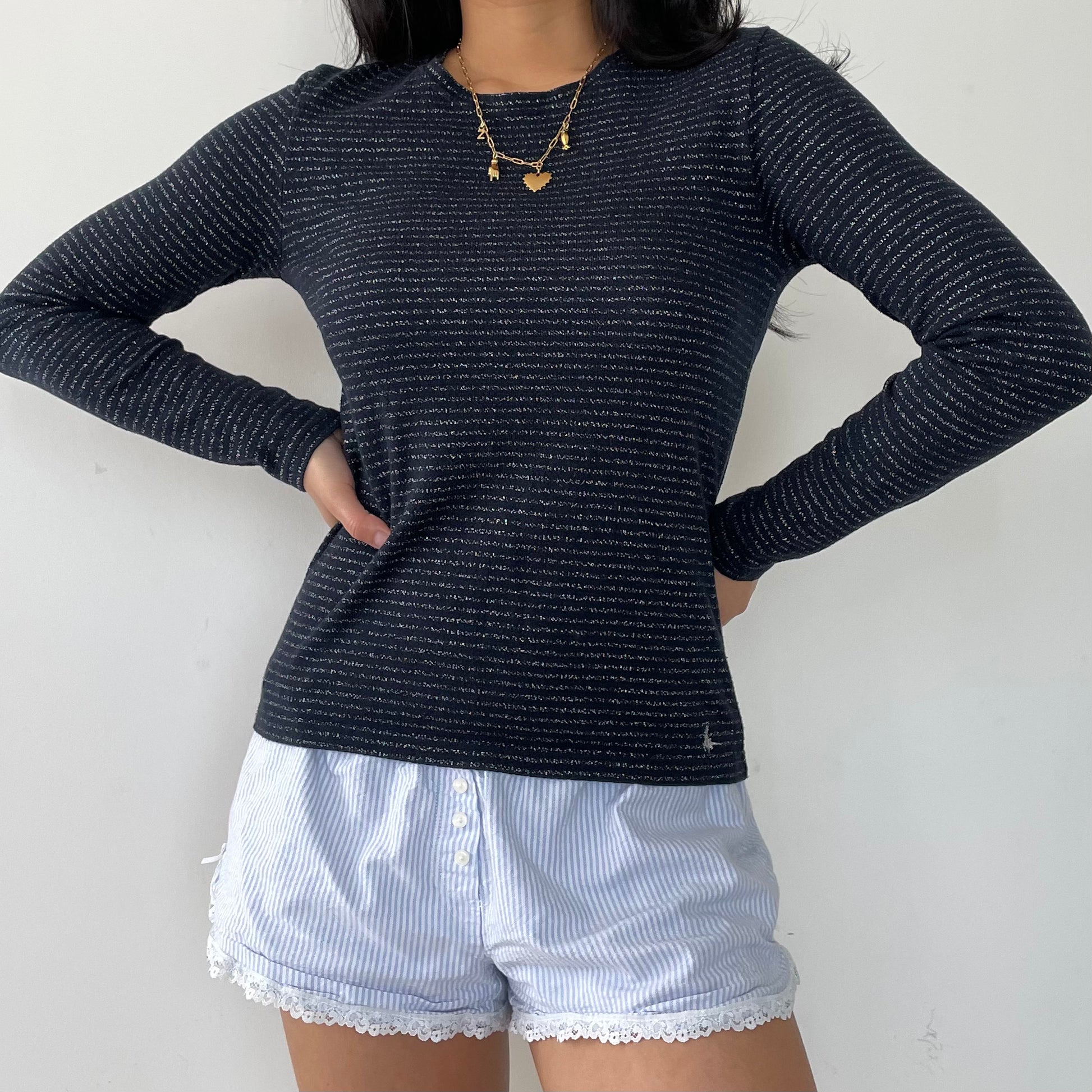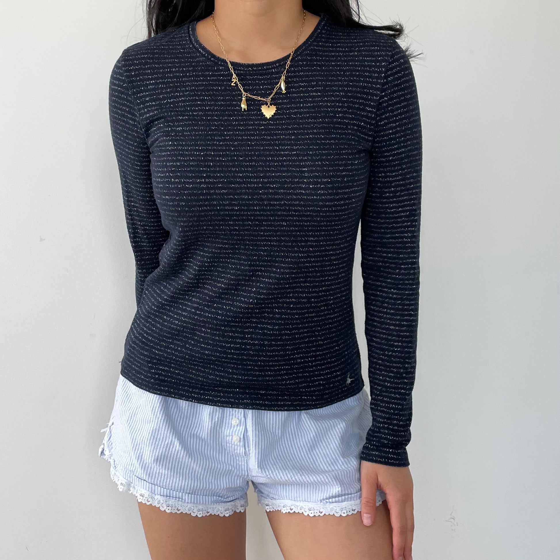 - Details: Navy and silver horizontal stripes; metallic thread; crew neck long sleeves