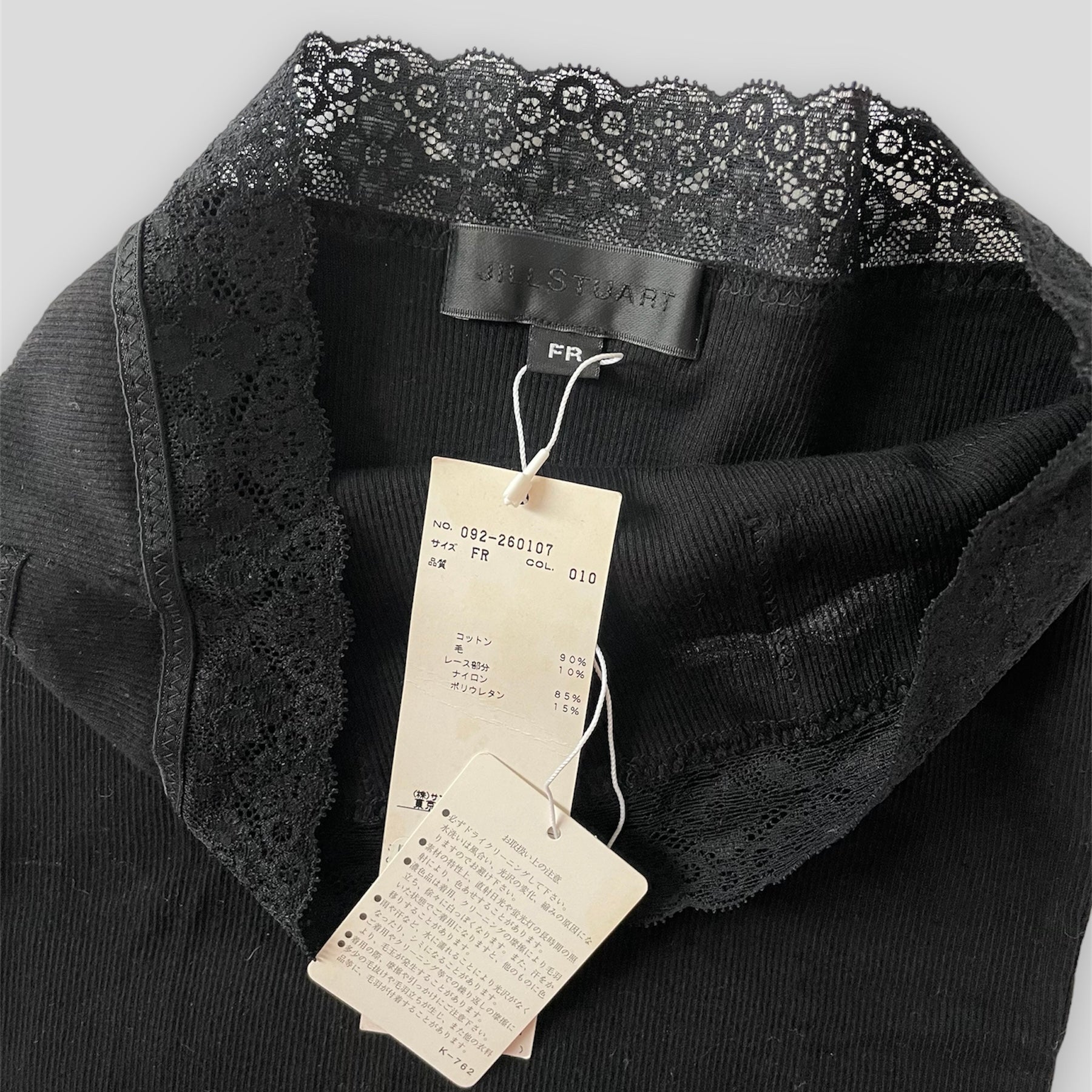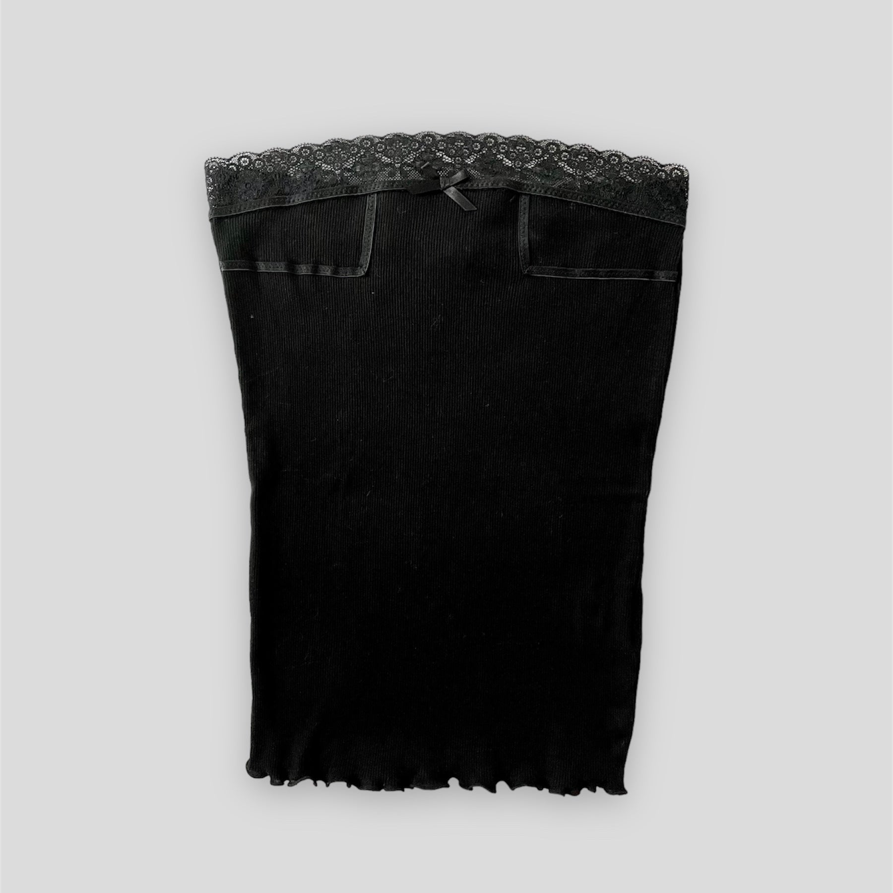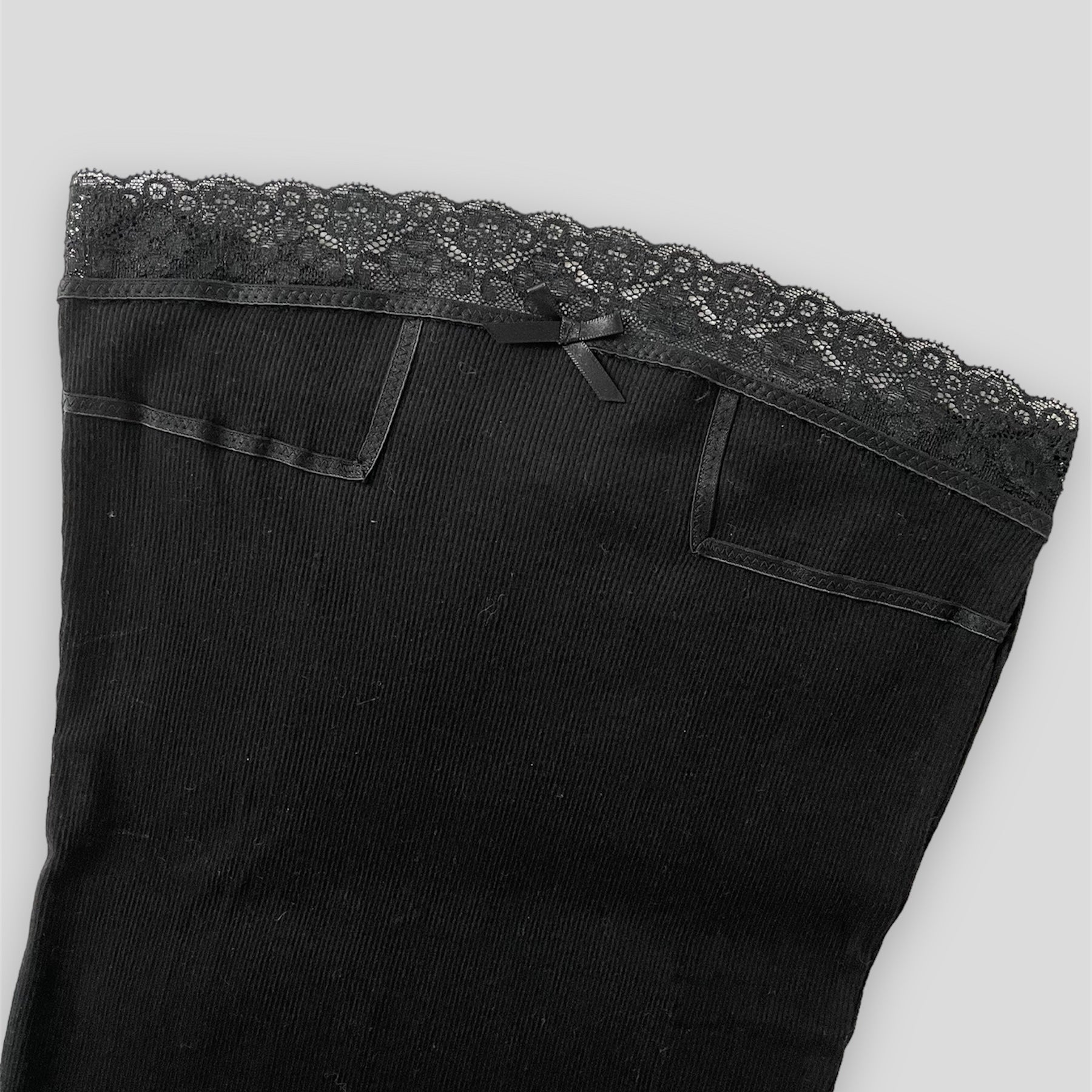 - Details: Black stretchy cotton and wool blend strapless top; lace trim hem and satin ribbon bow detail