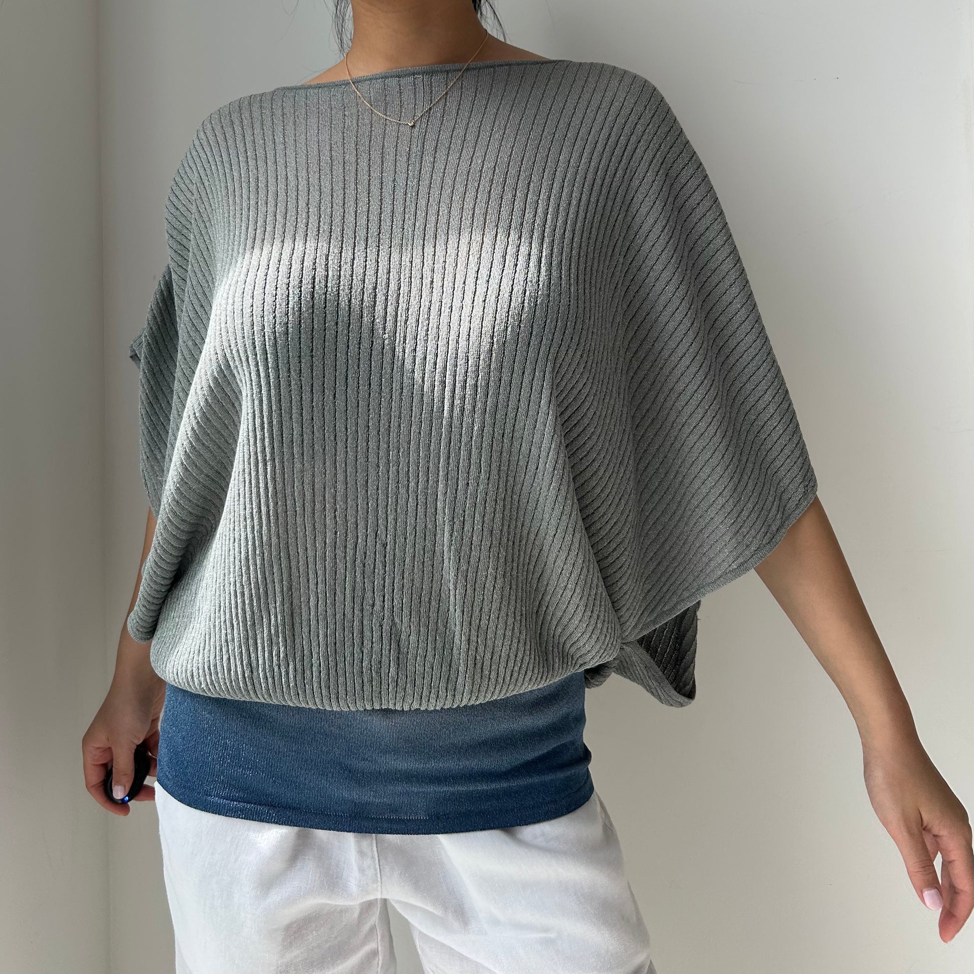 - Details: Shimmering blue-grey gradient ribbed knit with a fluid drape; dolman sleeves and relaxed batwing silhouette; dramatic low-cut open back