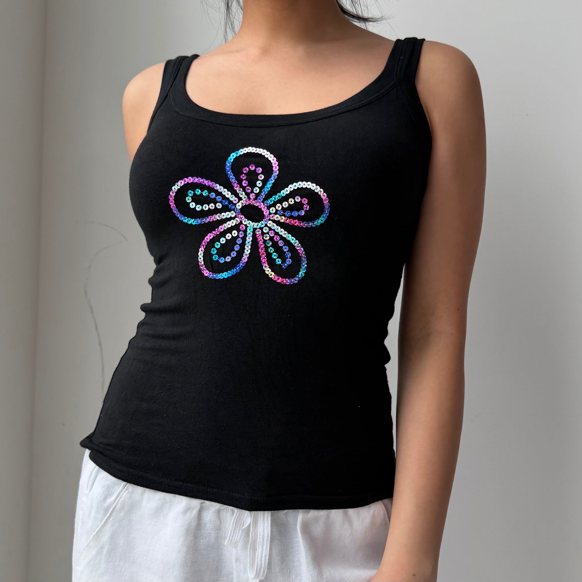 - Details: Black tank top; irridescent pink, purple, blue, and silver sequin flower design at front