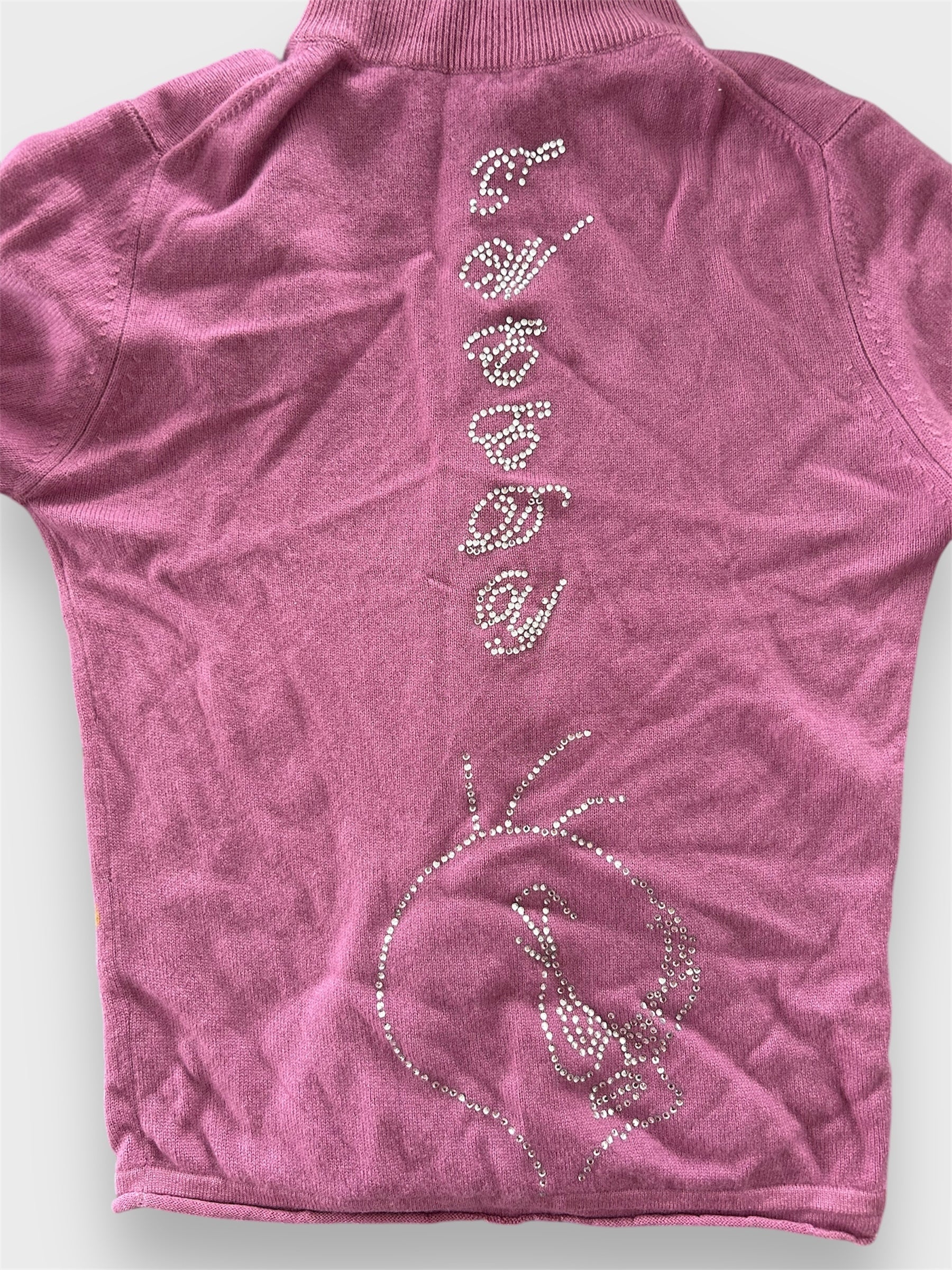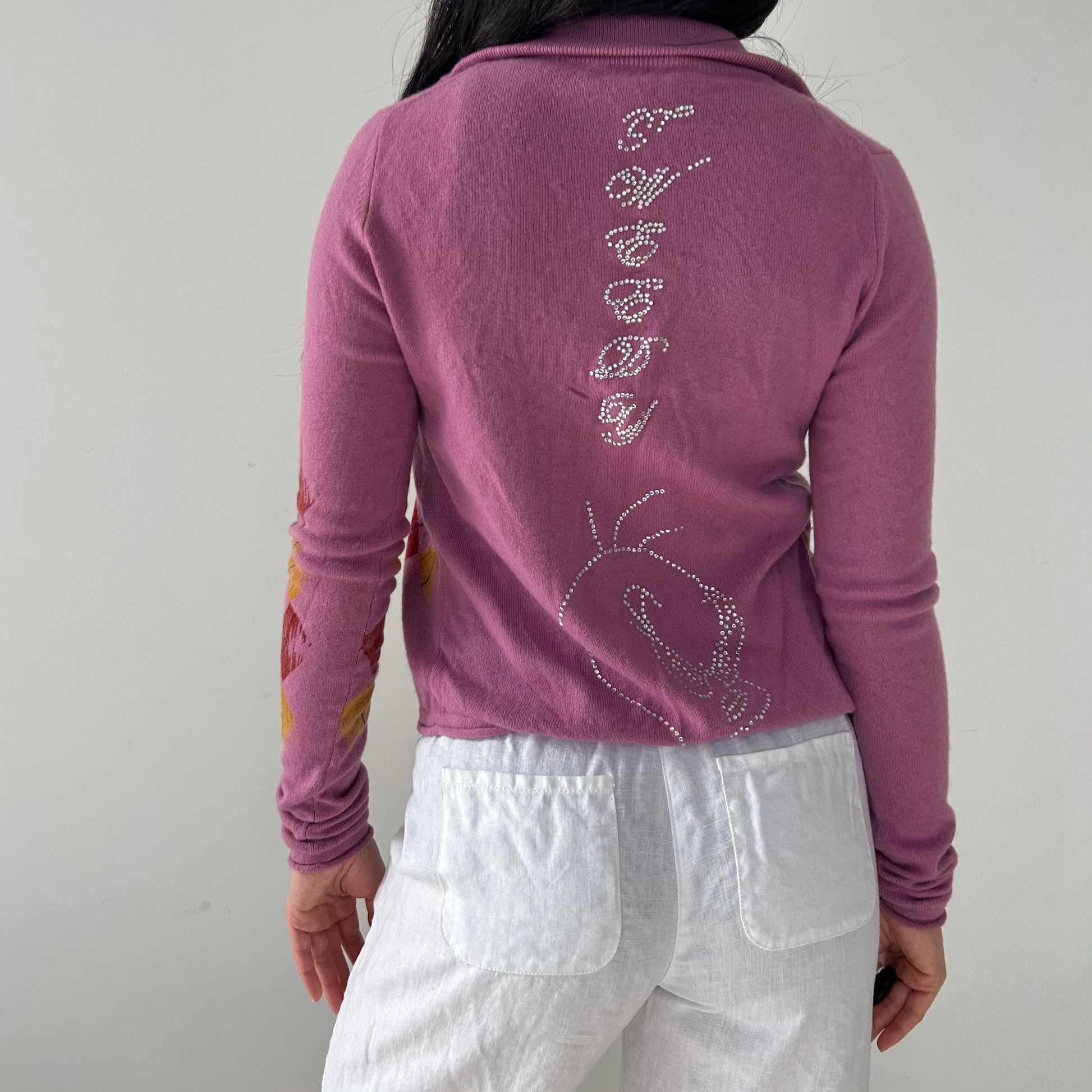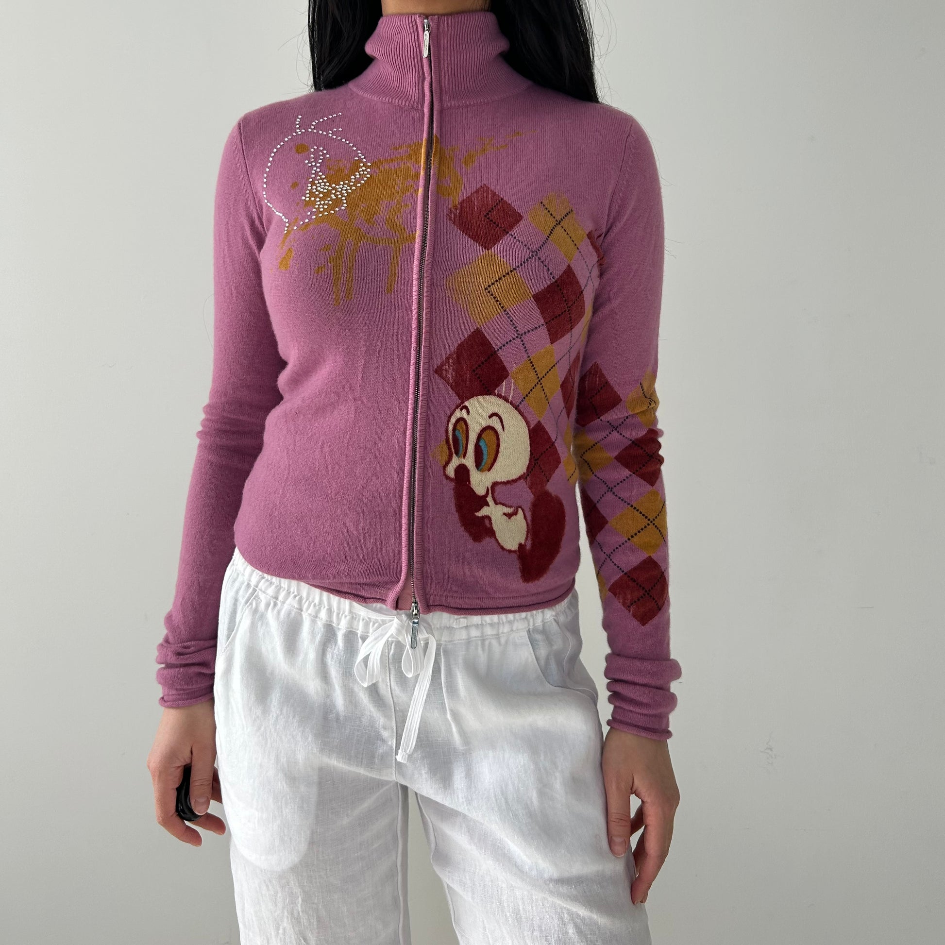 - Details: Pink double zip cashmere knit cardigan in dusty pink; features an argyle pattern with Tweety Bird graphic on the front; metallic and rhinestone motif on the chest; high collar; ribbed cuffs and hem