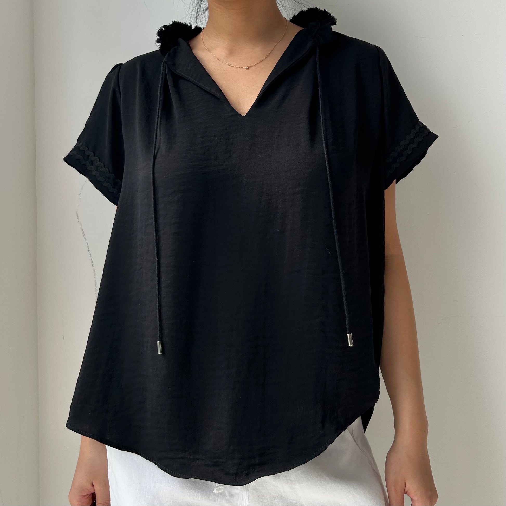 - Details: Short sleeve blouse in black; v-neckline with tassel-tie detail and soft collar trim