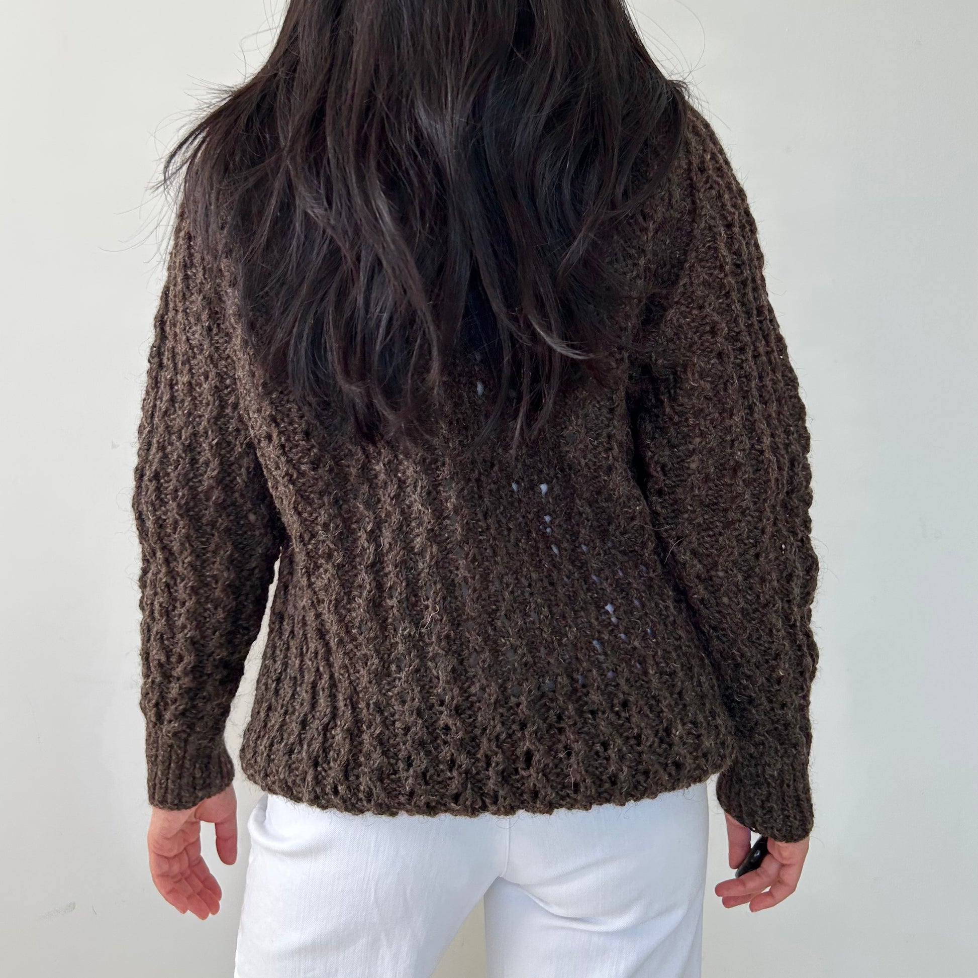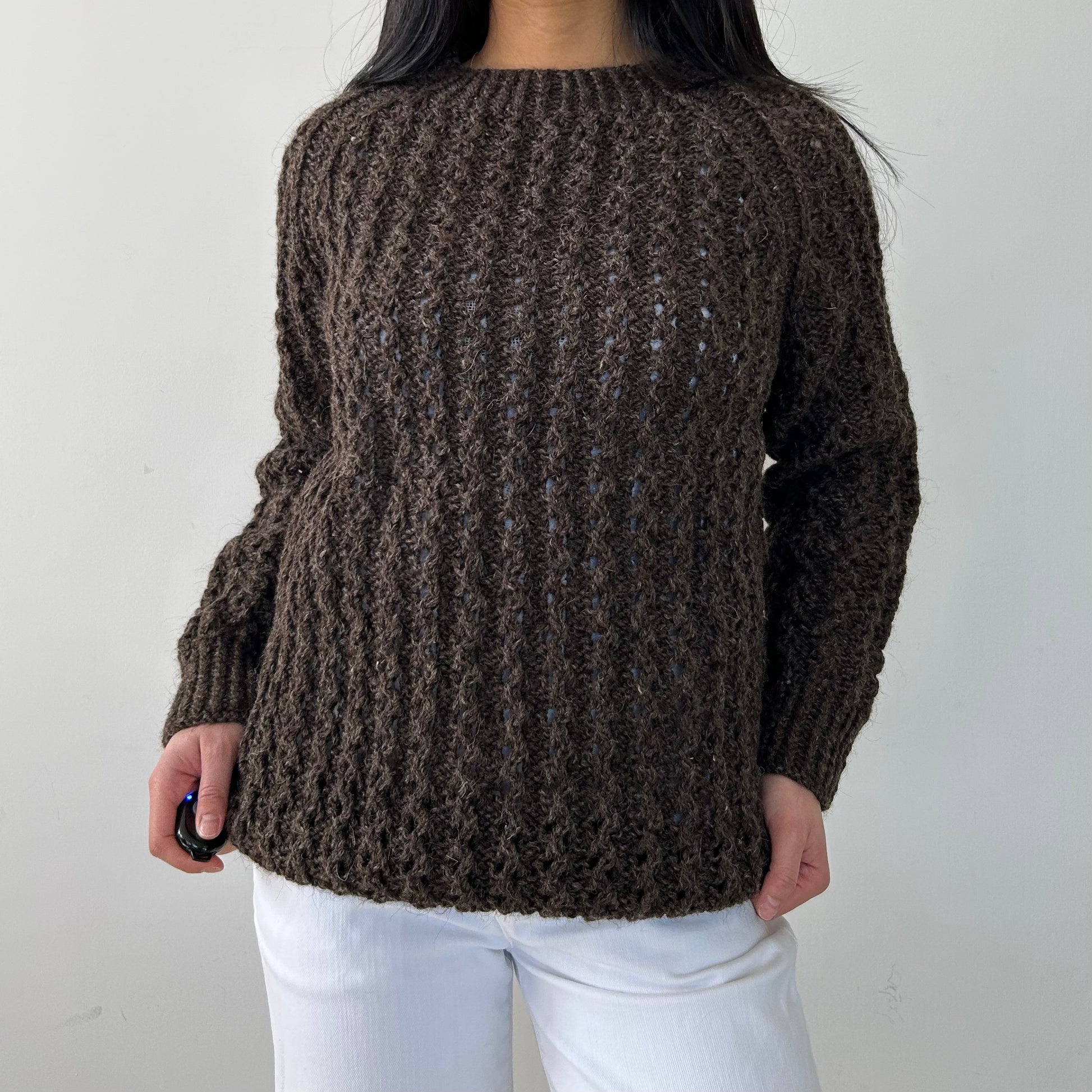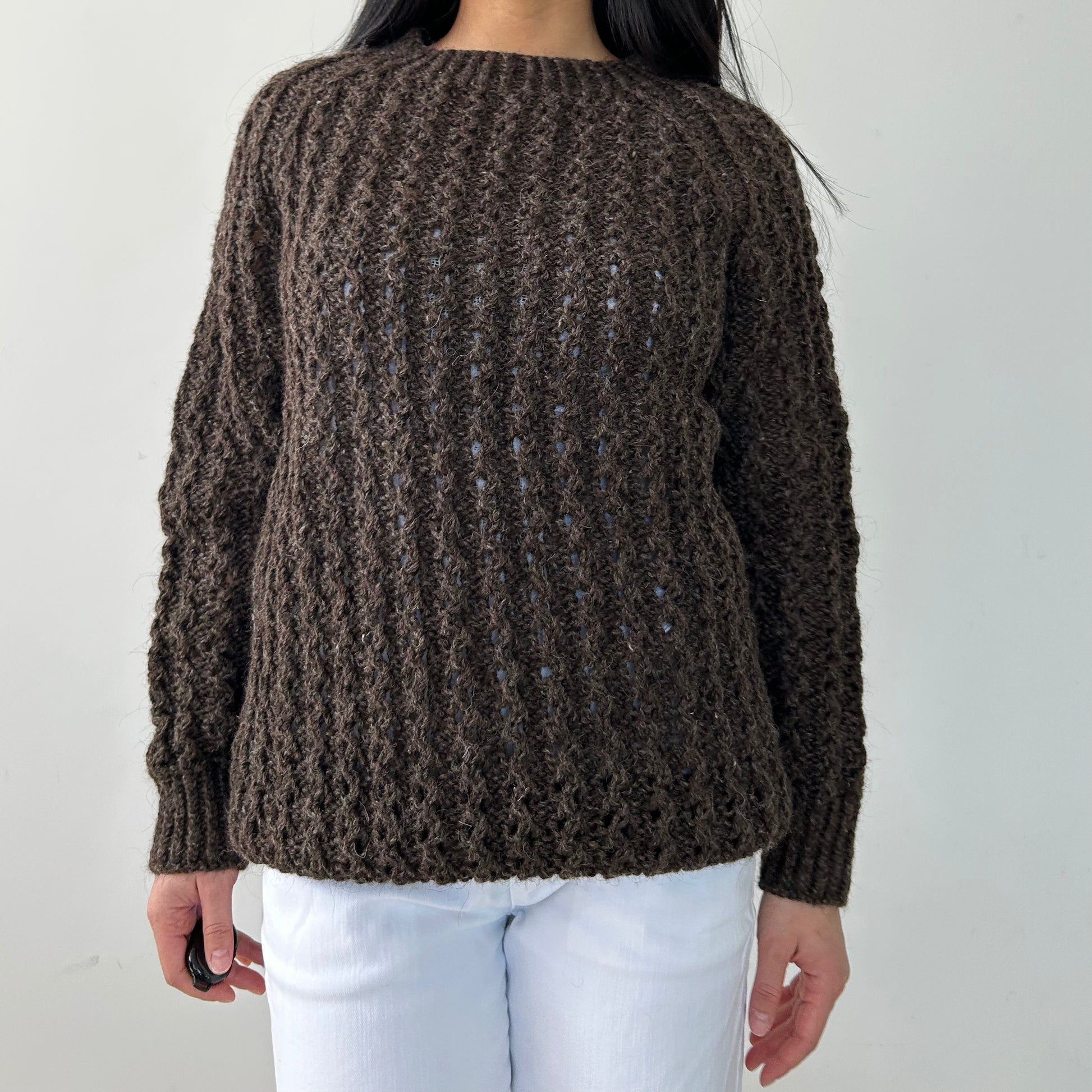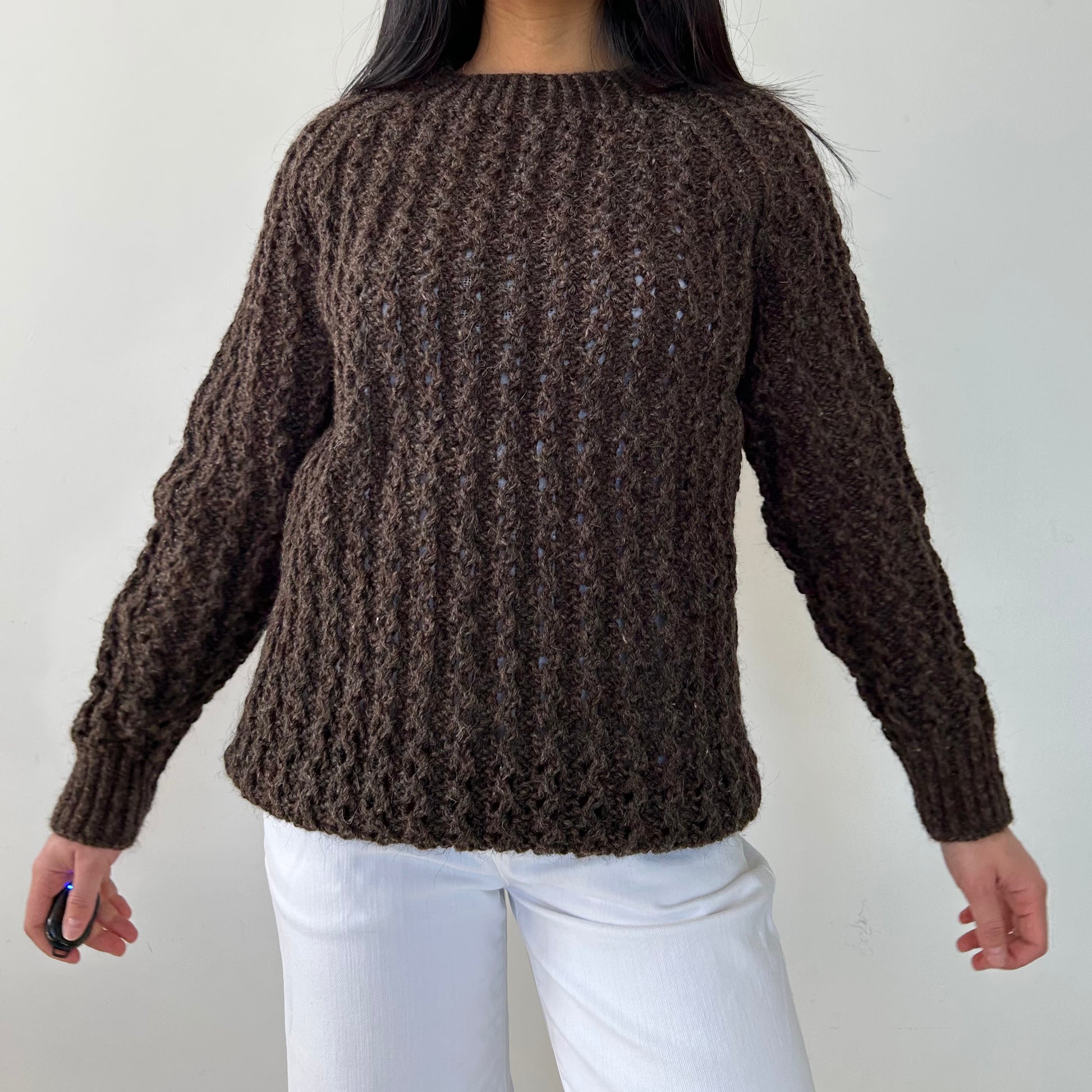 Details: Vintage from the 1970s; brown chunky knit sweater; crewneck; ribbed sleeves and collar