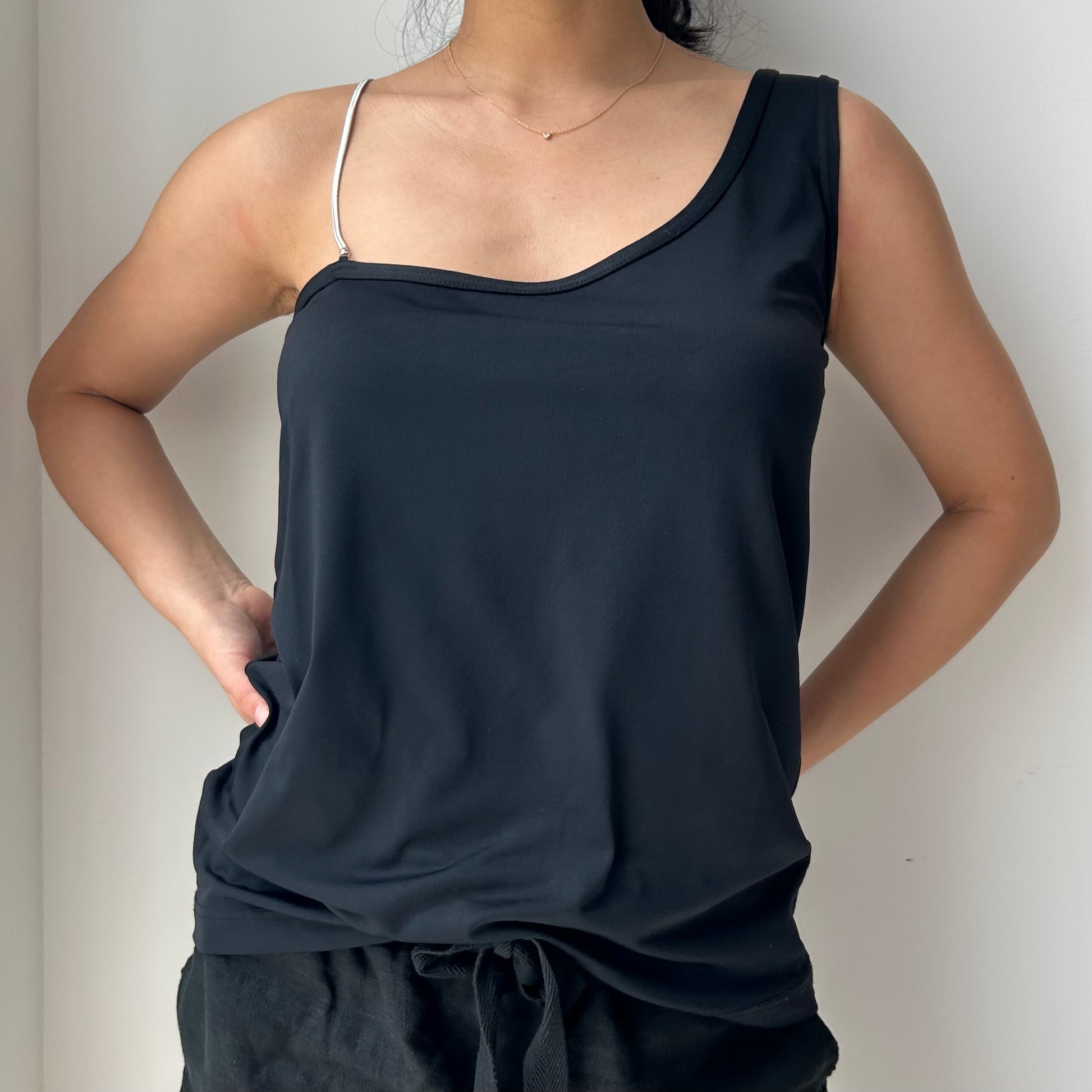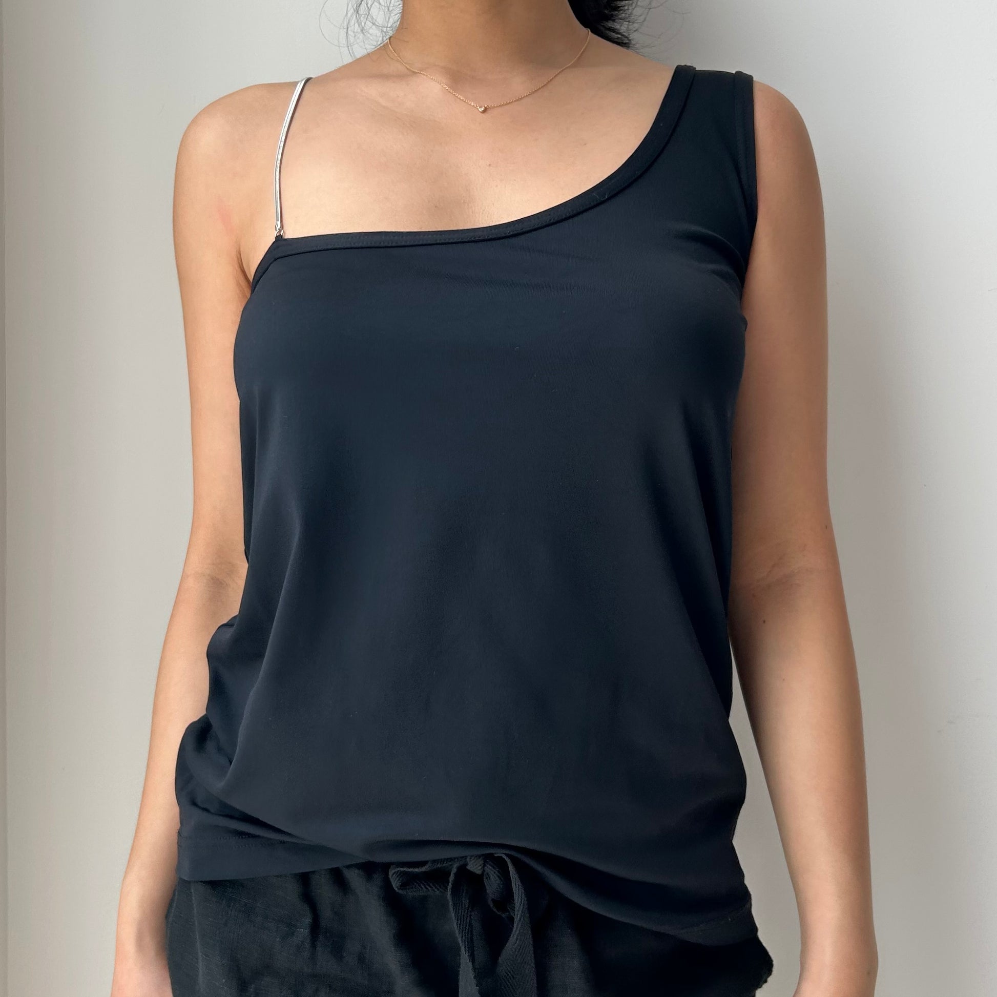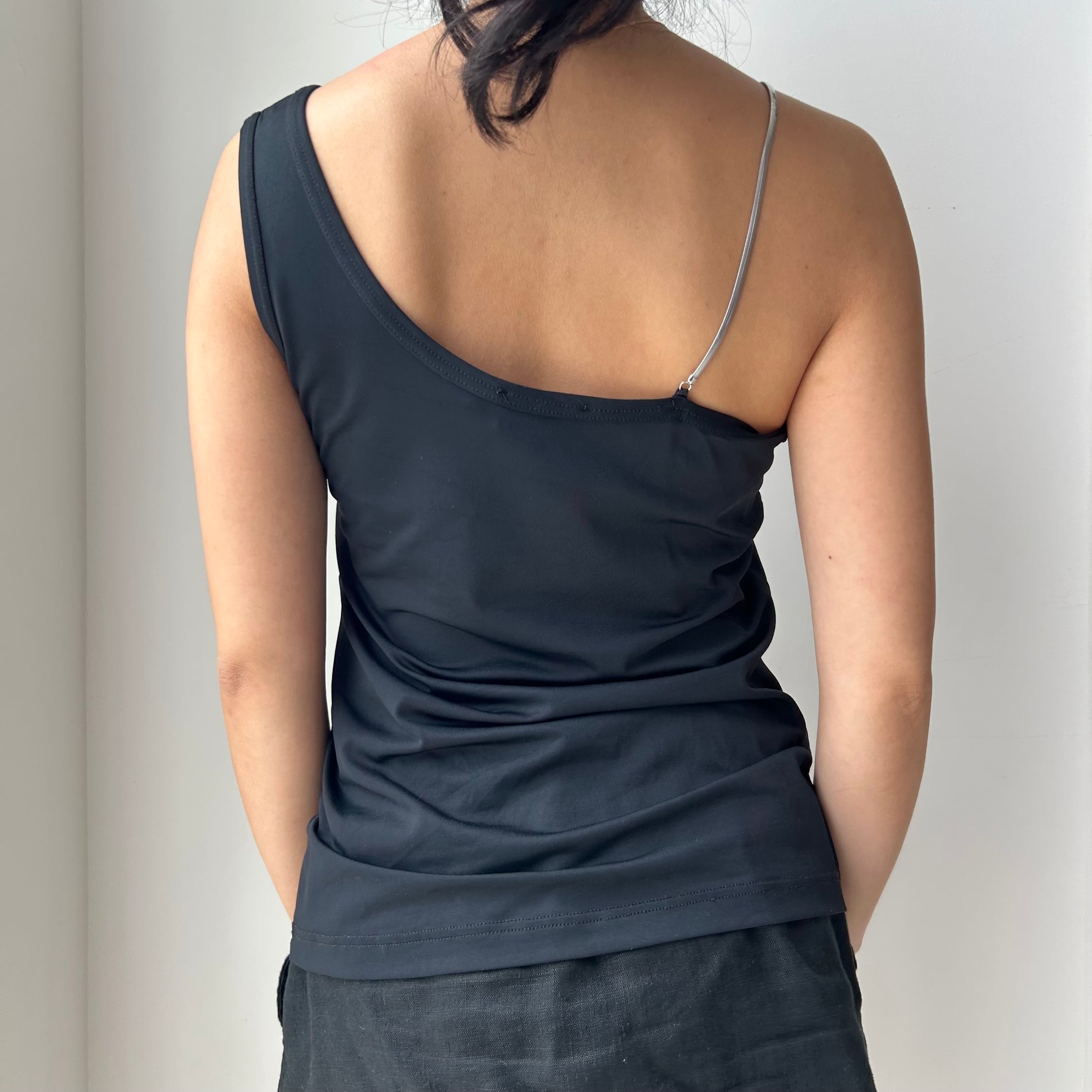 - Details: Classic black stretch tank; asymmetrical one-shoulder neckline; silver chain strap;