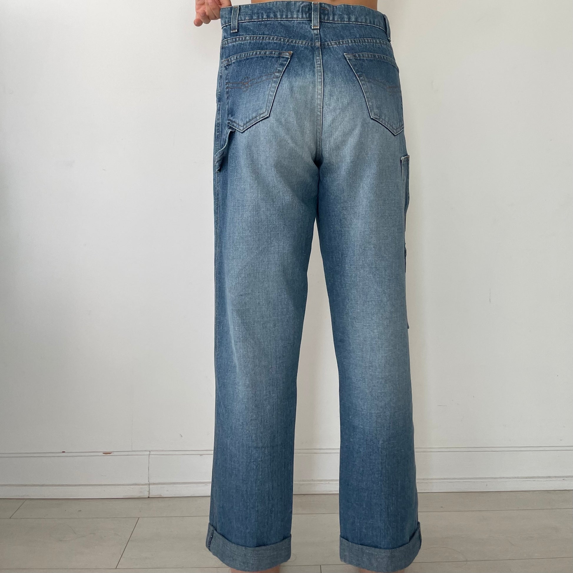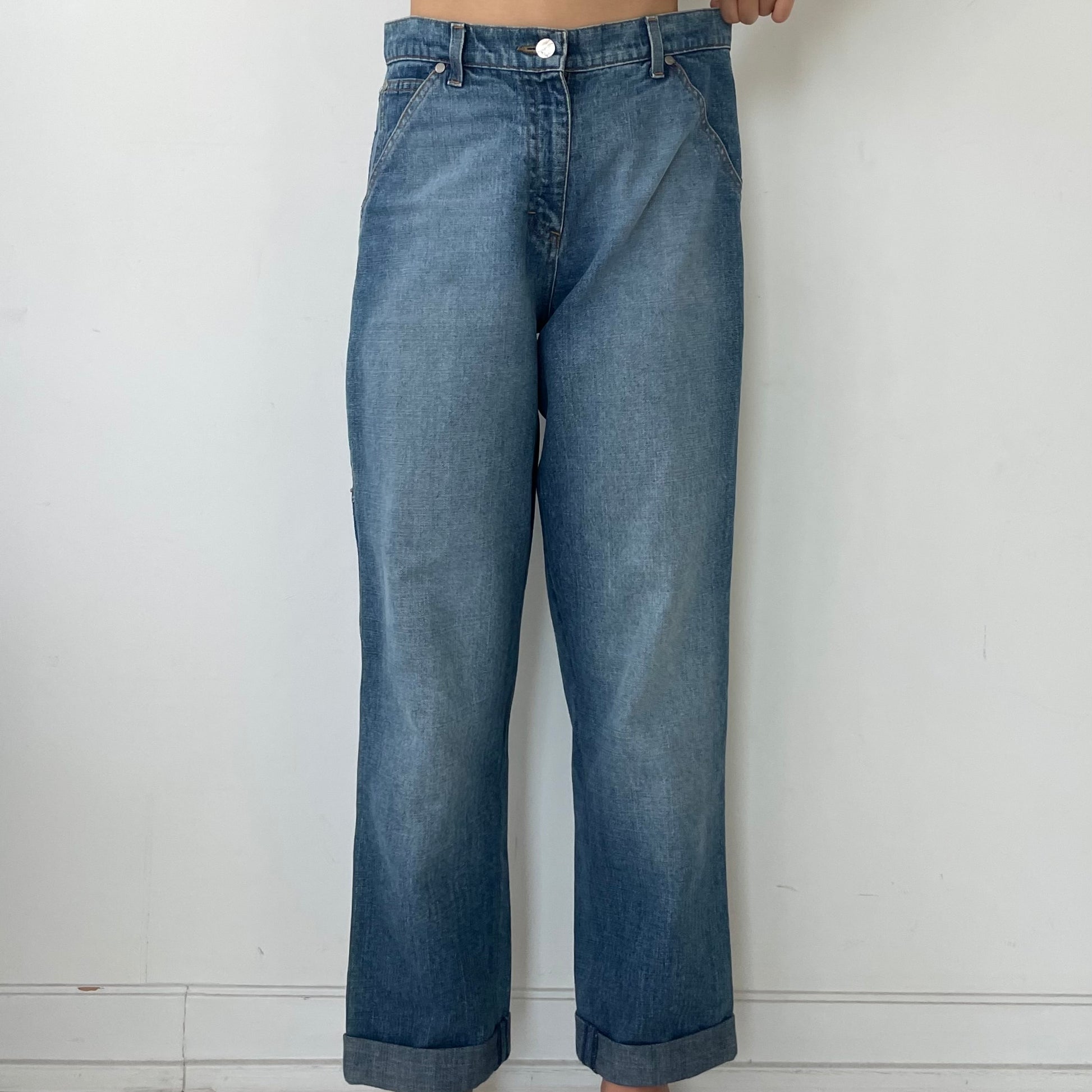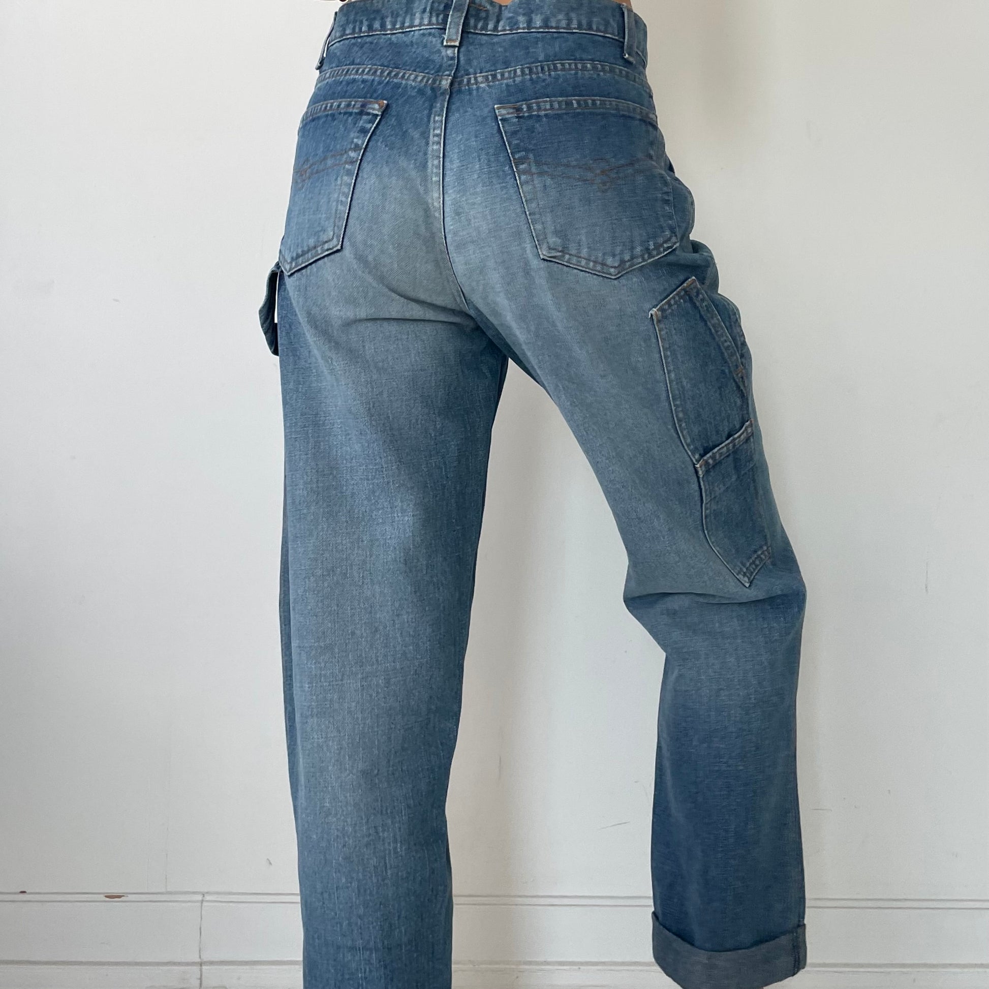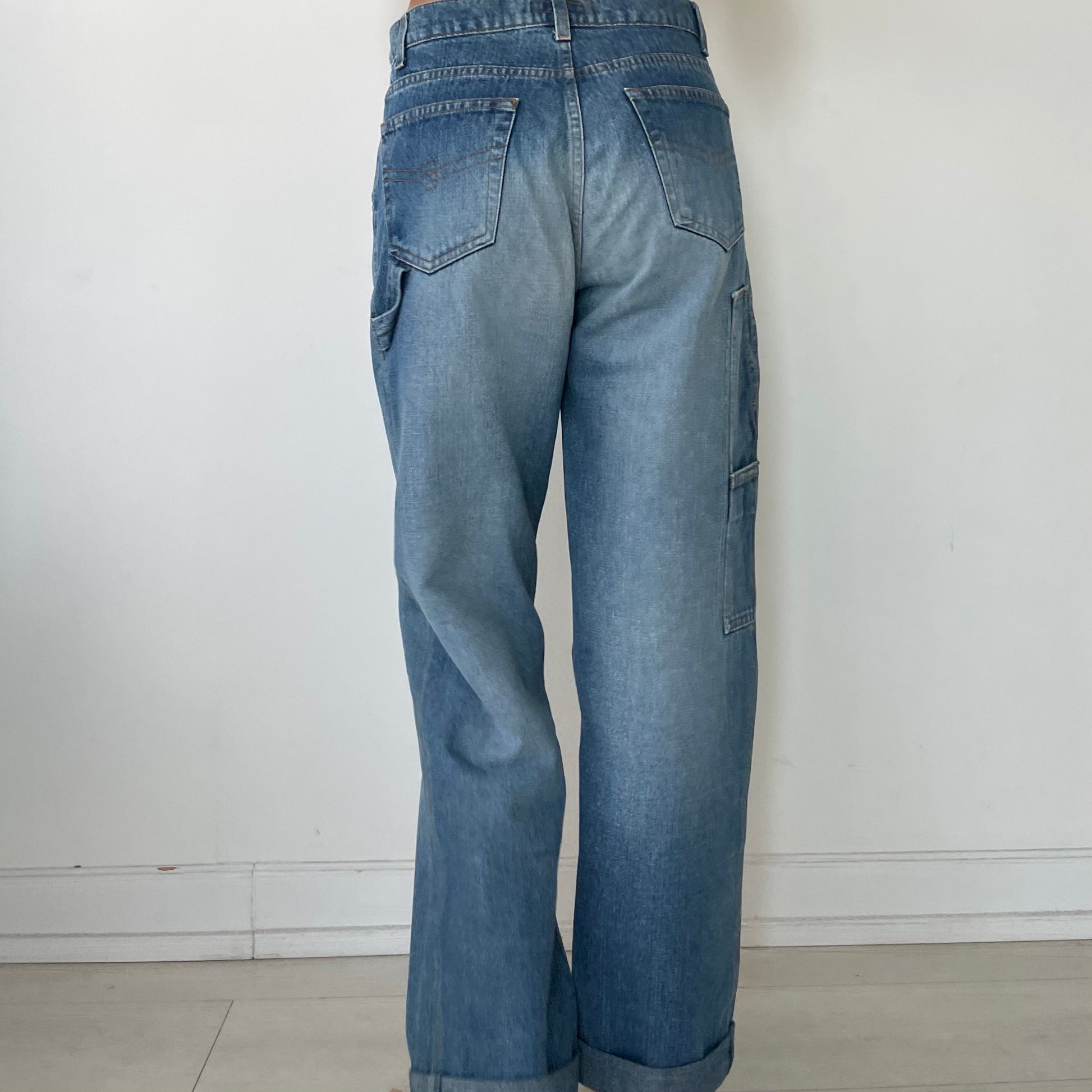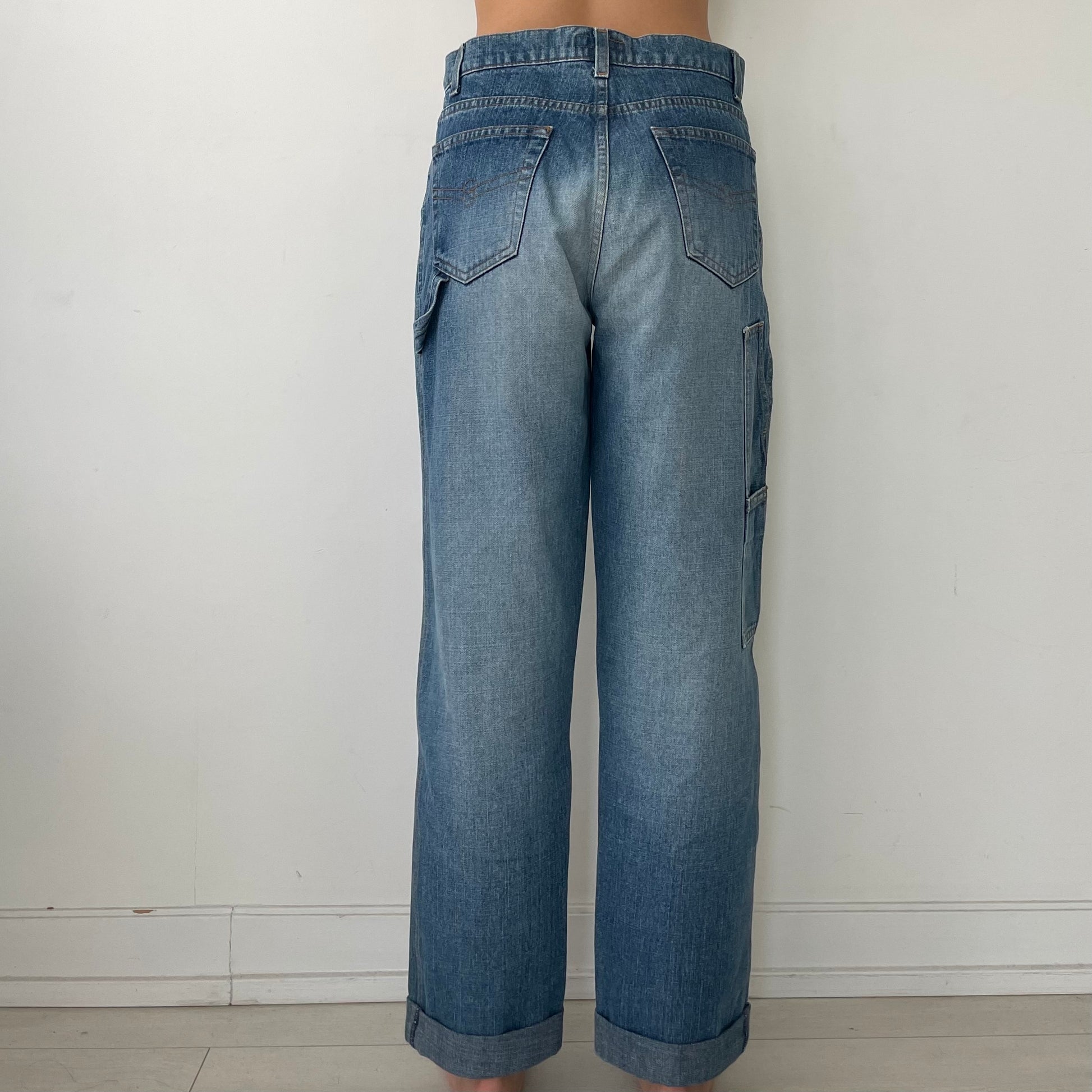- Details: Cuffed jeans; slight fade; medium blue wash; cargo pant details at the back; side leg pocket