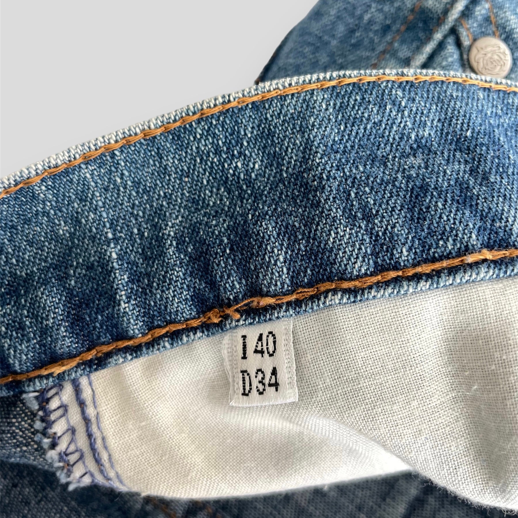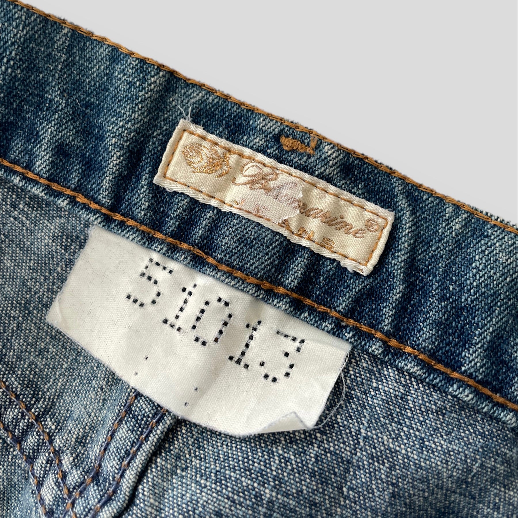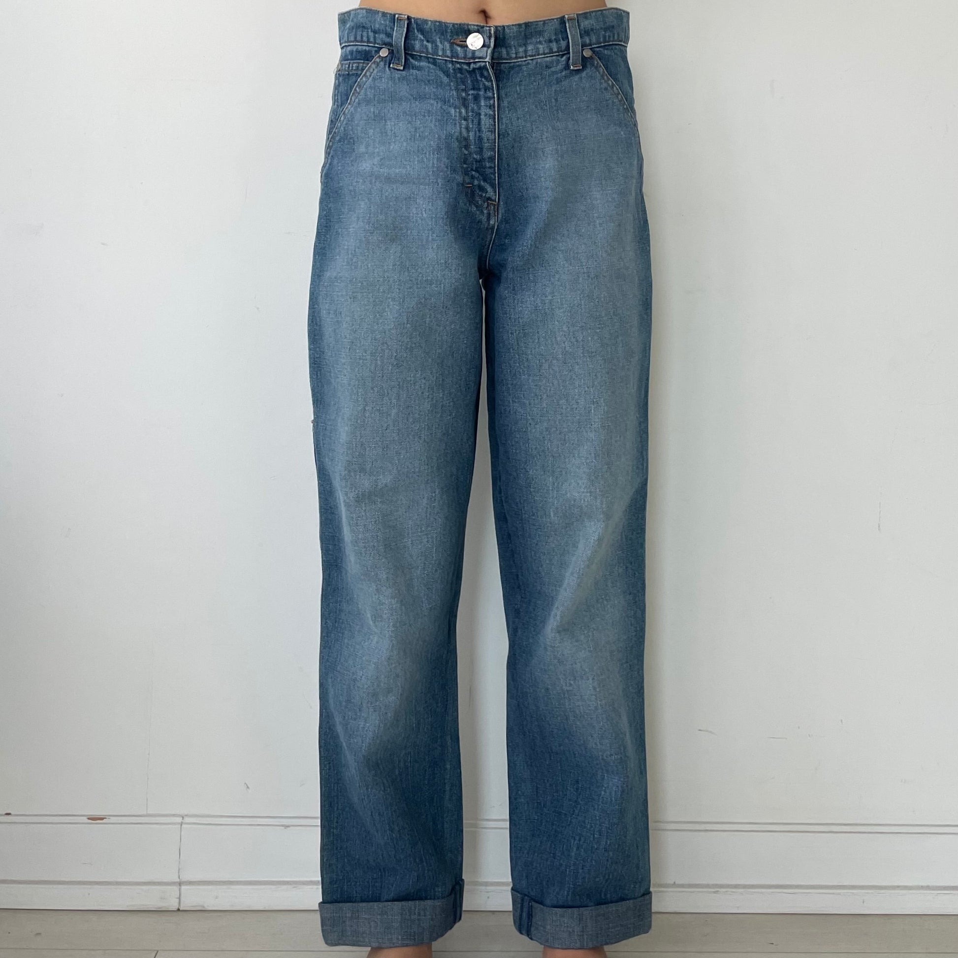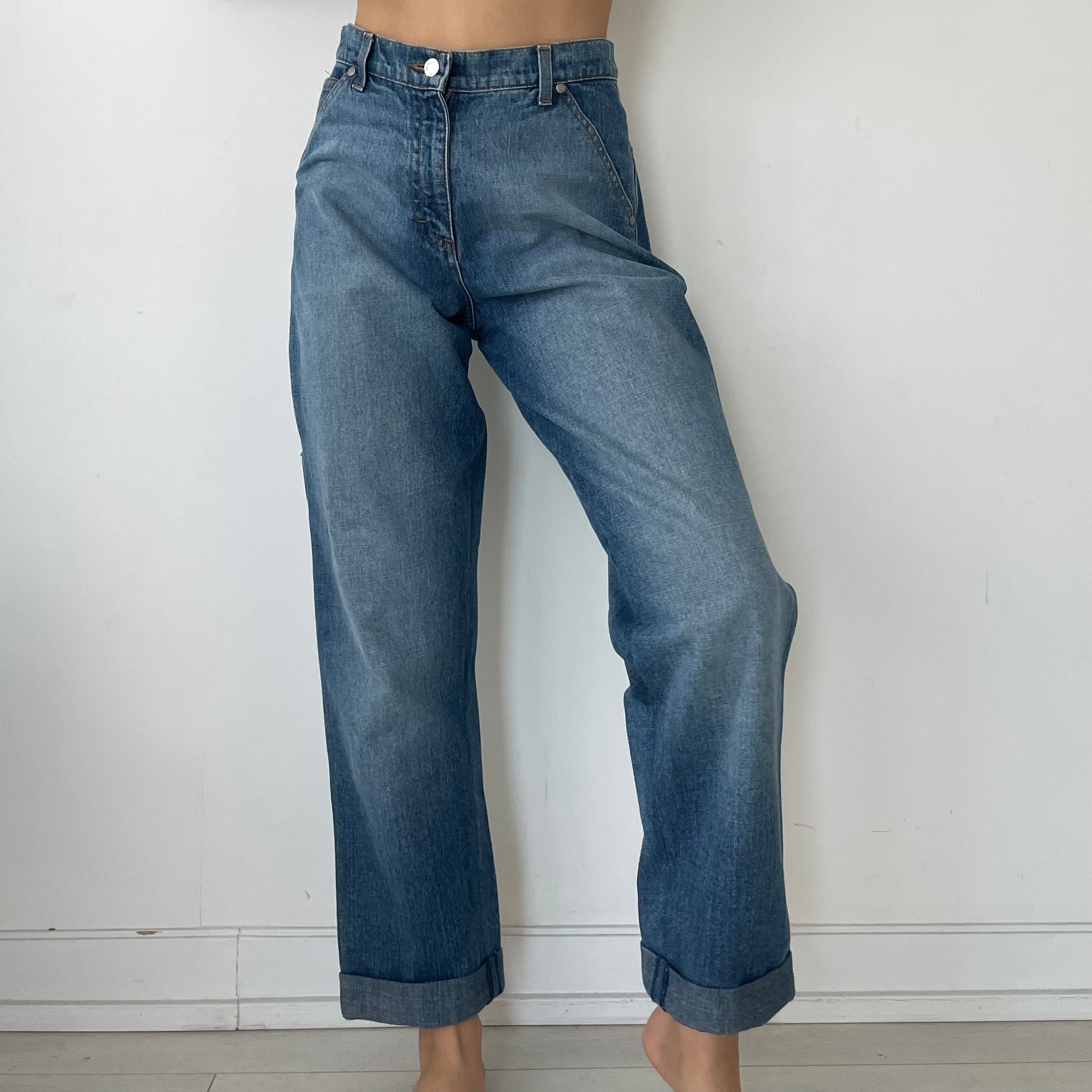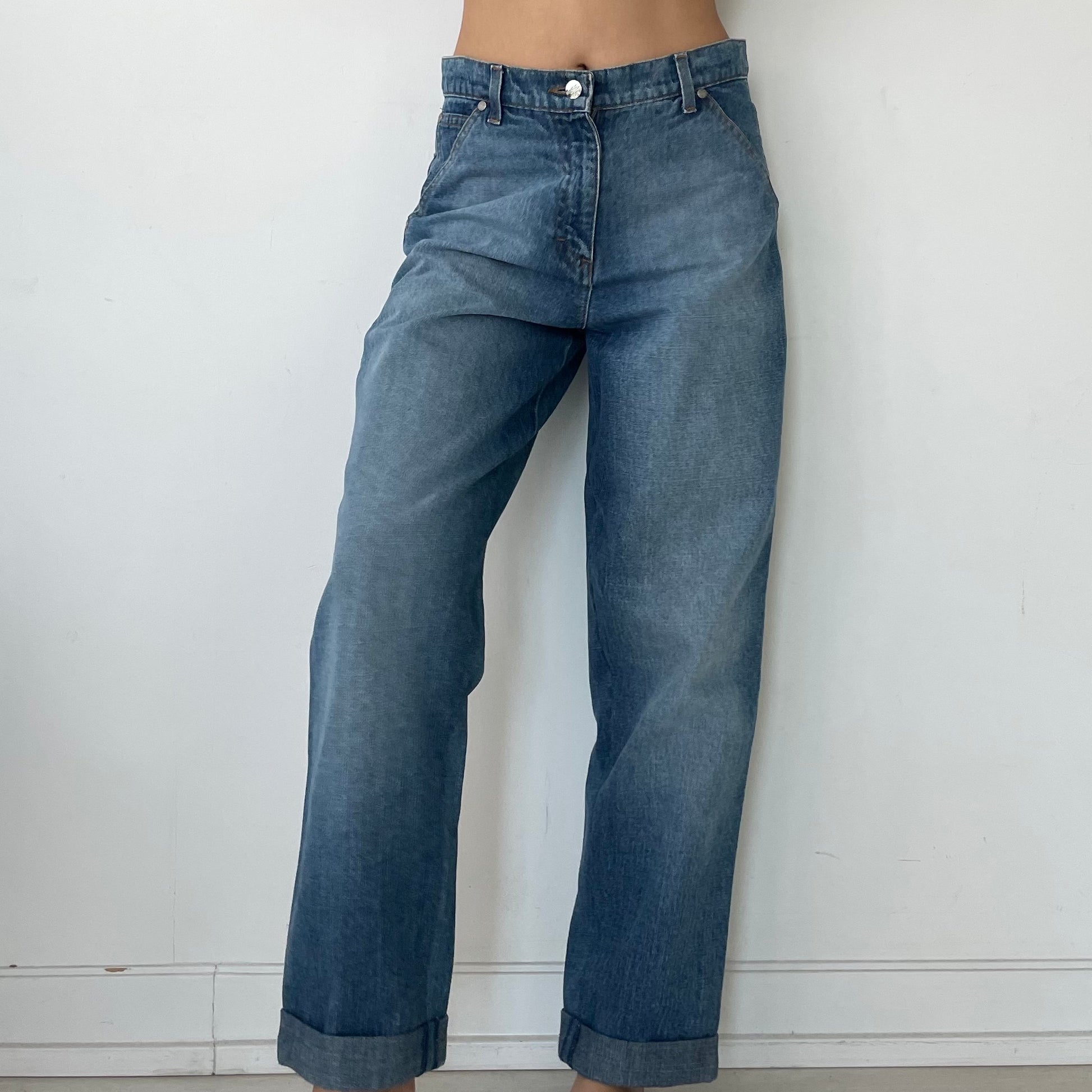 - Details: Cuffed jeans; slight fade; medium blue wash; cargo pant details at the back; side leg pocket