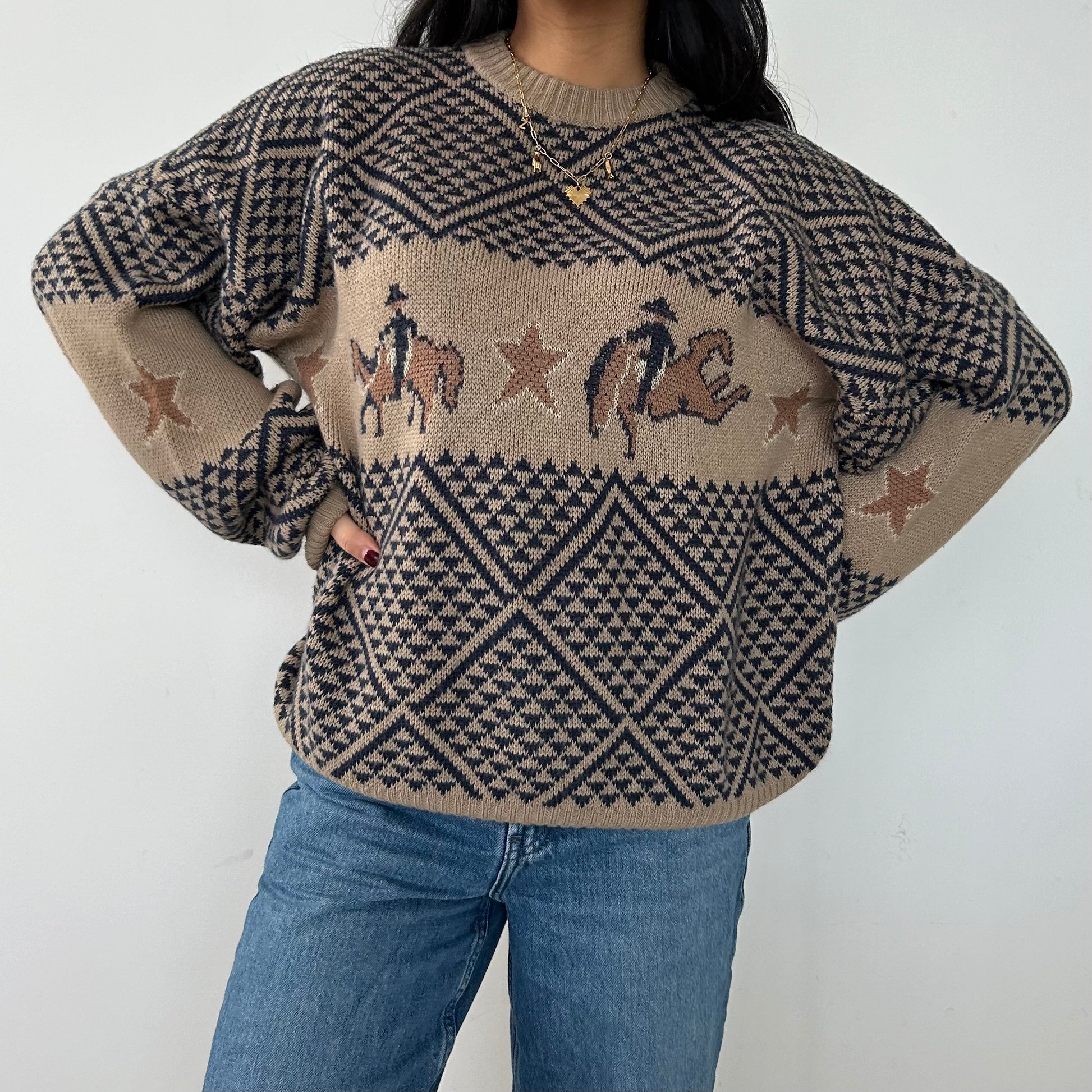 • Details: Brown cowichan style sweater; cowboy on a horse; star pattern on front, back, and sleeves