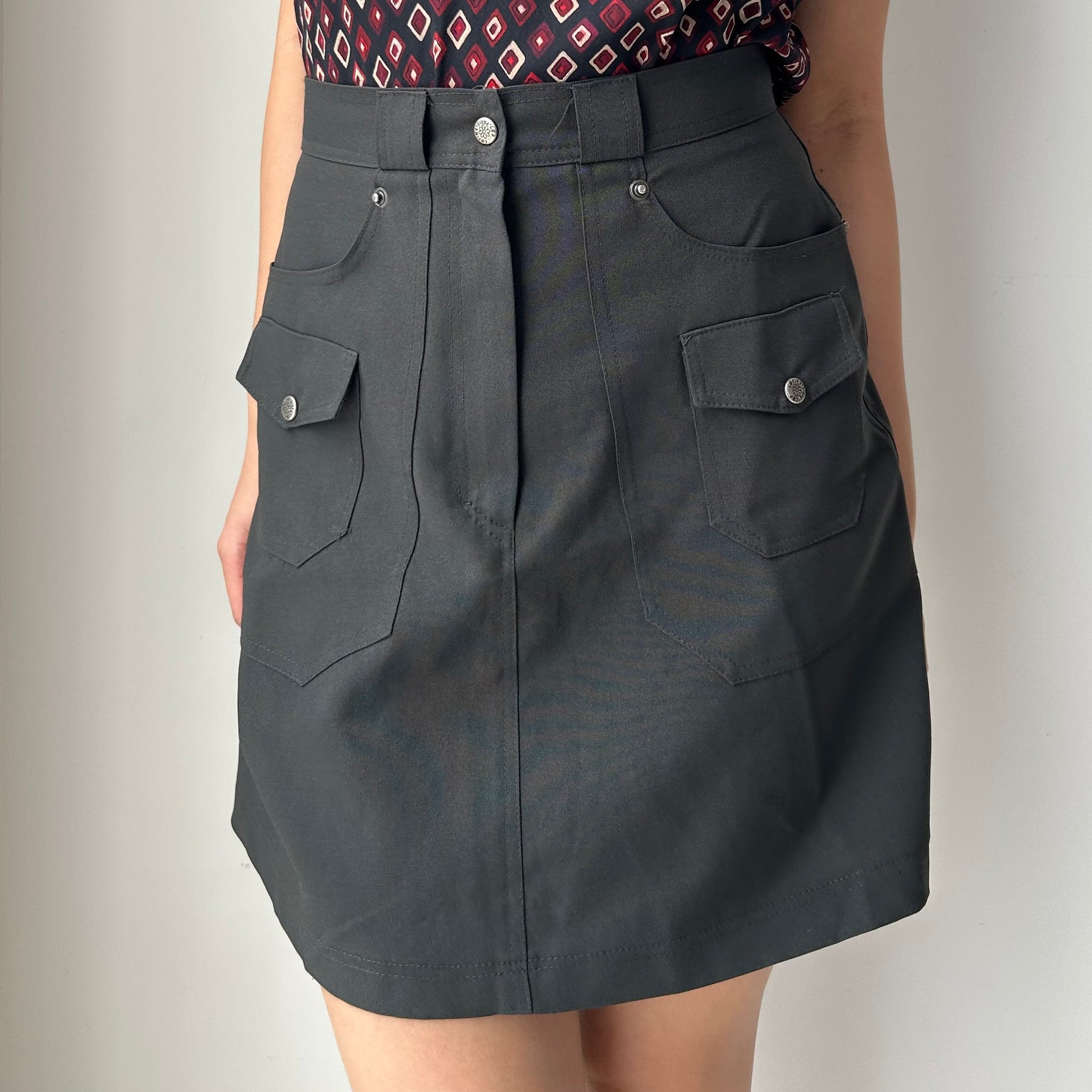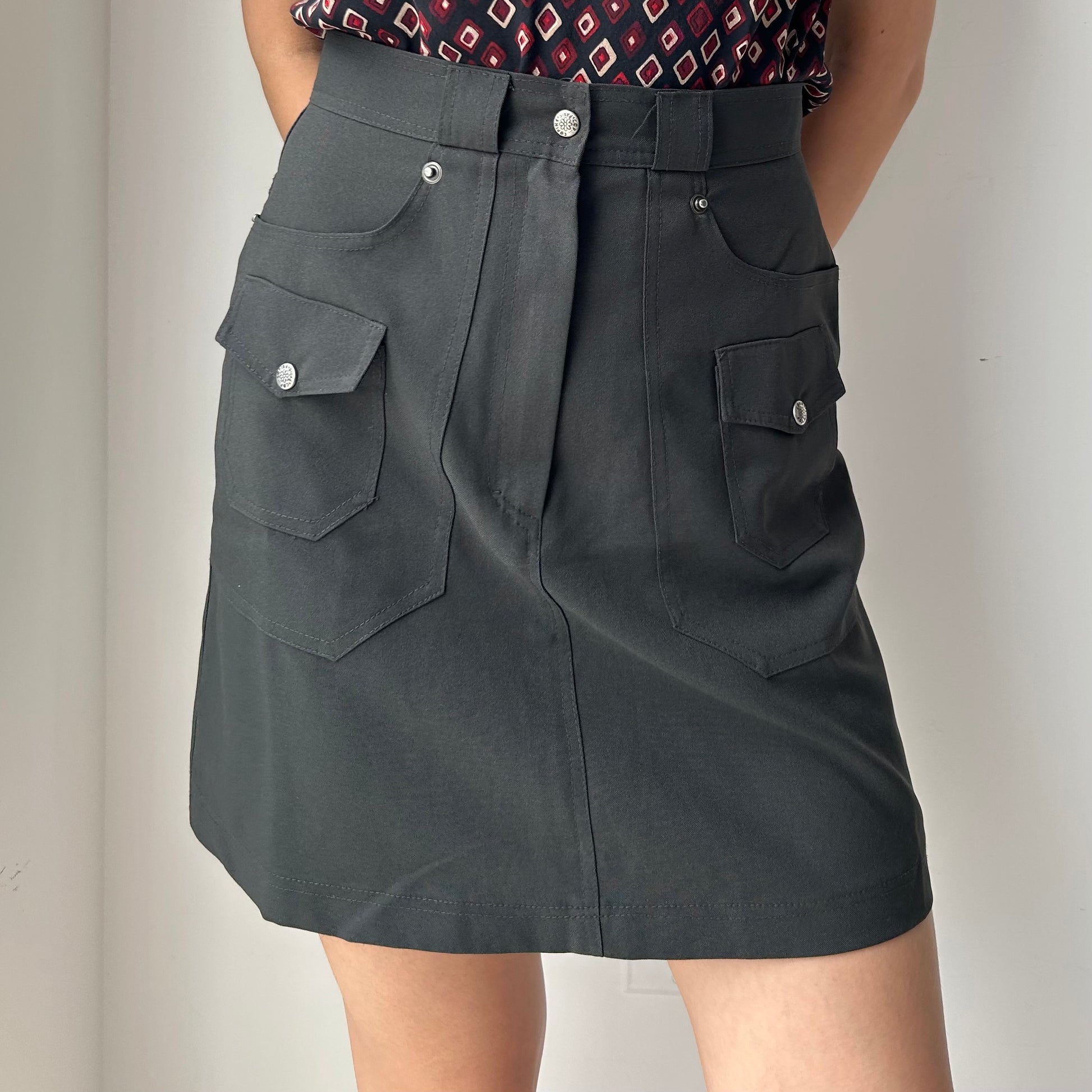 - Details: Dark grey cargo mini skirt; belt loops; two cargo pockets at front; two slant pockets; two patch pockets at back; concealed zip fly