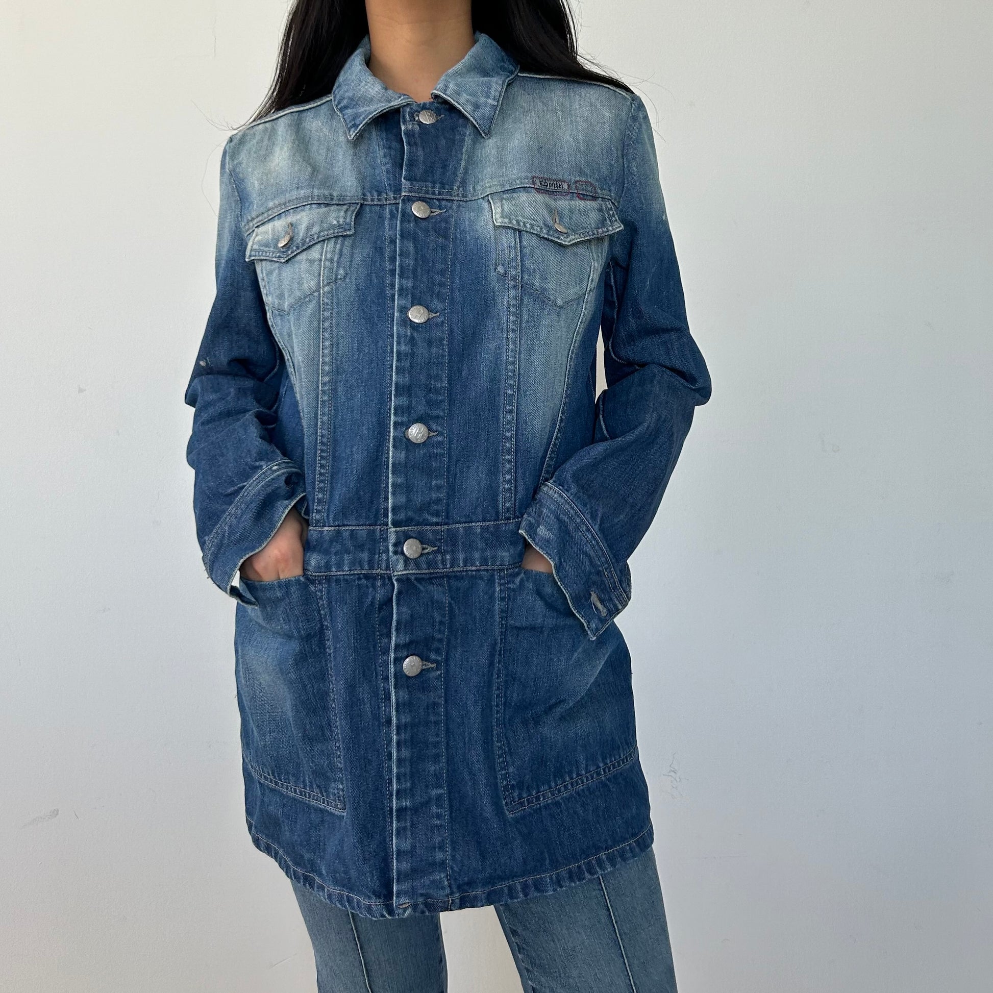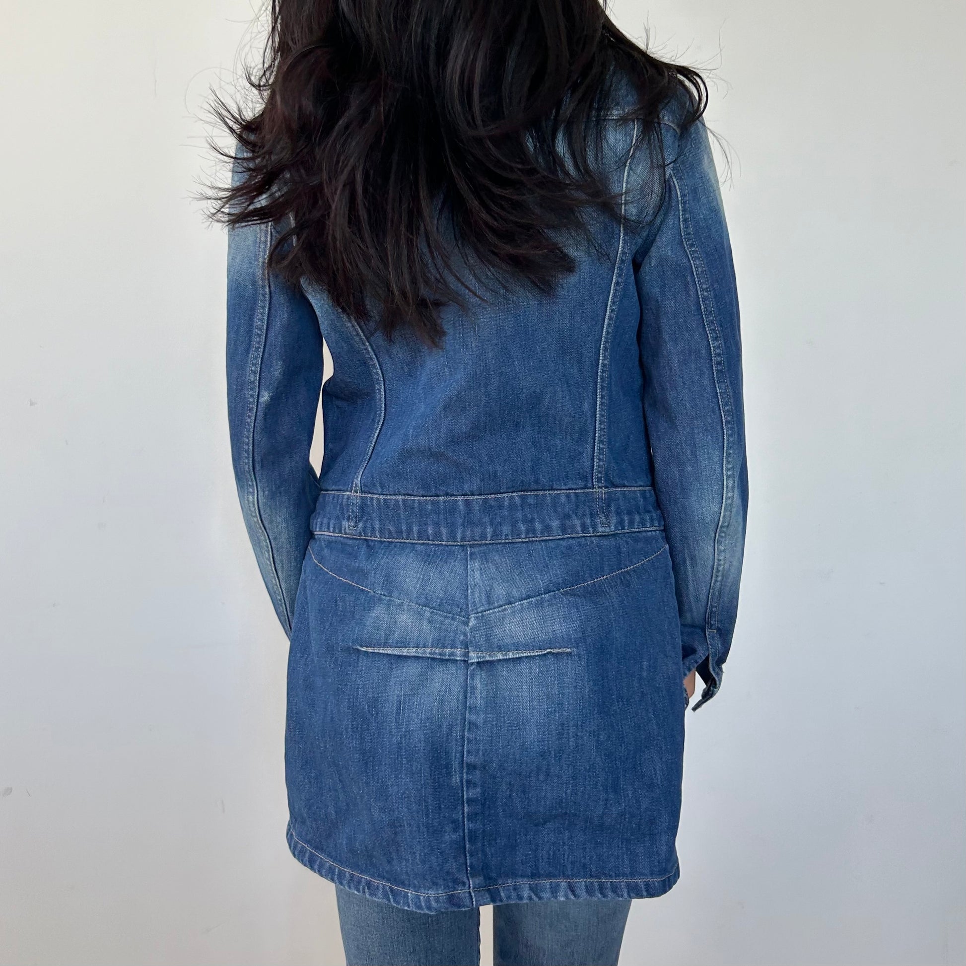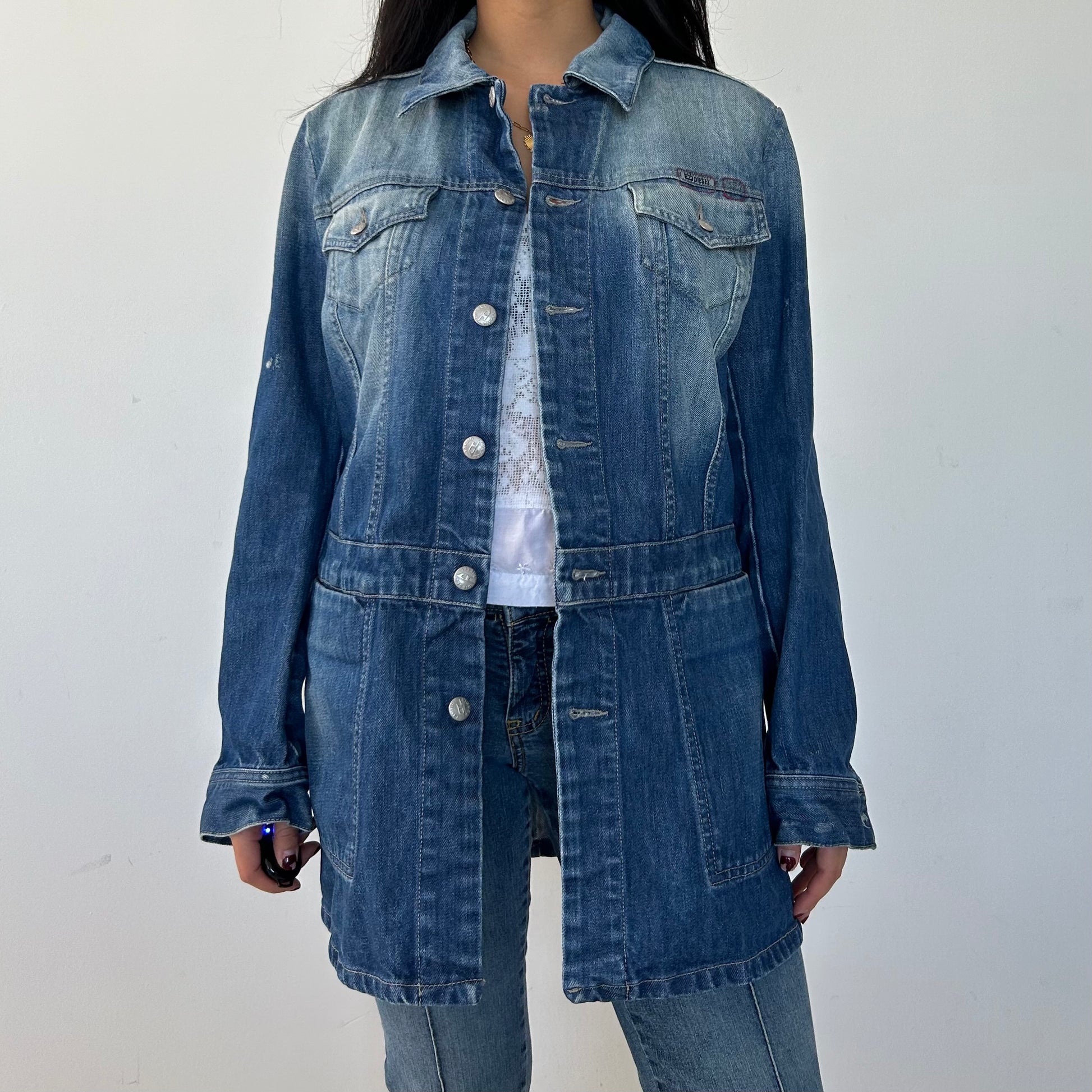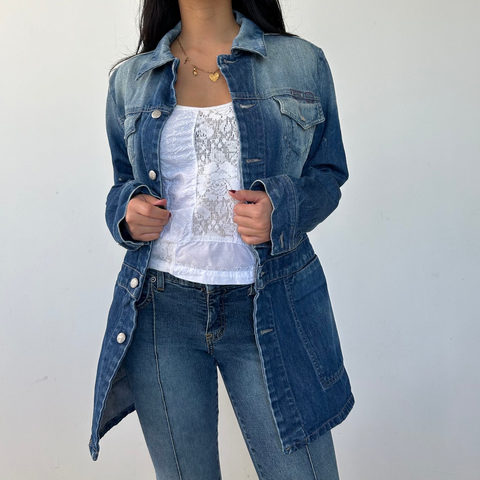 - Details: Medium wash denim jacket with faded effect; point collar, button closure, and dual chest flap pockets; waist seam detailing and vertical stitching for a structured fit; extended length