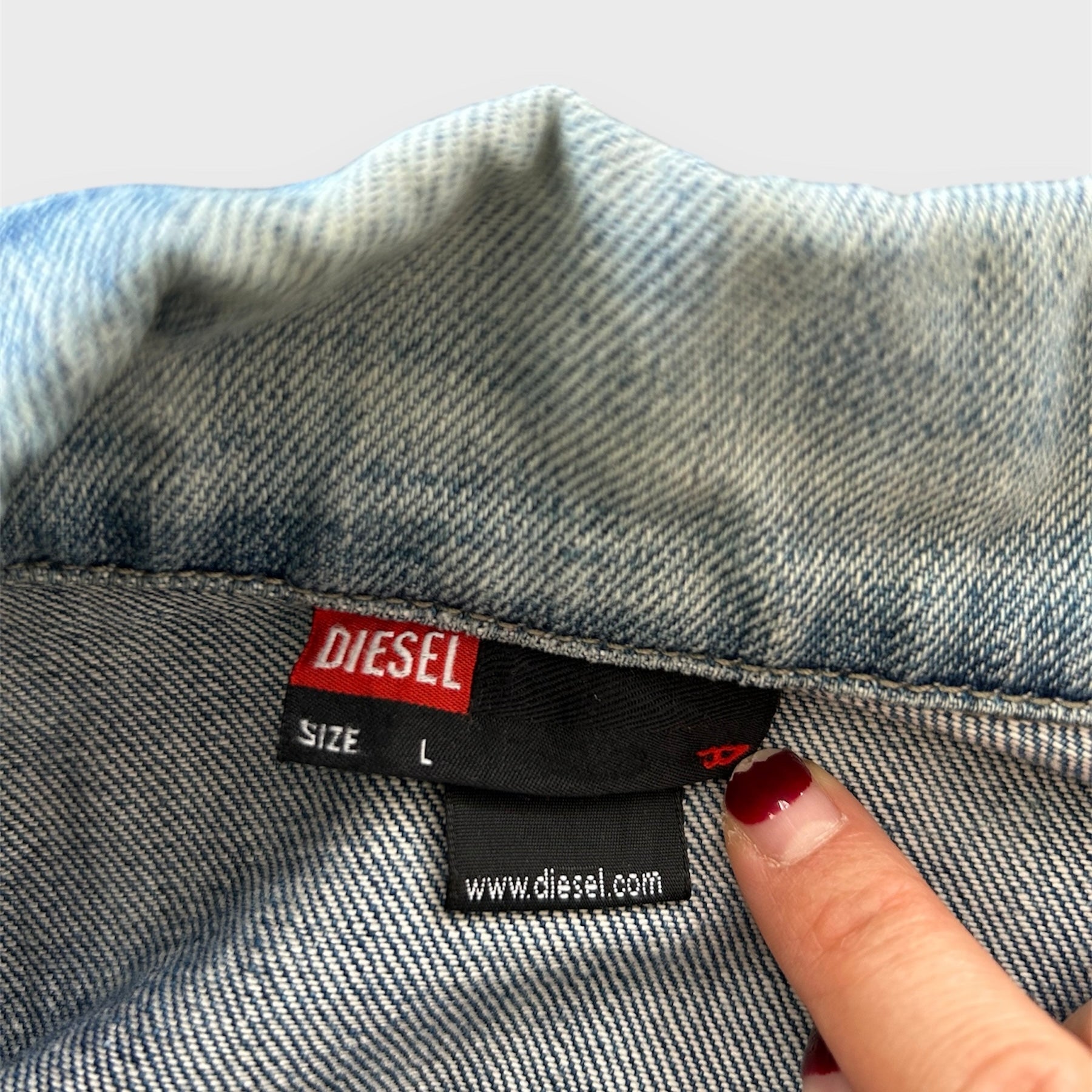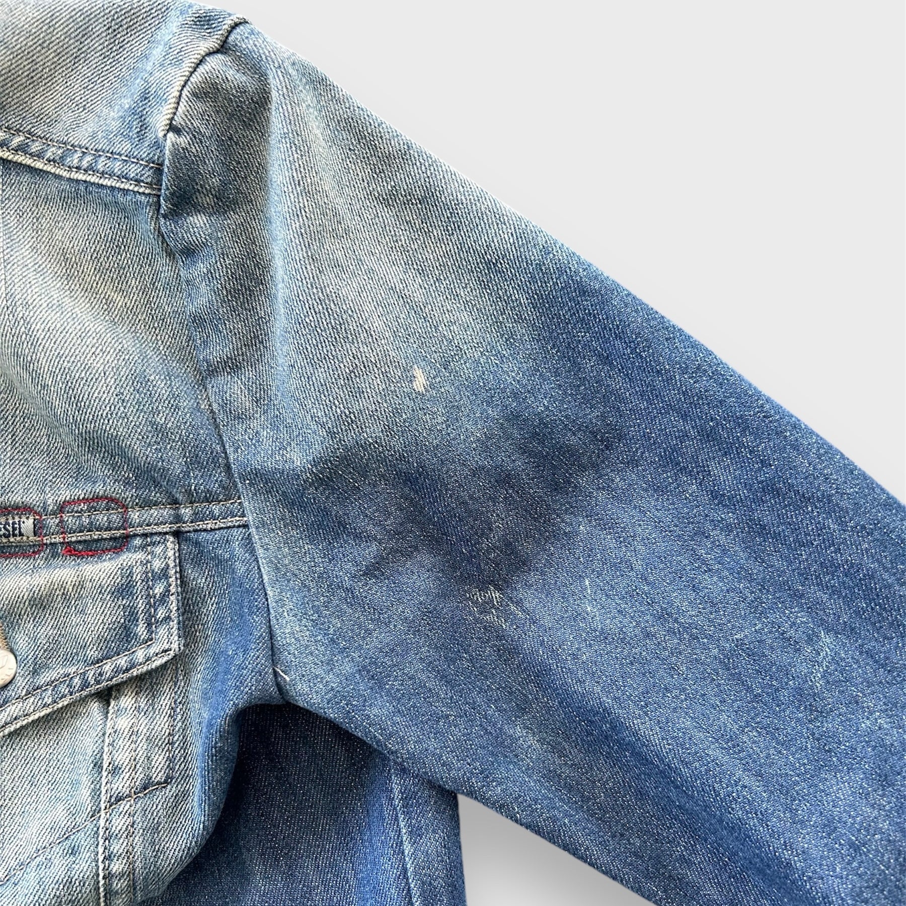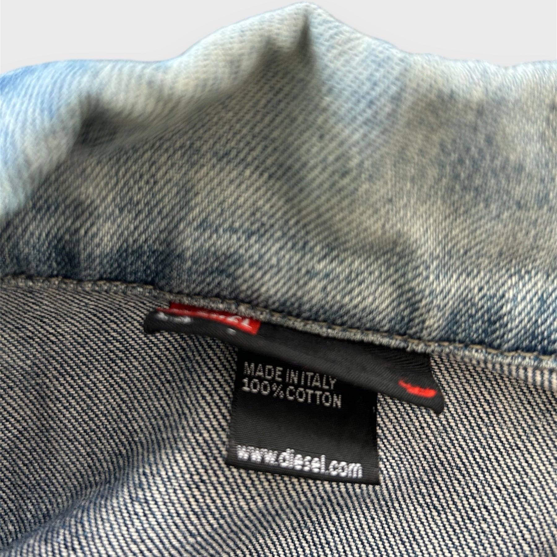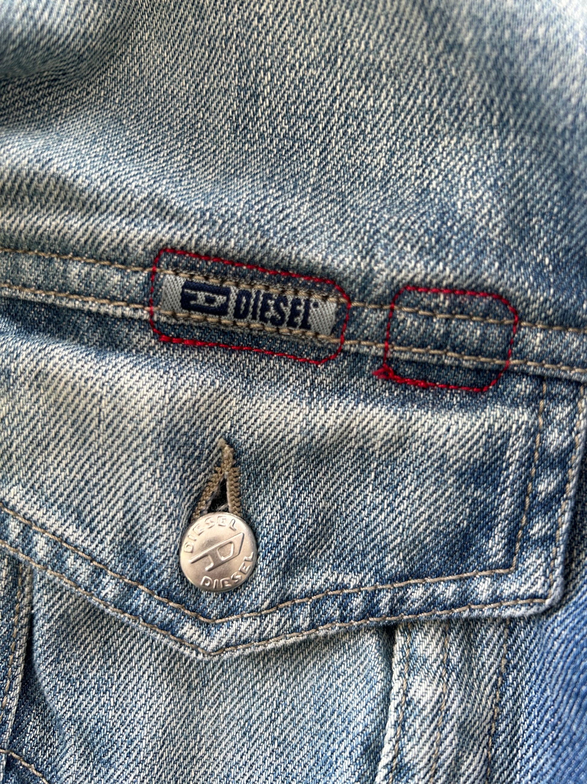 - Details: Medium wash denim jacket with faded effect; point collar, button closure, and dual chest flap pockets; waist seam detailing and vertical stitching for a structured fit; extended length