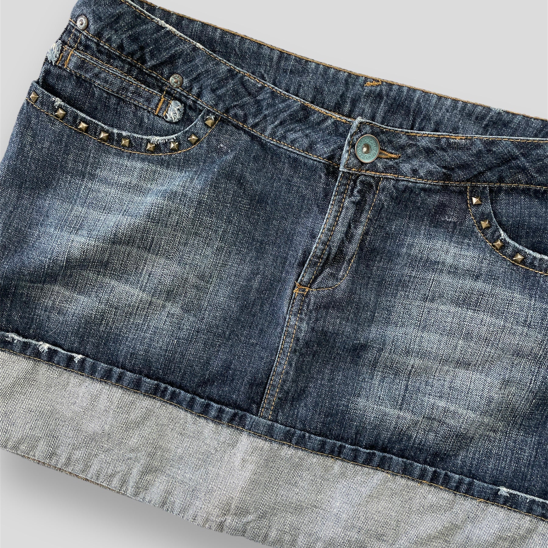 - Details: From the early 2000s; five-pocket design; concealed zip fly; dark wash with light distressed detailing; turn-up cuff hem; stud details