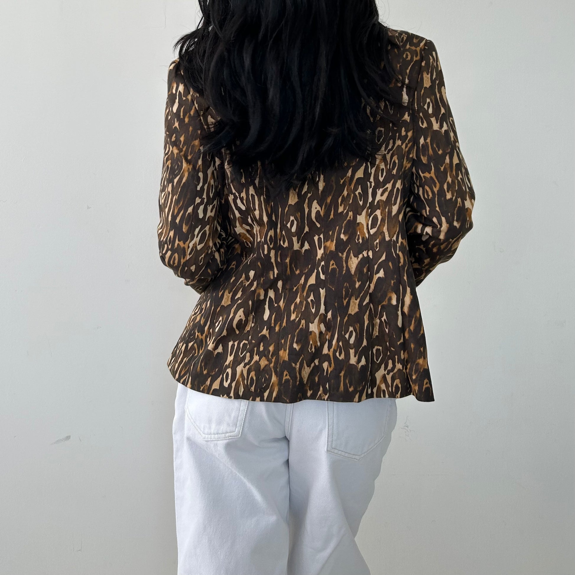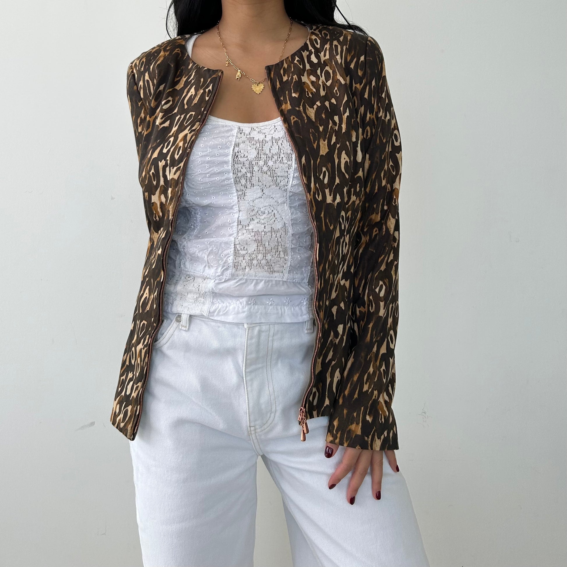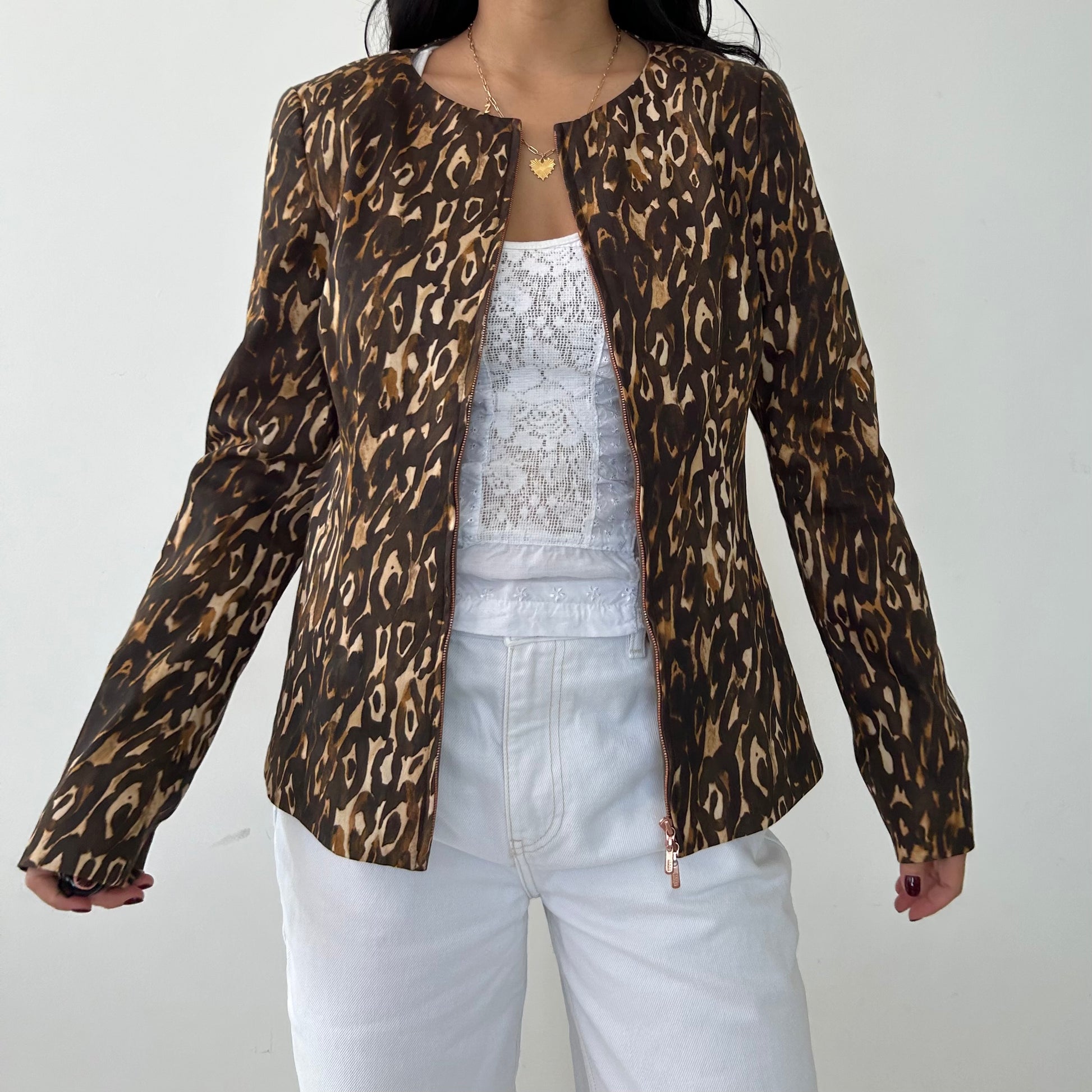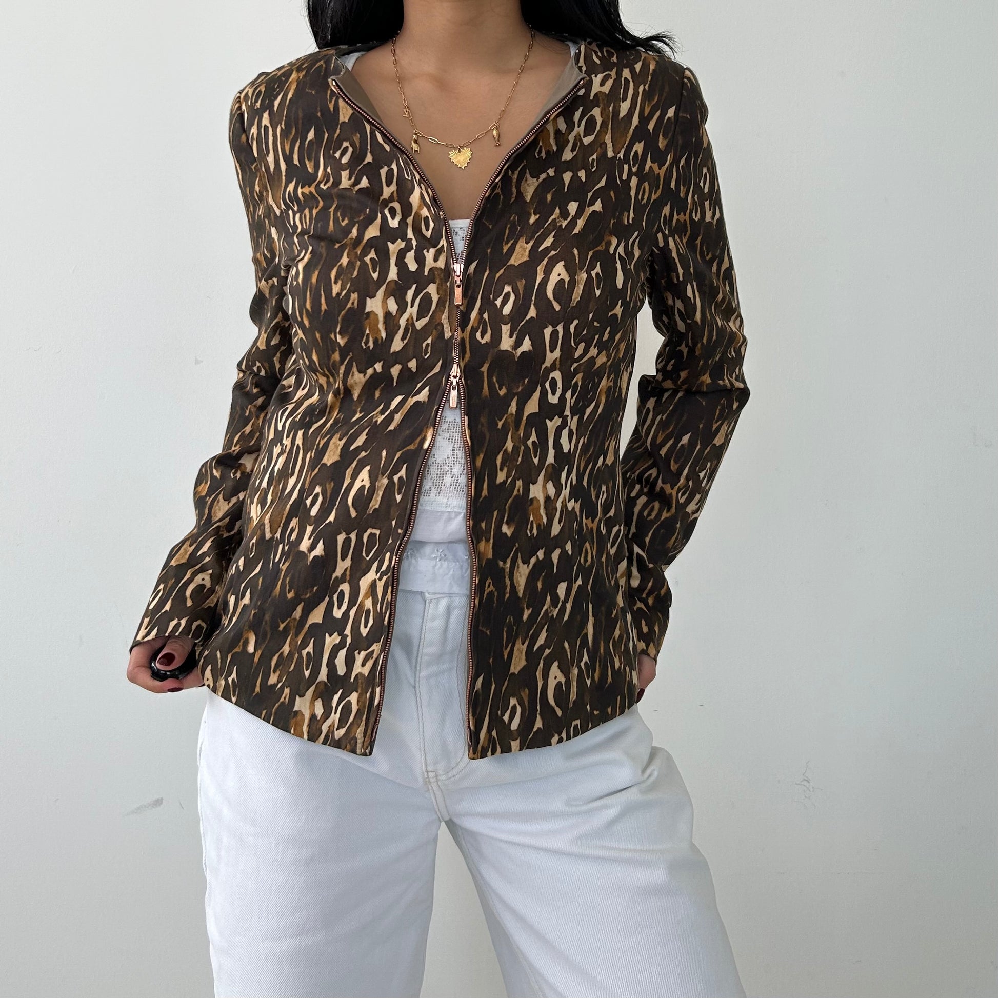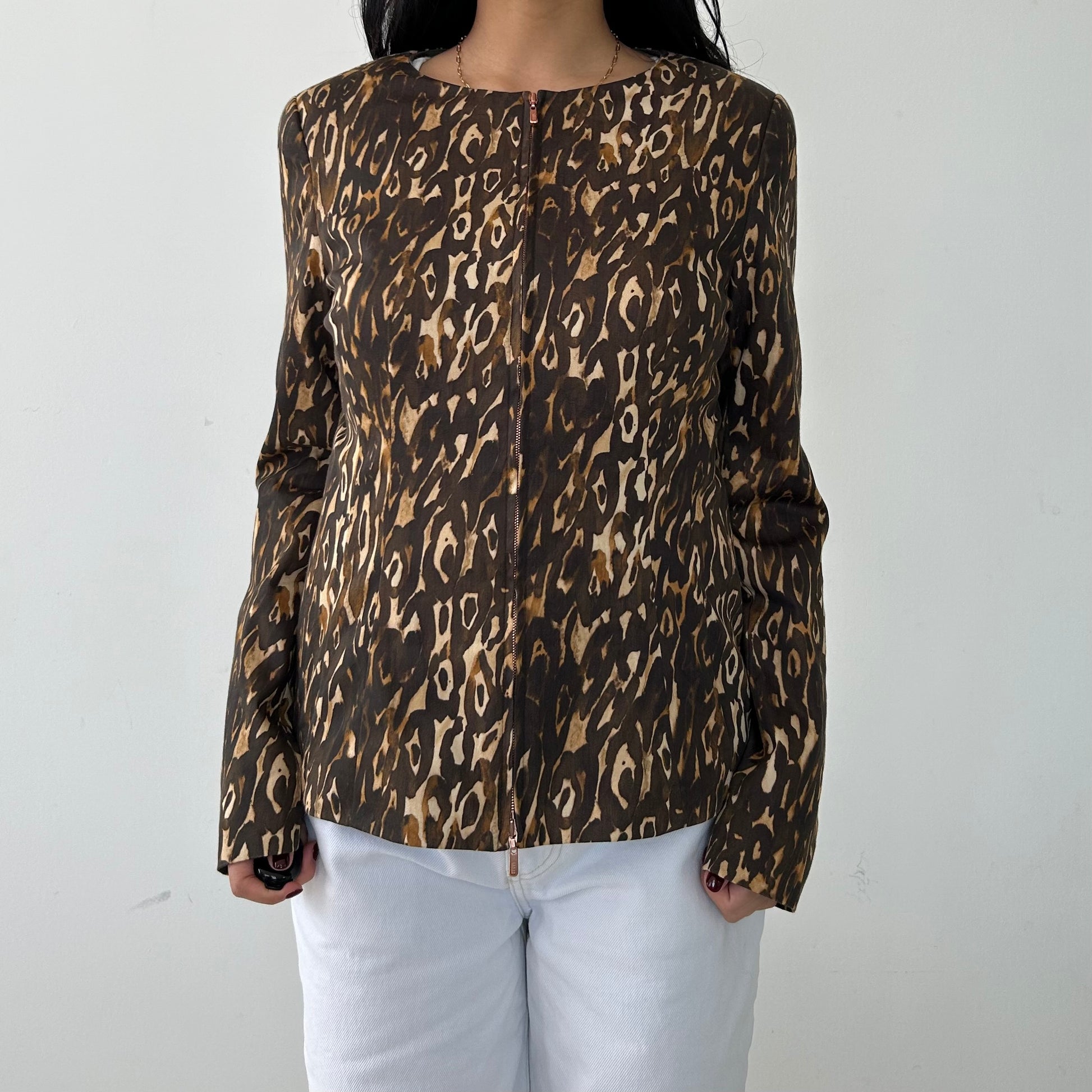 Details: Long sleeve double zip evening jacket; brown leopard print; round neck; shoulder pads