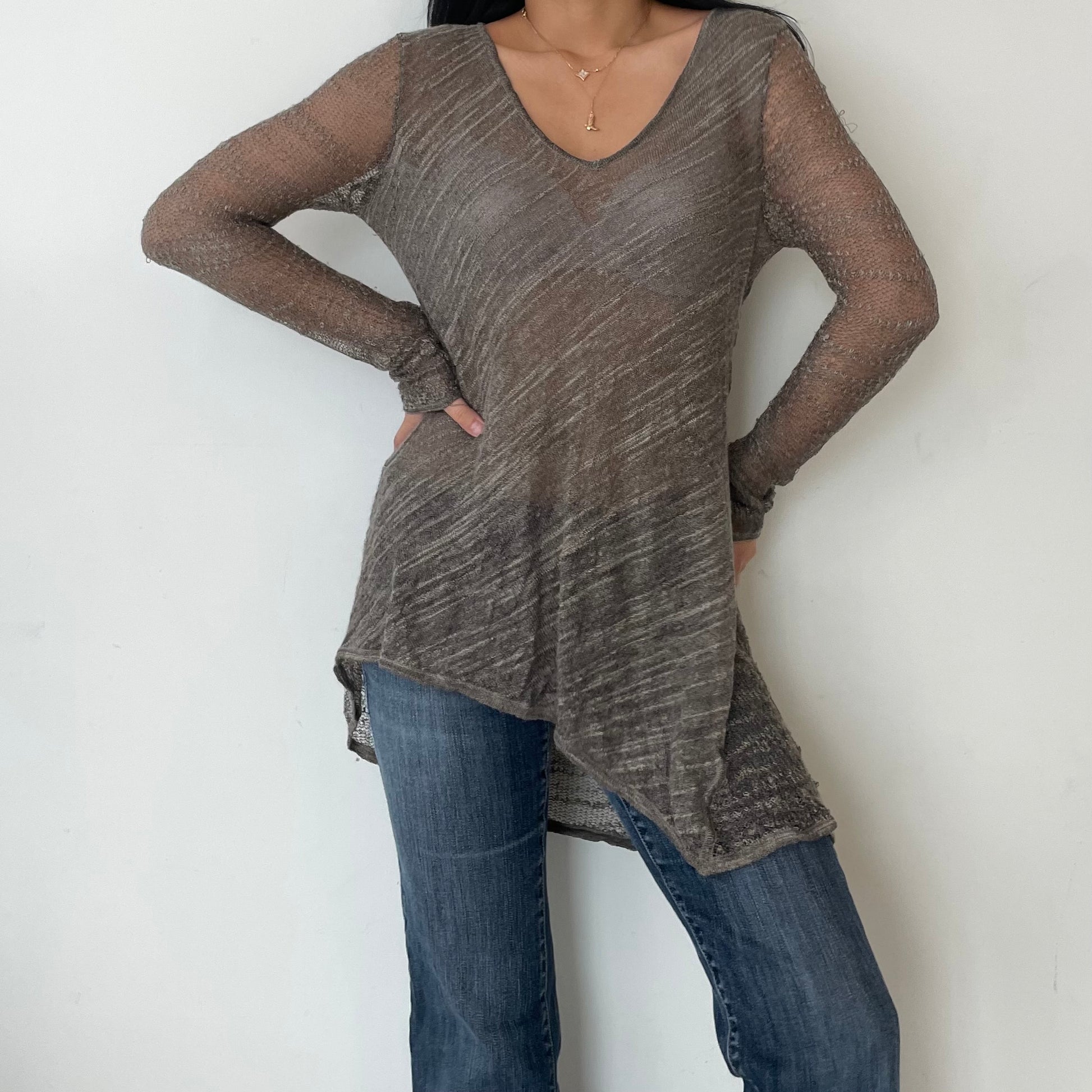 - Details: Grey lightweight sweater; long sleeves; v-neck; asymmetrical hem; super soft delicate knit material; semi sheer