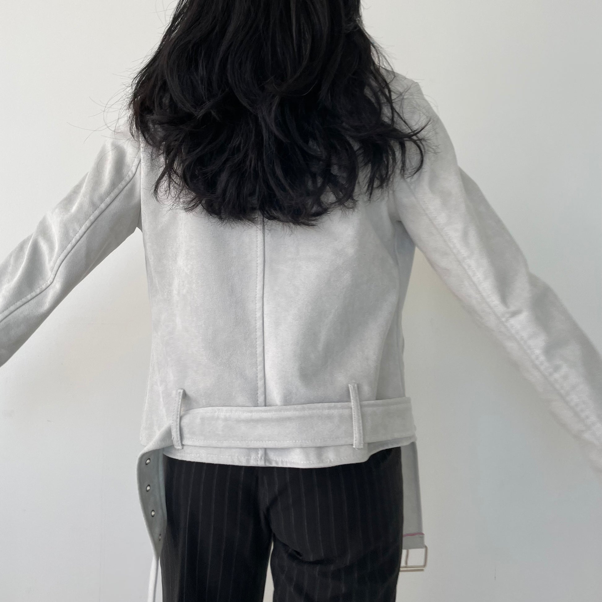 - Details: Light grey moto jacket; faux suede texture front asymmetrical zipper with snap button closure; front zippered pockets; belted waist