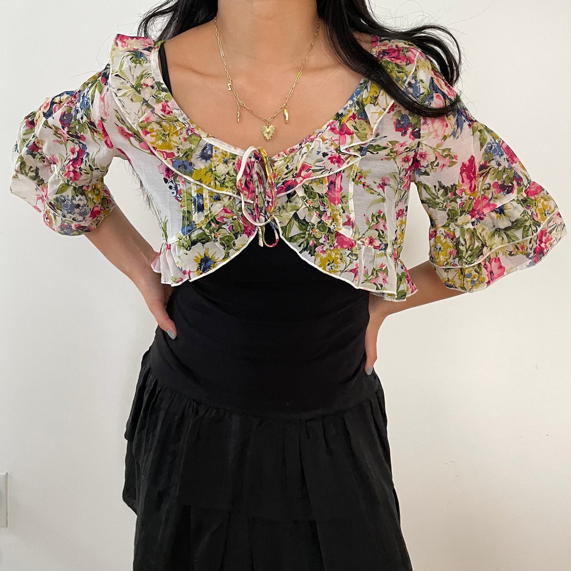 - Details: Three-quarter sleeves; cropped tie-front shawl