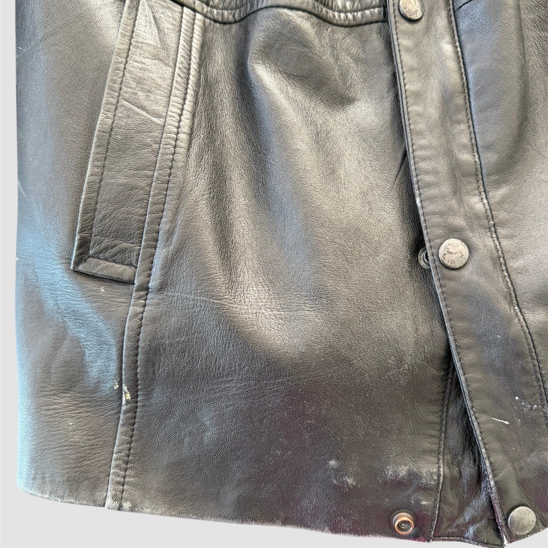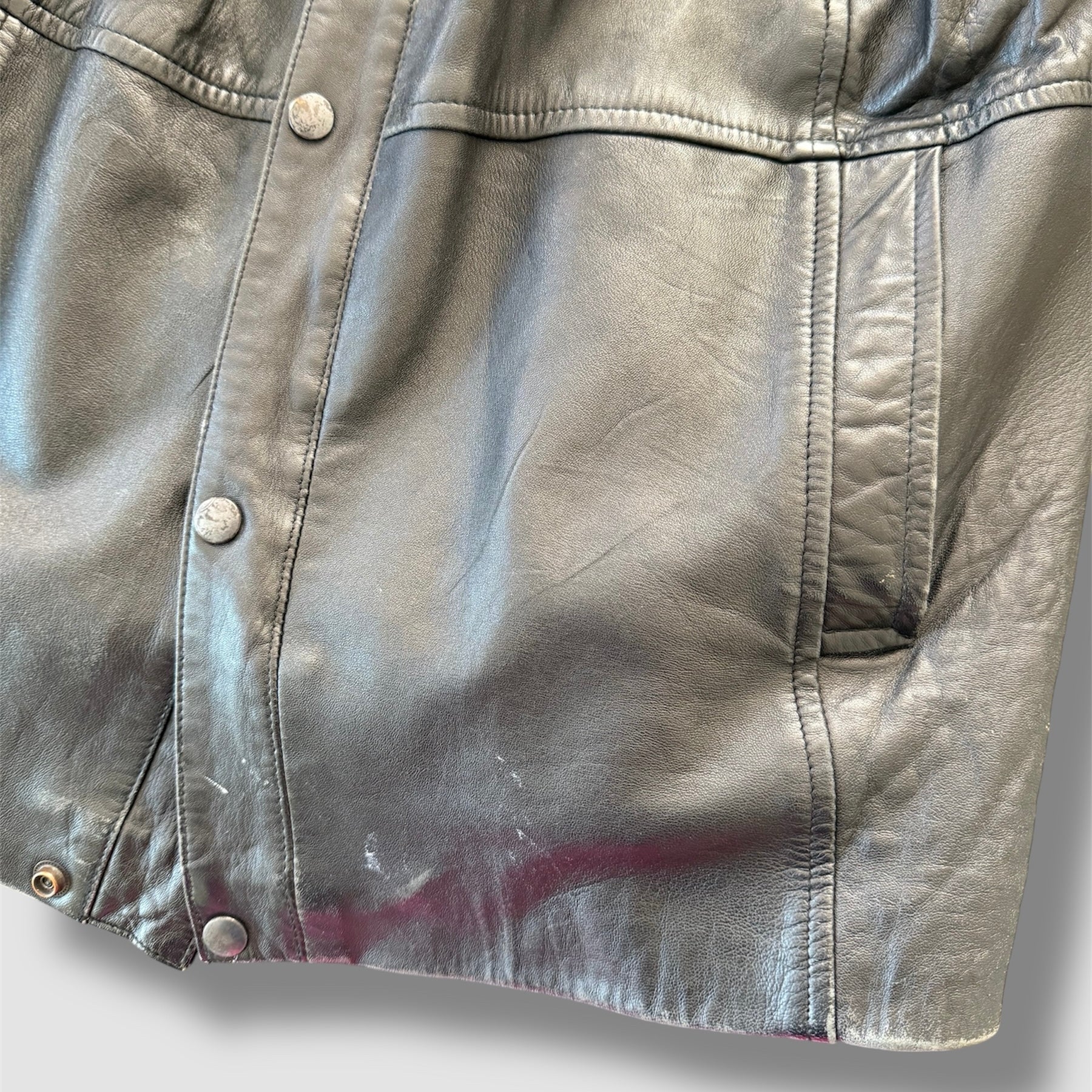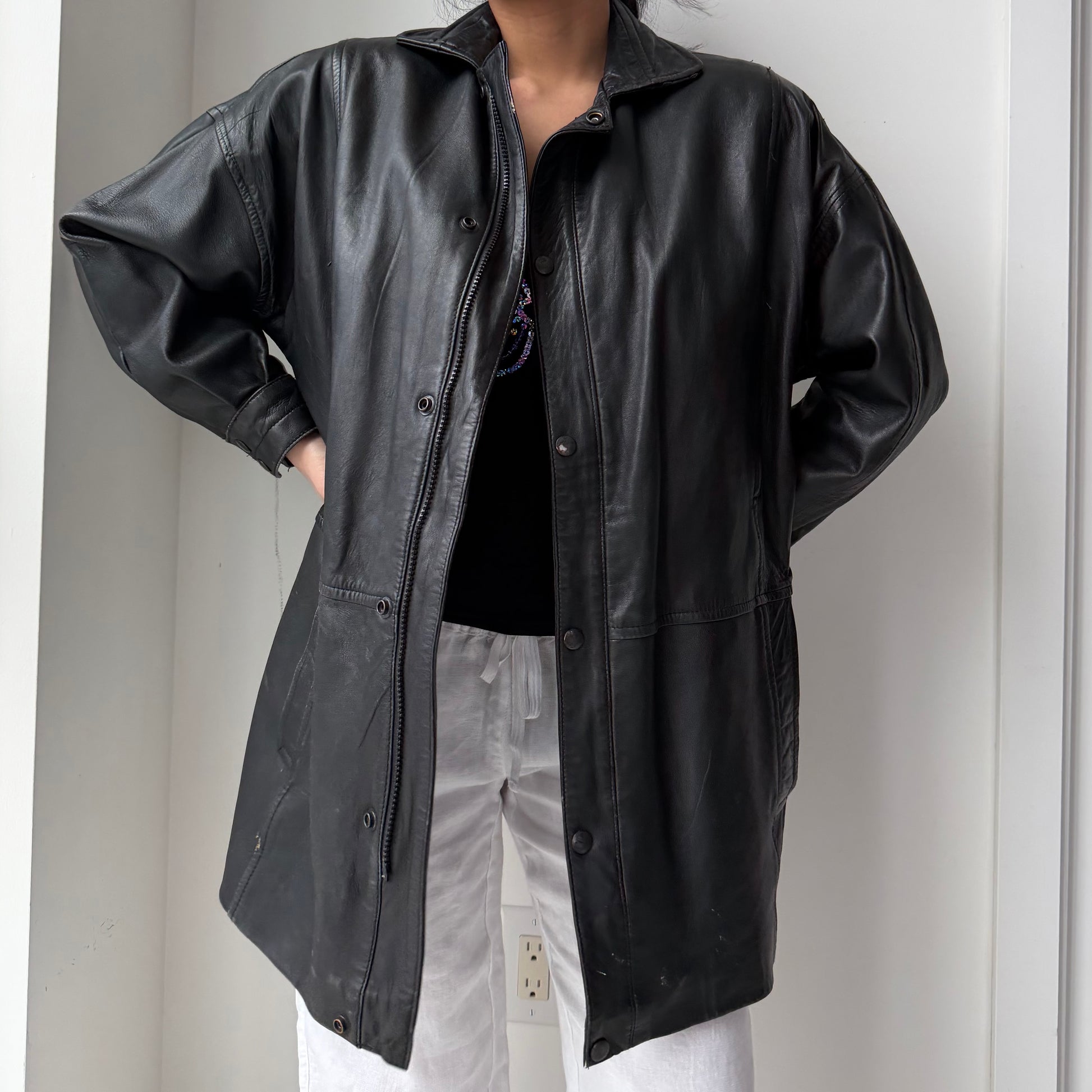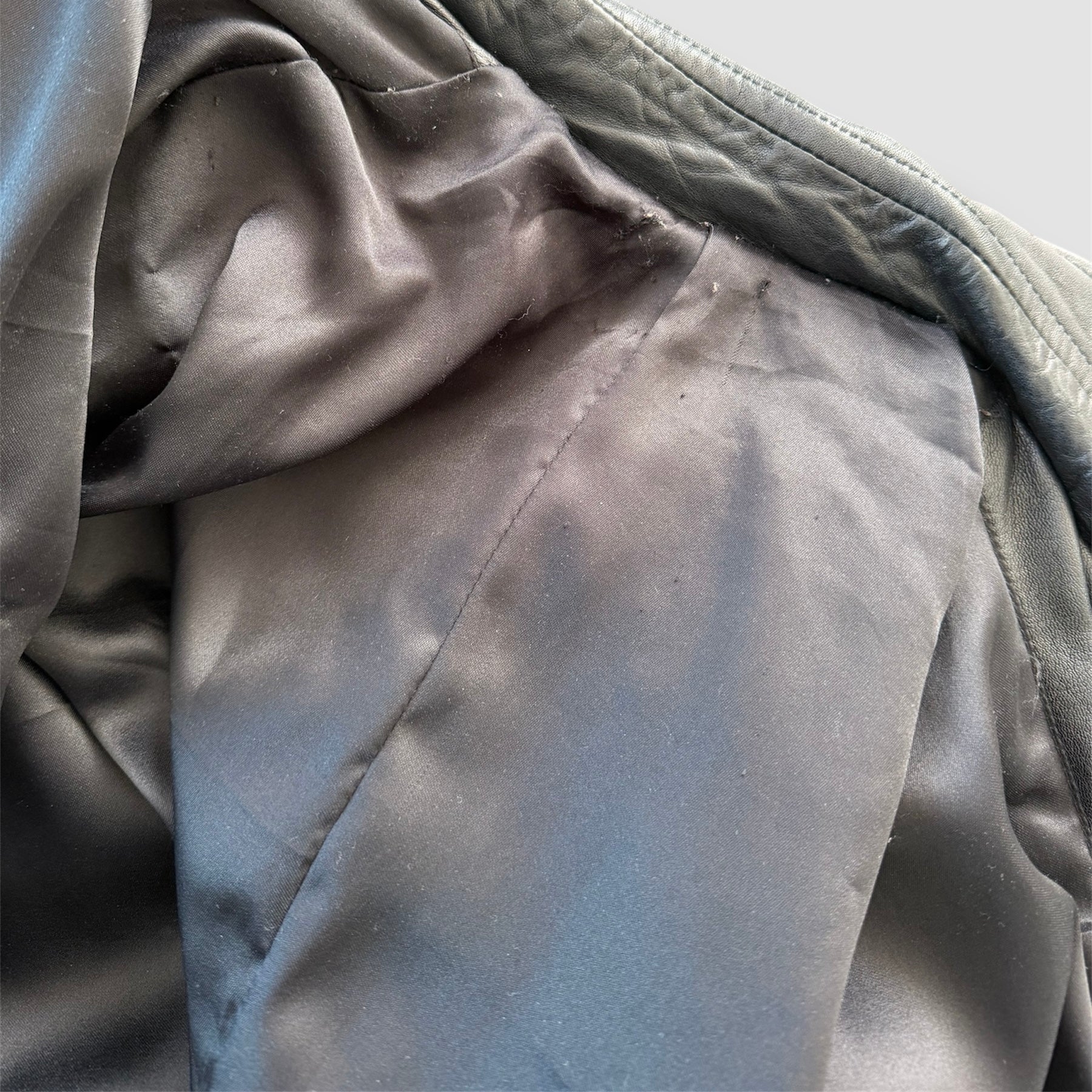 - Details: Black leather jacket with stand collar; dual zip and snap button closure; welt pockets and long sleeves with button cuffs; shoulder pads; relaxed oversized fit.
